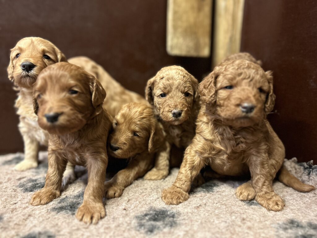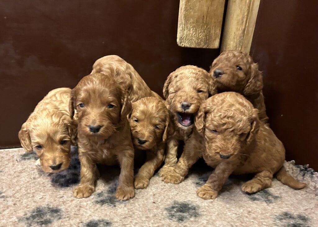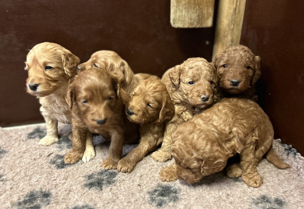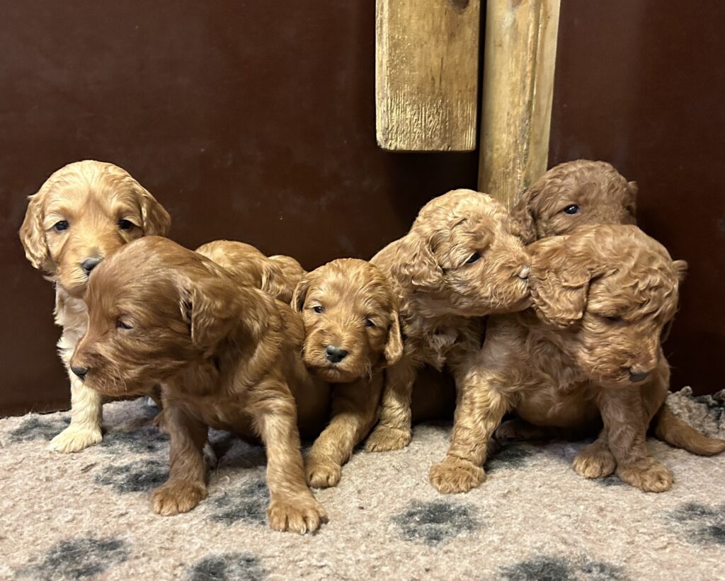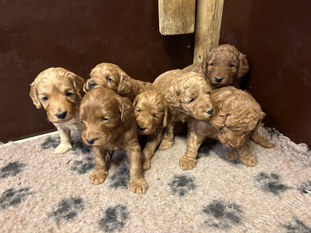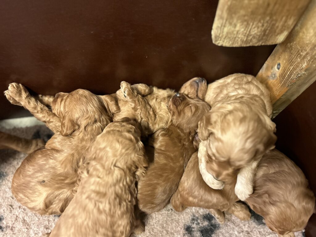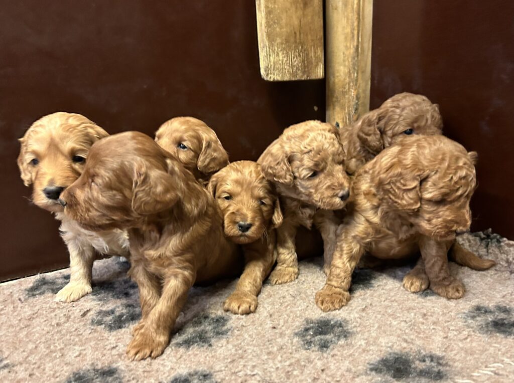 Vores mini/mellem Goldendoodle F1 Amy og vores mini/mellem Doodledoodle Jordy, har fået 7 hvalpe sammen.