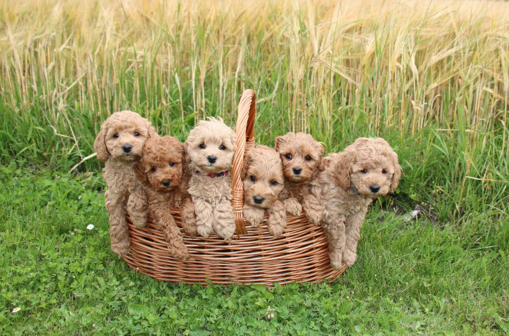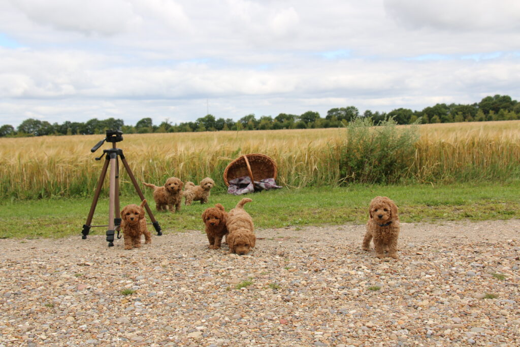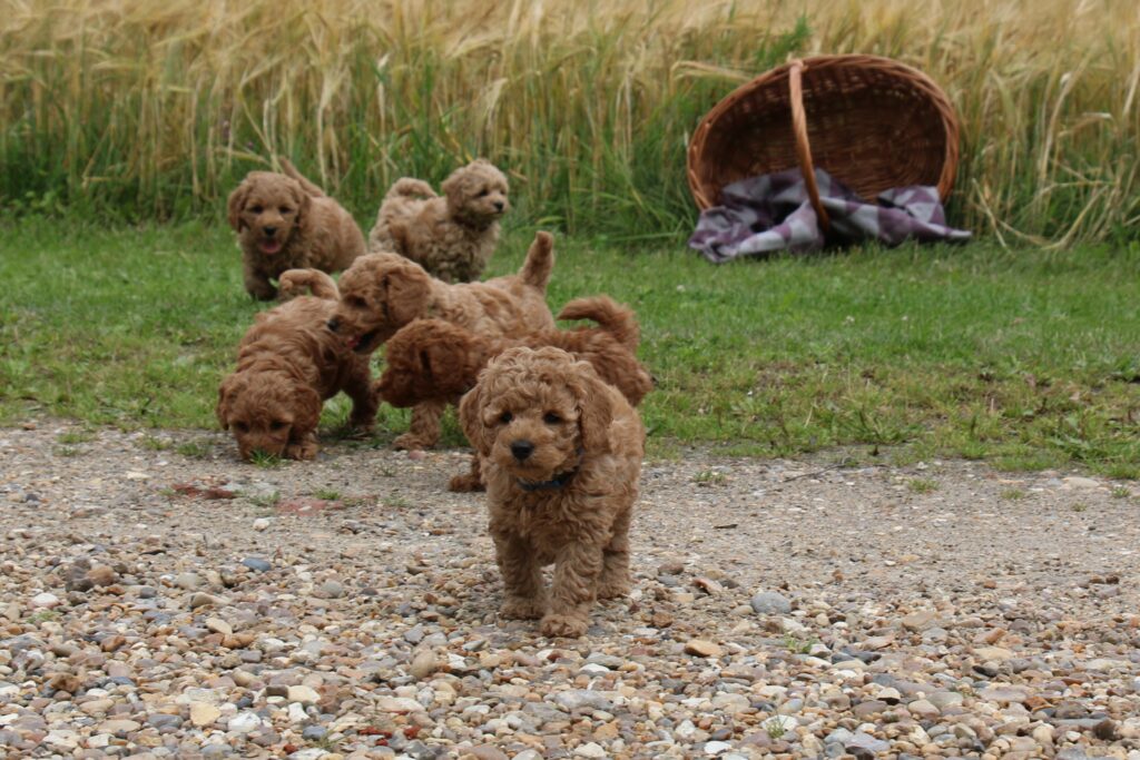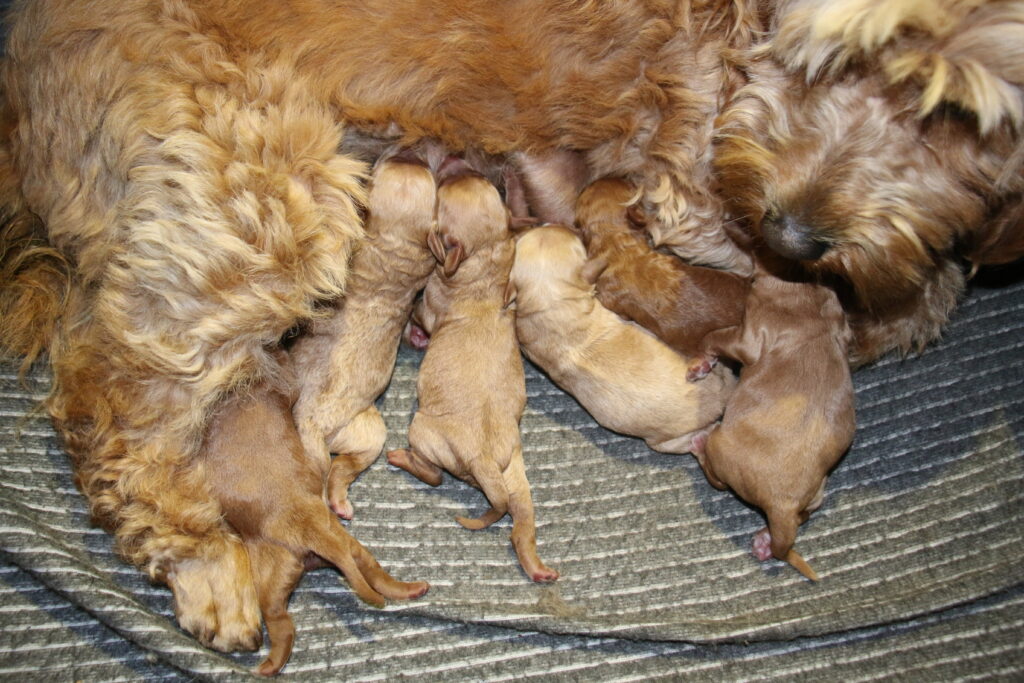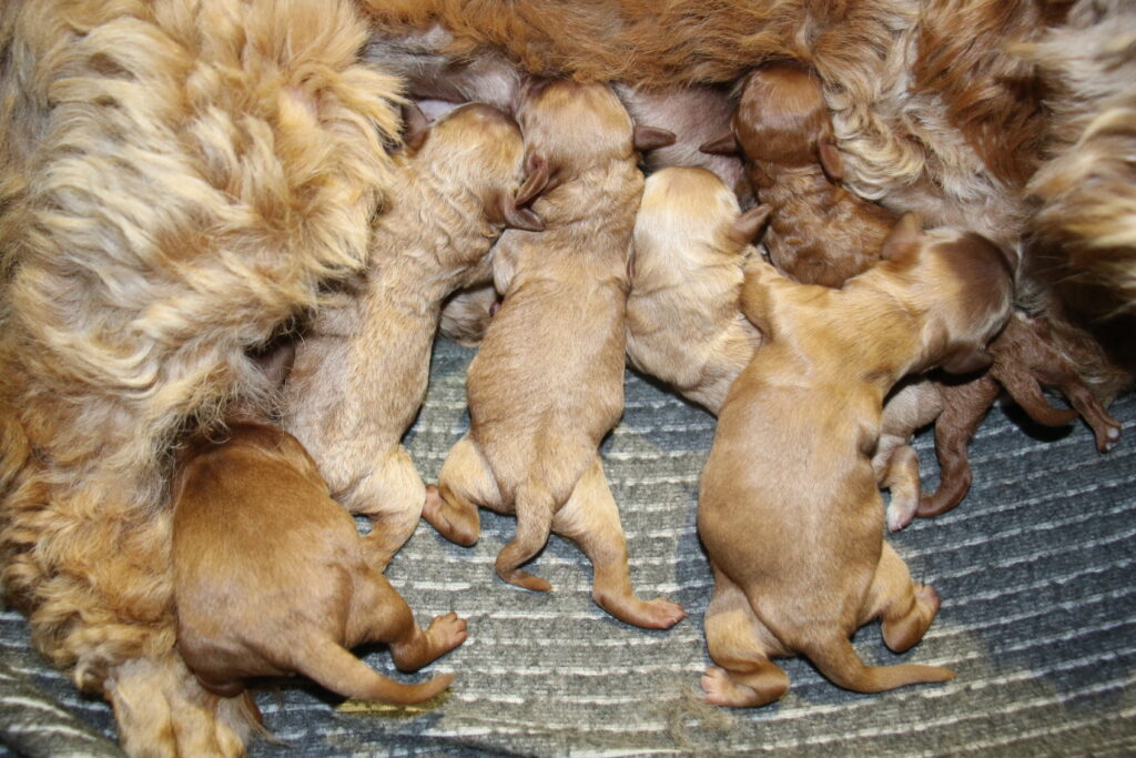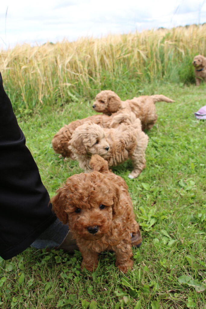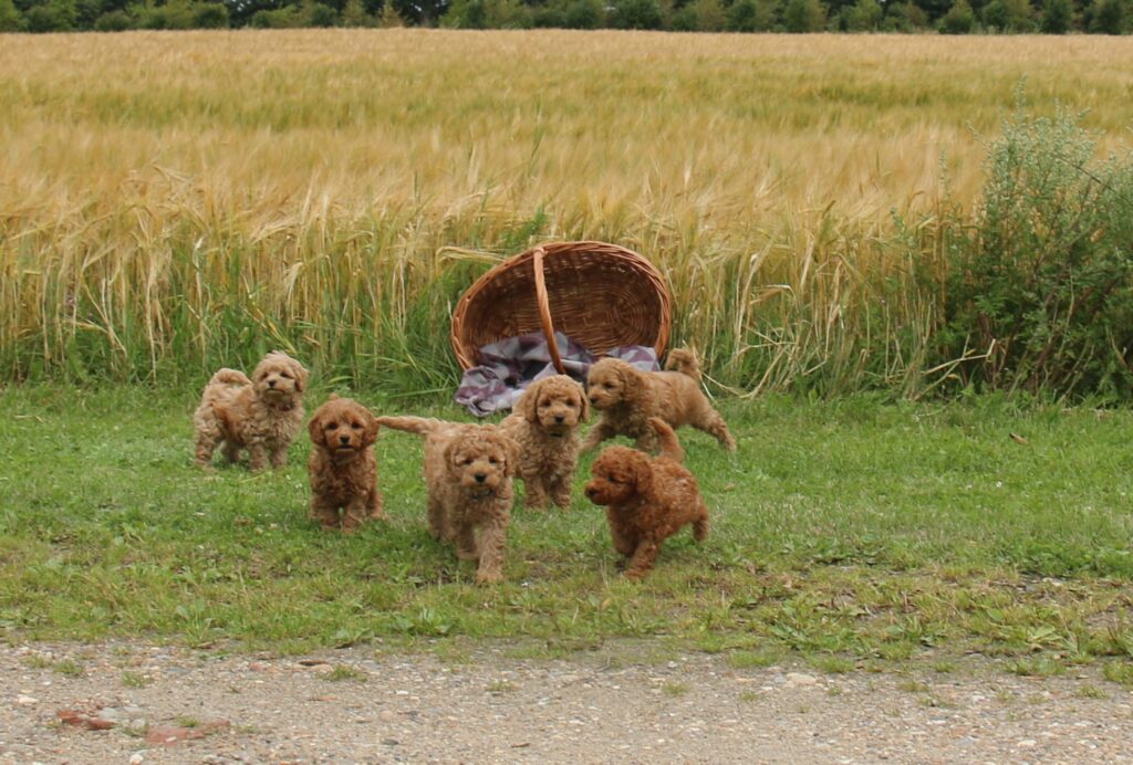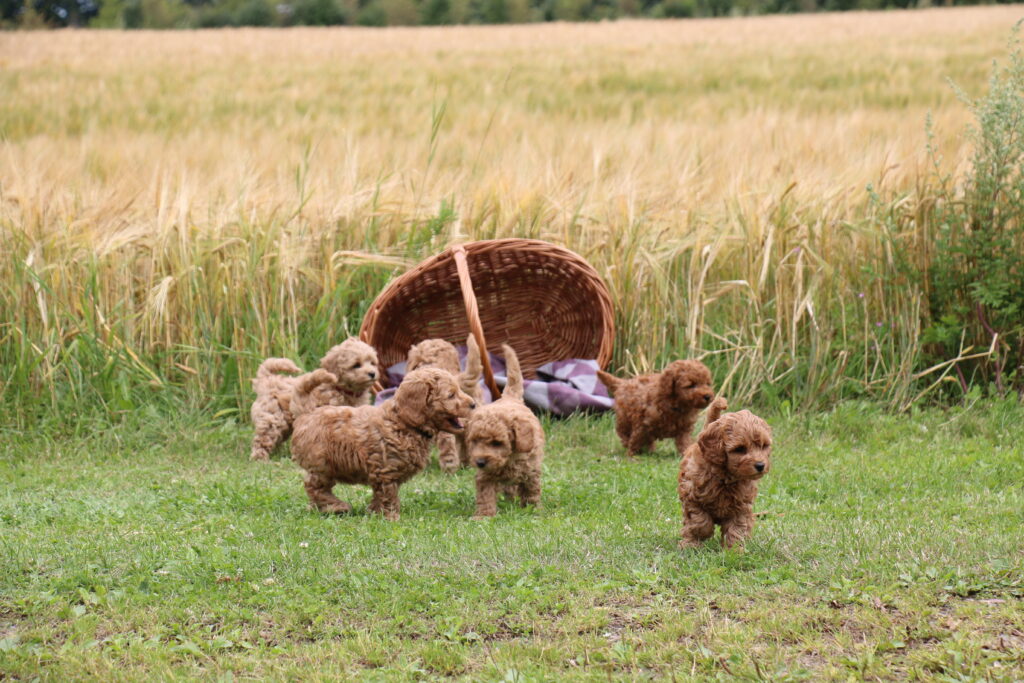 Vores mini/mellem Goldendoodle F1 Chili har fået 6 hvalpe med vores lille Cavapoo F1 Soul.