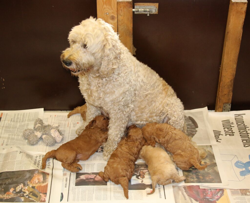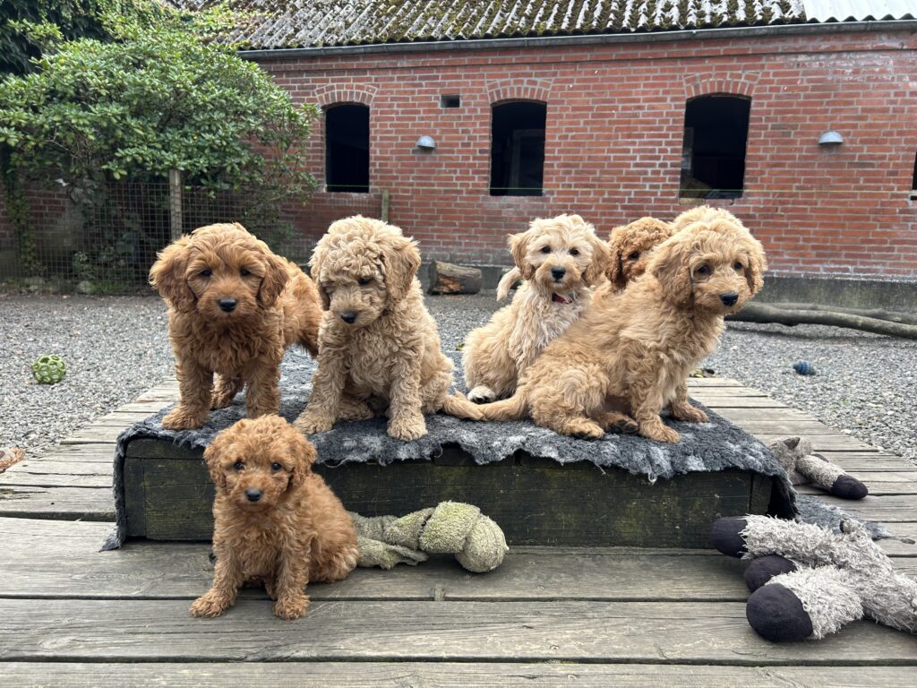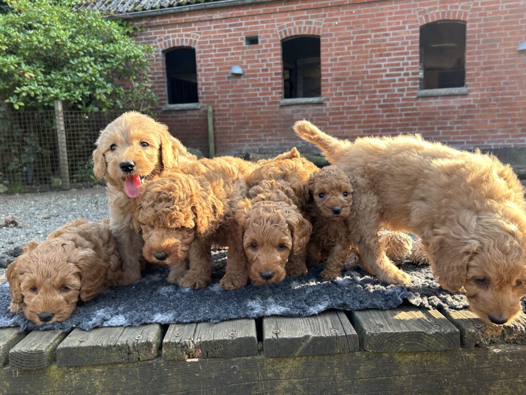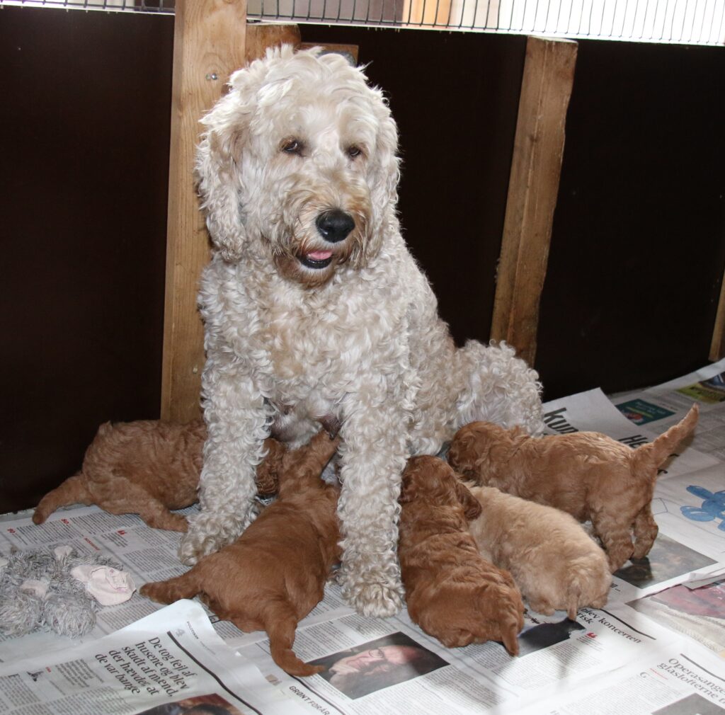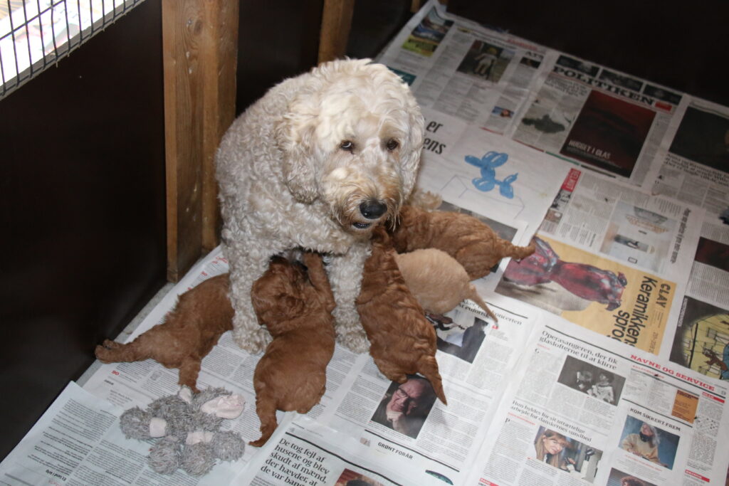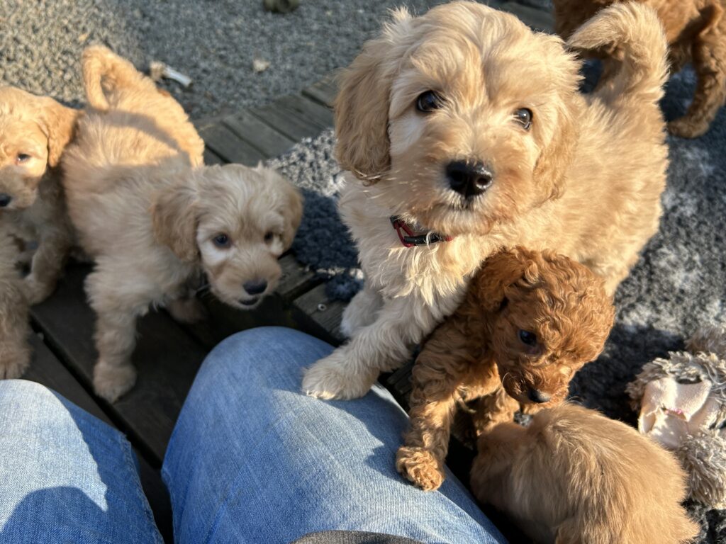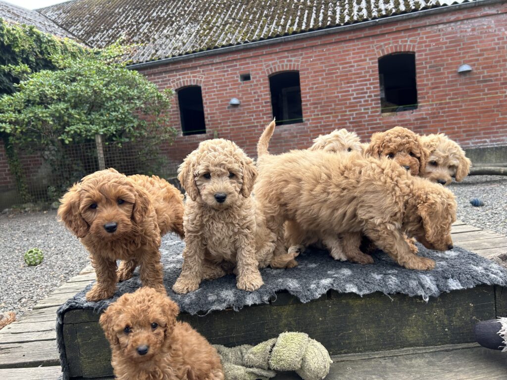 Vores mellem Goldendoodle har fået hvalpe med vores lille Cavapoo Soul.
