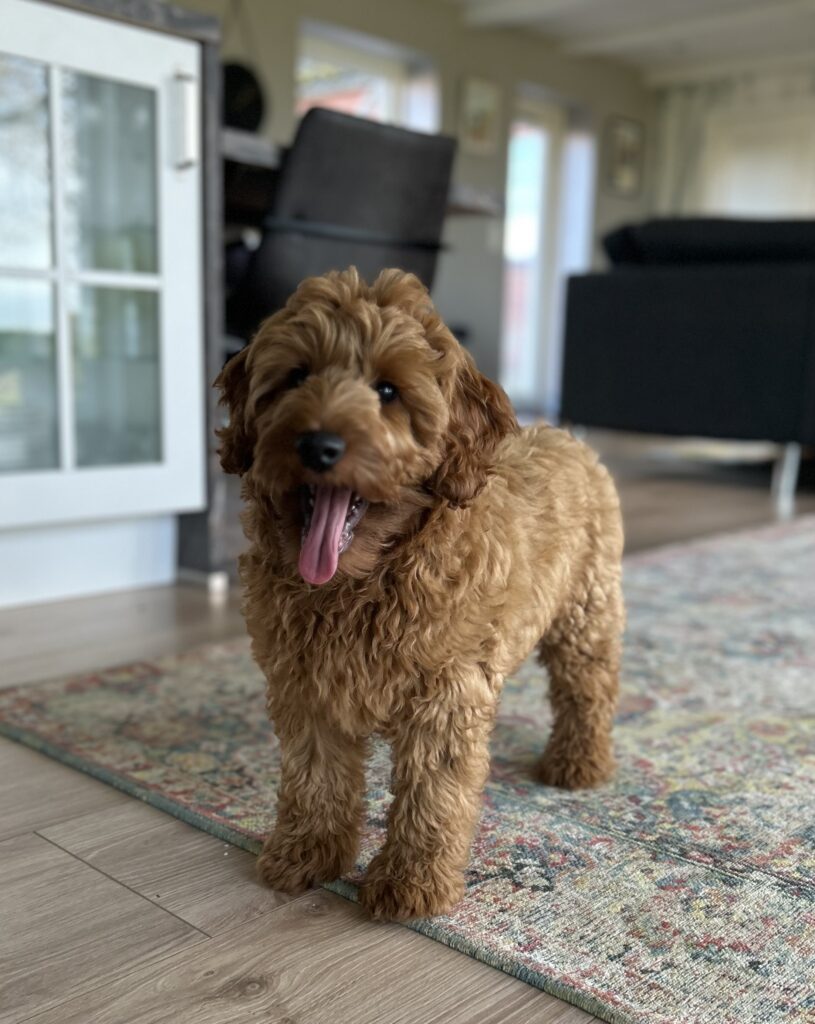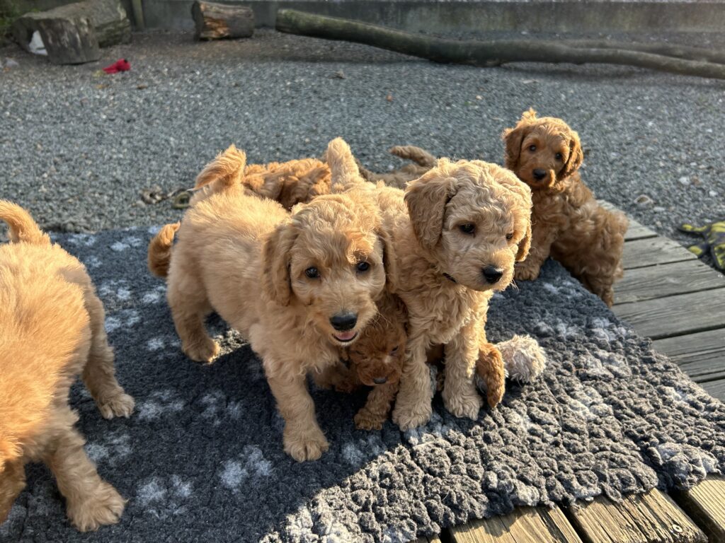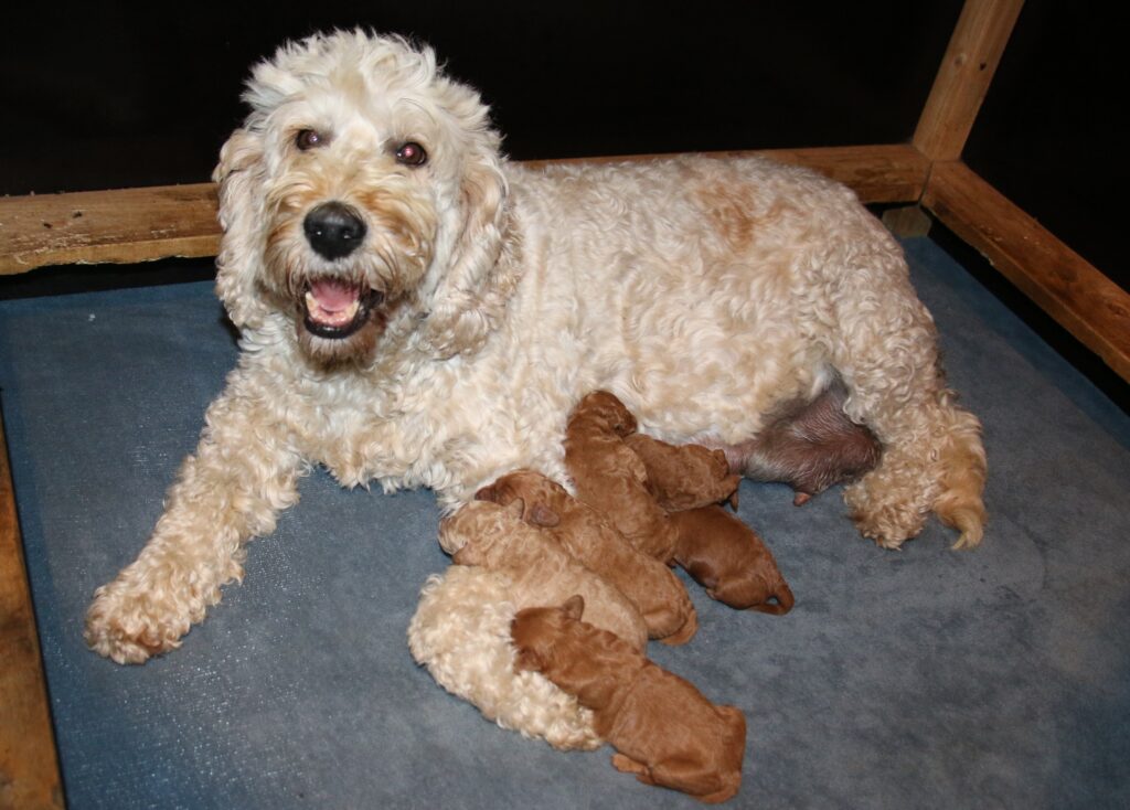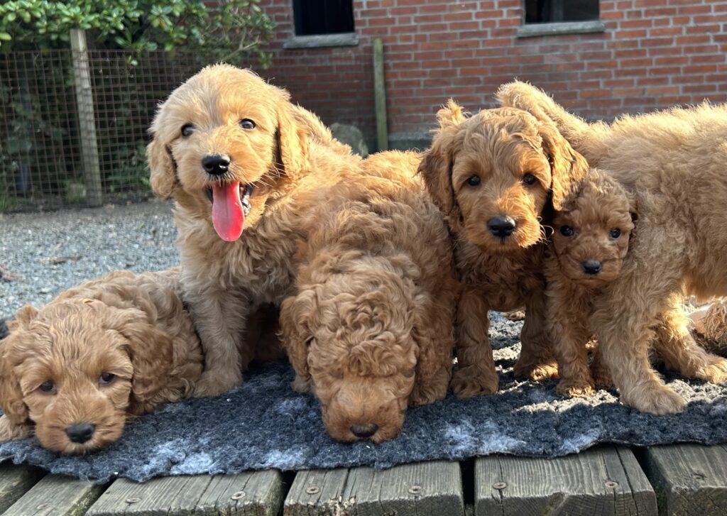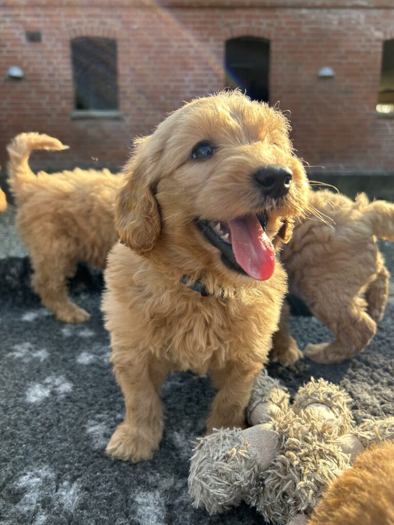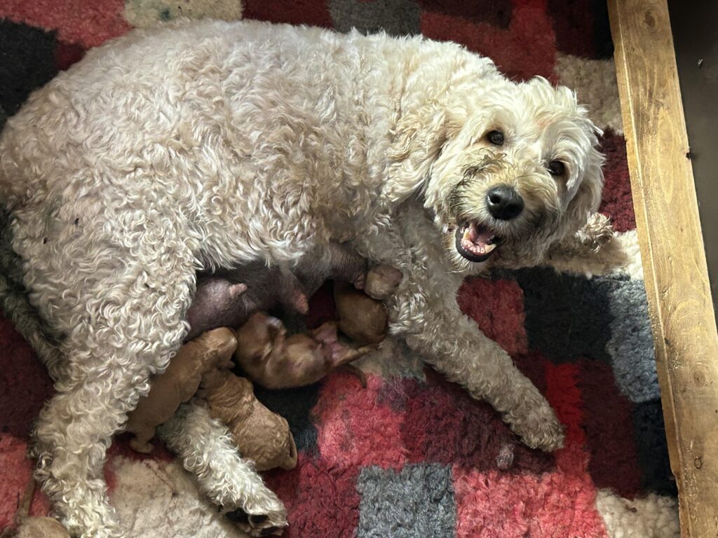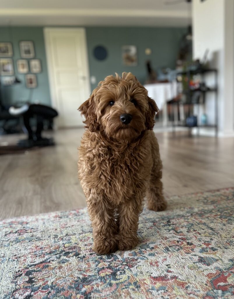 Vores mellem Goldendoodle har fået hvalpe med vores lille Cavapoo Soul.