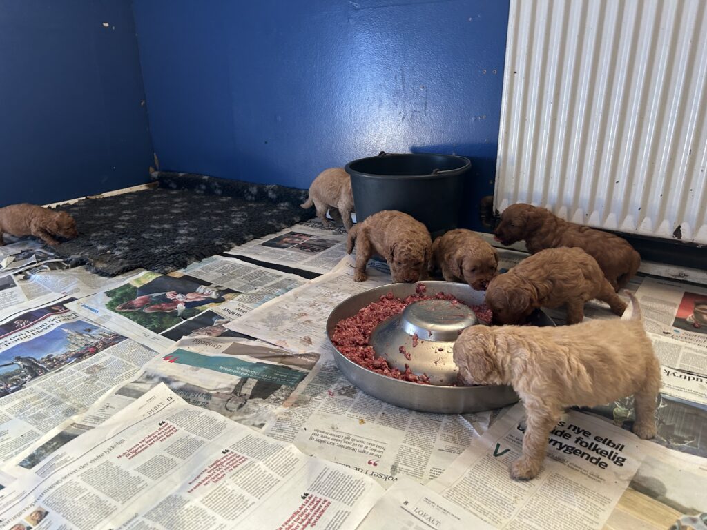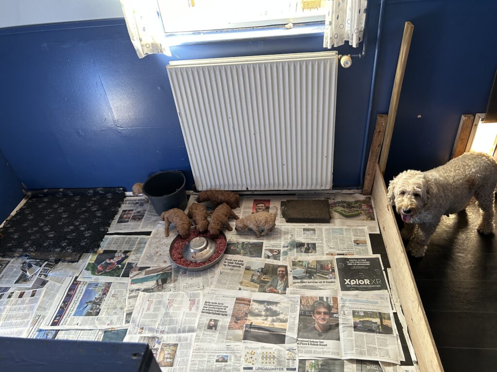 Så har vi flytte hvalpene ind i et nyt rum “hvalperummet”, for de er blevet 4 uger og 2 dage og de begynder nu for alvor at udforske verden. Øjnene funger dog endnu ikke optimalt, så de skal ikke have alt for meget plads, for så fare de bare vild hihi. Men hvalperummet er det ideelle rum for de unge hvalpe at være i, for her er der mest aktivitet i hverdagen. Så bliver de vænnet til div hverdagslyde og aktiviteter.