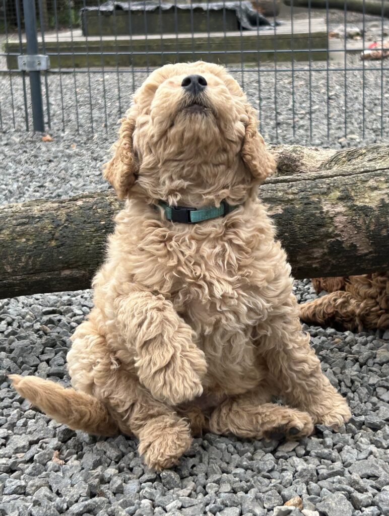 Blå dreng vil så gerne være fysisk med sine mennesker, at han bogstaveligt elsker at gå oven på dem, så er det noget du drømmer om, at blive trådt på af en dejlig hundevaps, så er blå hunden for jer hihi. Nej vi tillader ikke de hopper op, så du må sitte dig ned. Han er generelt meget obs på sine mennesker. Han vi som alle doodler gerne lege og han er en hurtig bamse fanger. Han er almindelig modig som man kan forvente af en lille dreng og han er også nysgerrig, dog uden at det tager overhånd. Han kan godt stresse lidt i nye situationer og skal der hjælpes af dine klogere mennesker.