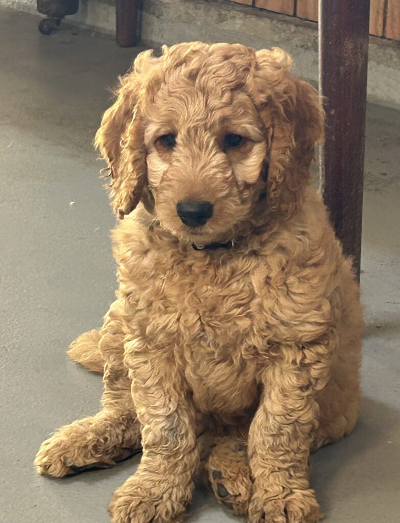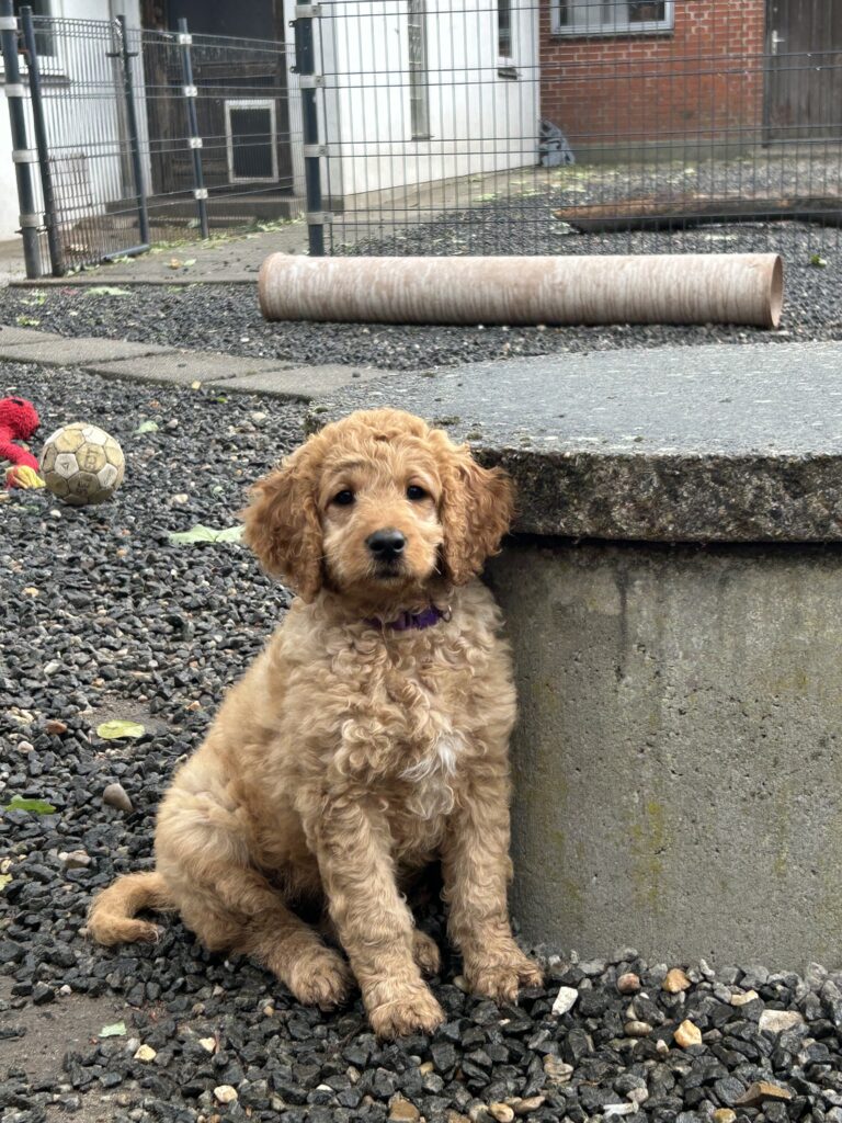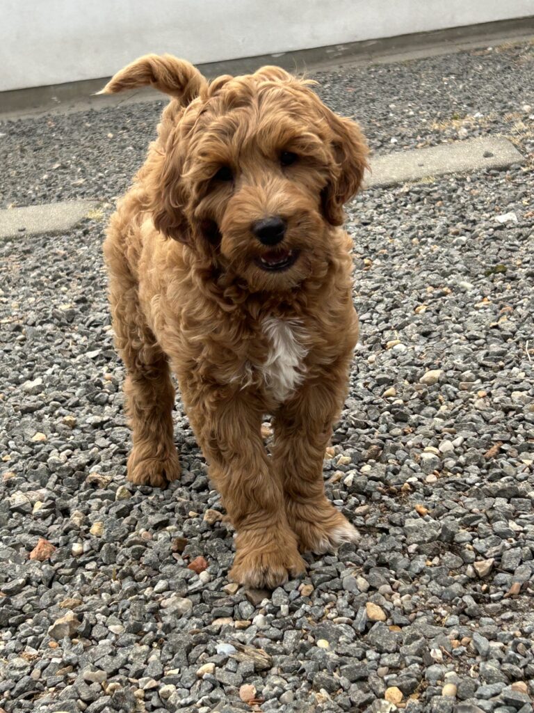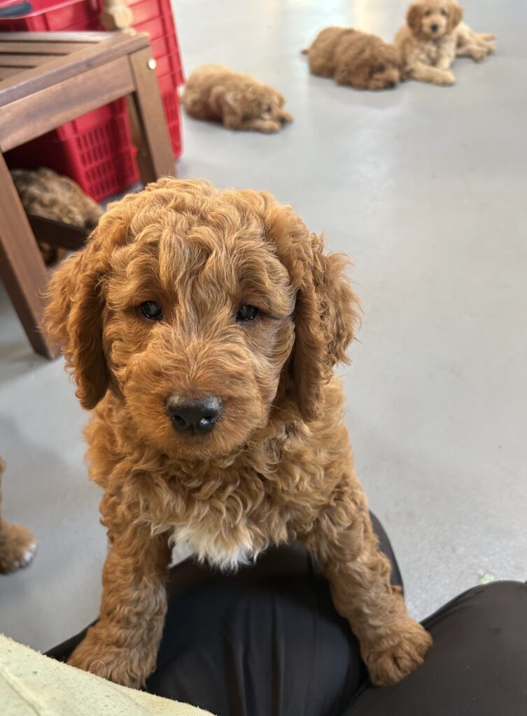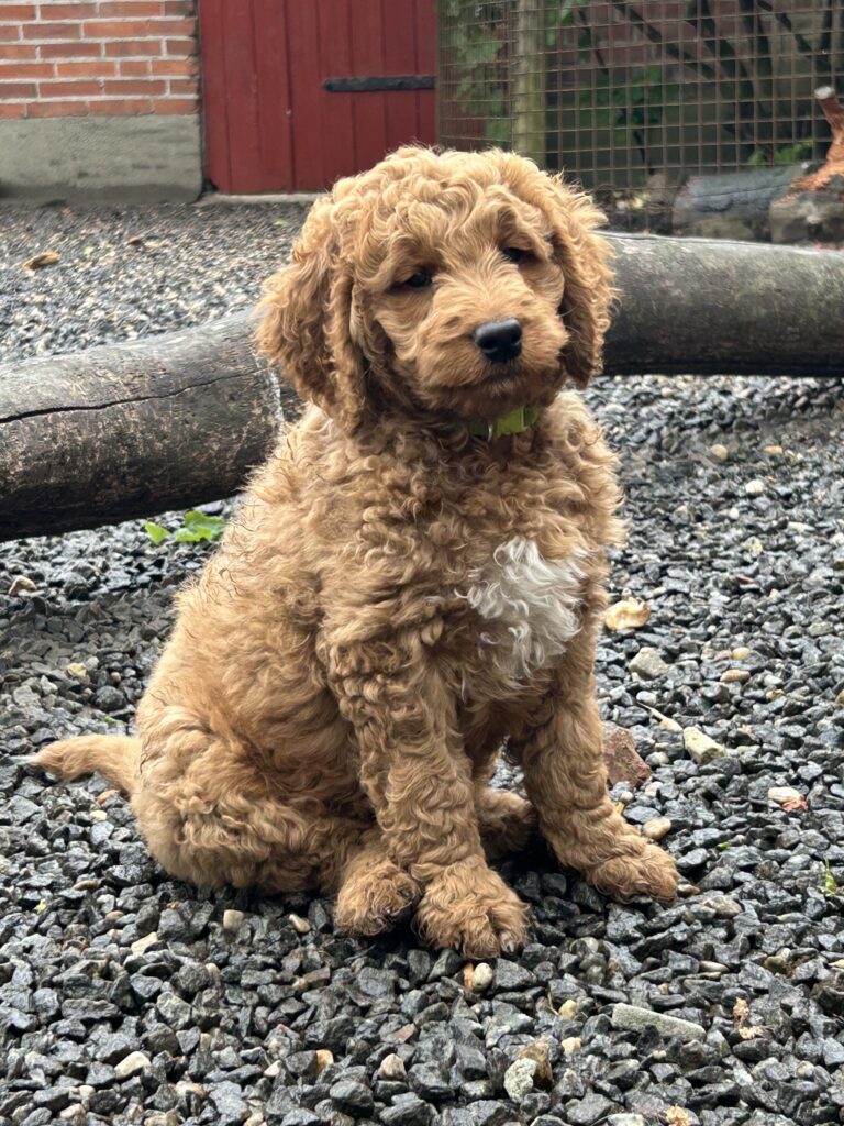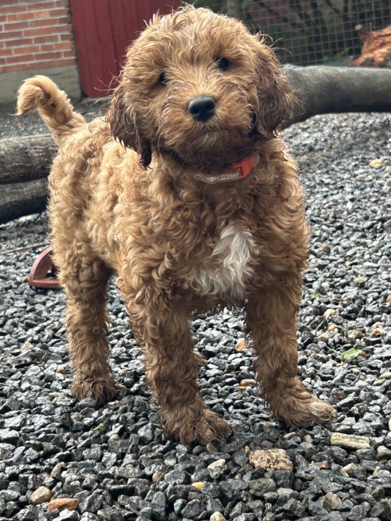En mellem pige, som er dejlig imødekommende, positiv og kærlig pige. Hun er tilpas nysgerrig og legesyg og fræk, med et extra glimt i øjet. Hun er også alm modig som man forventer at en lille hvalp uden livserfaring, så igen en go mellem type. Når vi skriver “Mellem” så er deres psyke ret så tæt på den væsen de fleste af vores doodler har. Vægt den 19.5.2025 4,9 kg, forvente voksen vægt ca 20 kg og 50 cm.