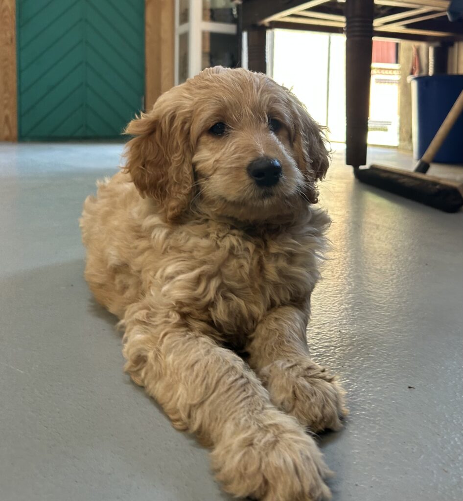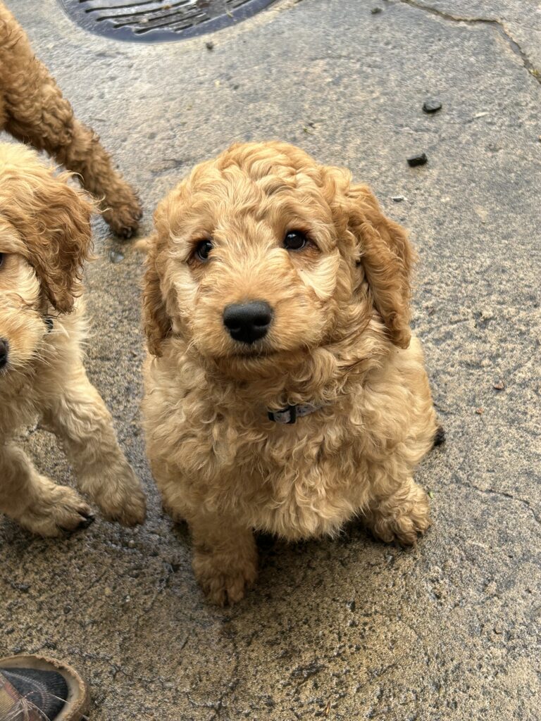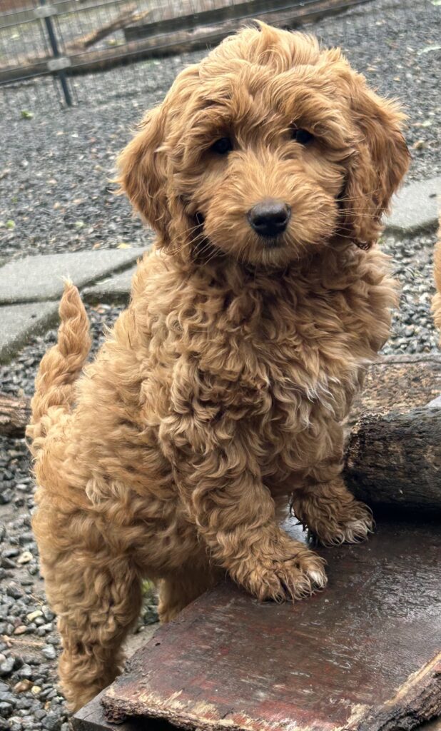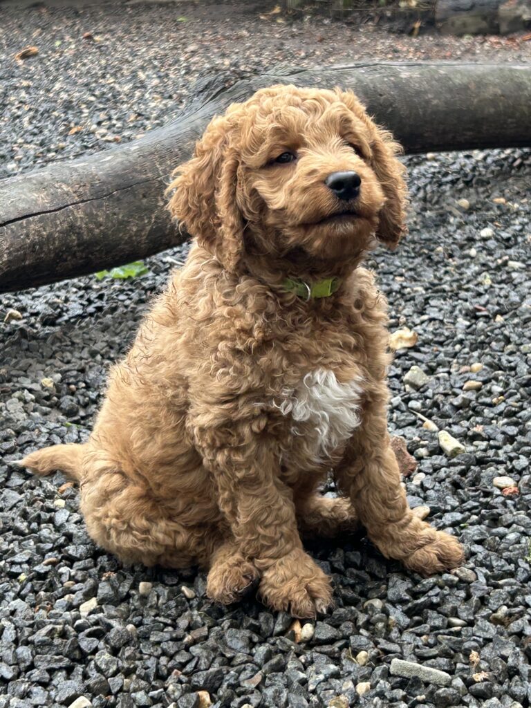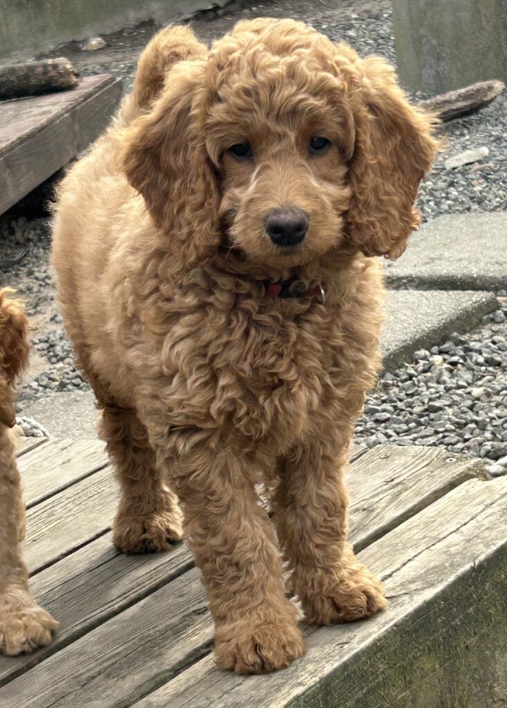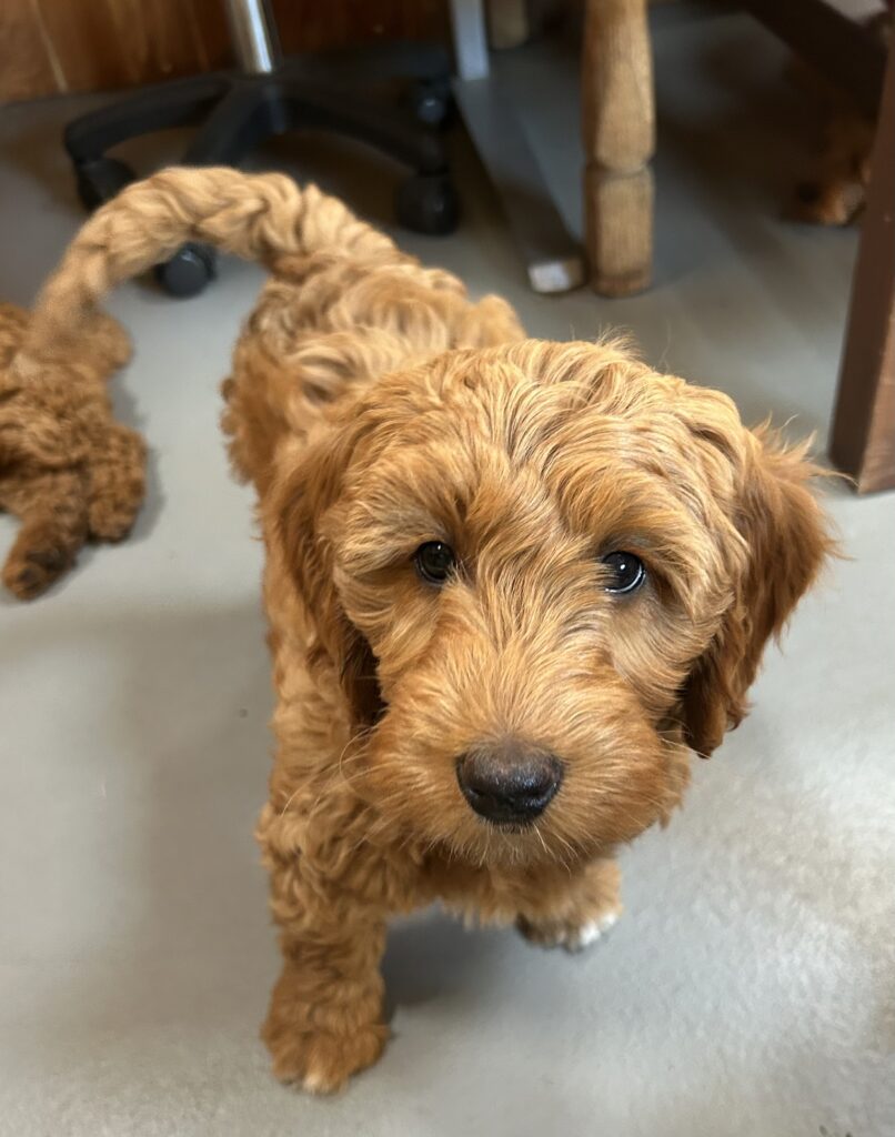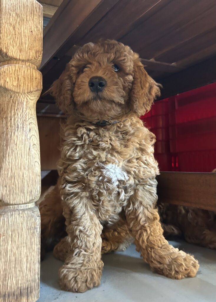 En mellem pige, som er dejlig imødekommende, positiv og kærlig pige. Hun er tilpas nysgerrig og legesyg og fræk, med et extra glimt i øjet. Hun er også alm modig som man forventer at en lille hvalp uden livserfaring, så igen en go mellem type. Når vi skriver “Mellem” så er deres psyke ret så tæt på den væsen de fleste af vores doodler har. Vægt den 19.5.2025 4,9 kg, forvente voksen vægt ca 20 kg og 50 cm.