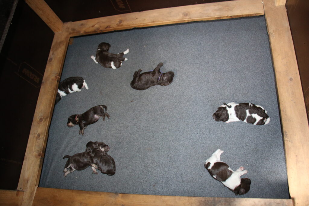 Så har hvalpene holdt flyttedag. De er flyttet ud i en stor gård i haven, hvor der er et opvarmet hundehus de kan sove i. De syntes det var så fedt at komme på græs og få nye omgivelser. Tidligere har de gået i et rum der fører ud til gårdspladsen, de er derfor allerede gode til at besørge udendørs nu.