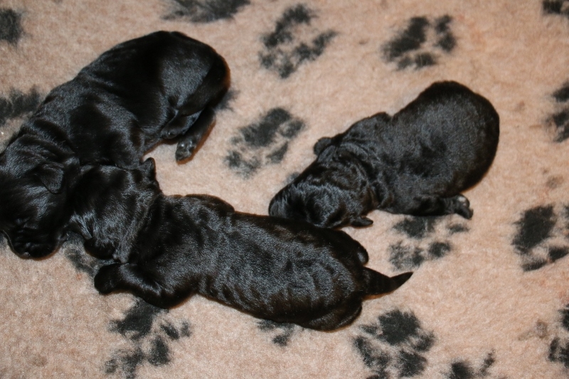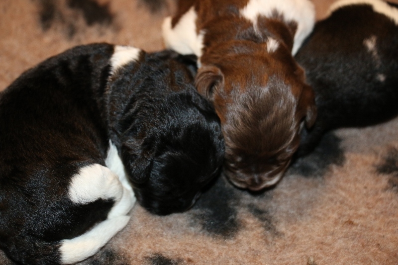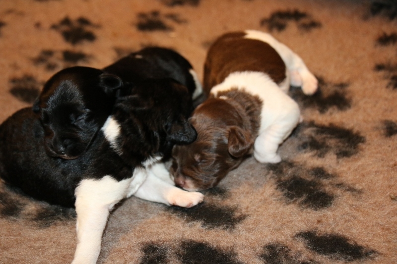 Den ene af de 3 sorte hanner har lidt hvid på bryst/mave og bagpoterne. Den sort/hvide han får også bruge tan aftegn i ansigtet, ligesom Boston har. Den sort/hvide tæve er hende med den hvide plet i det sorte på ryggen.
