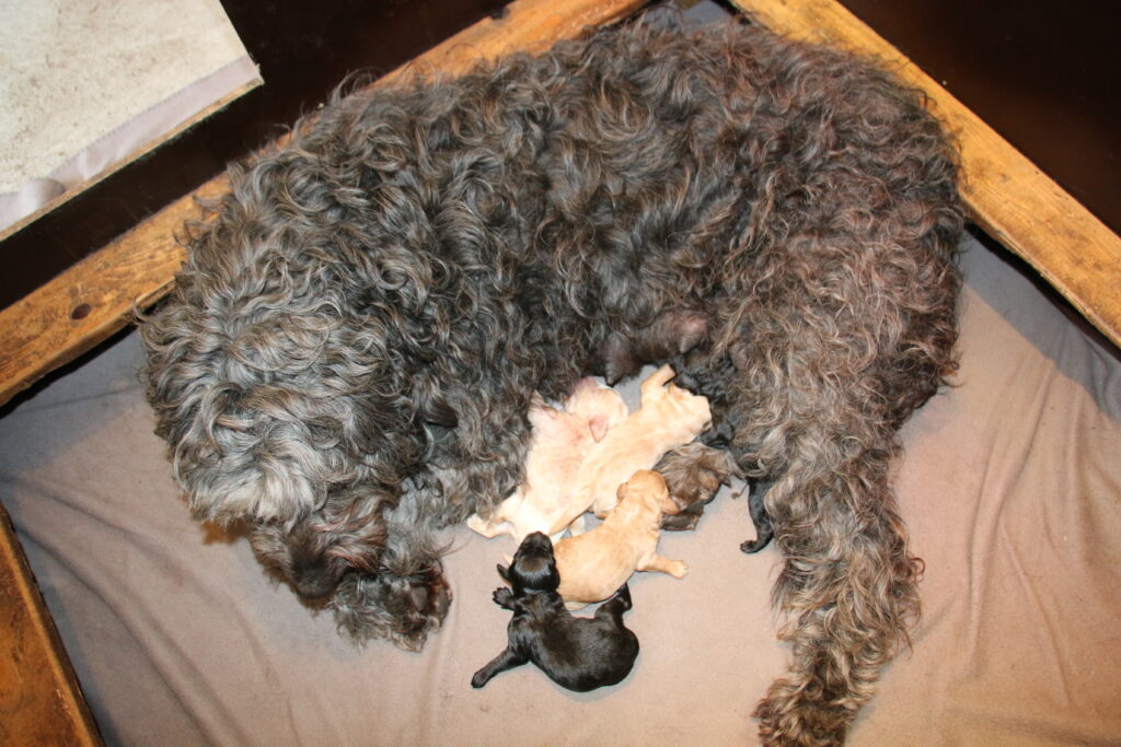 Vi har valgt at give Tesla 2 af Nices 8 hvalpe. De lyse drenge. Eller kan Teslas hvalpe blive for store og flade, det er godt at der er lidt kamp om maden 🙂