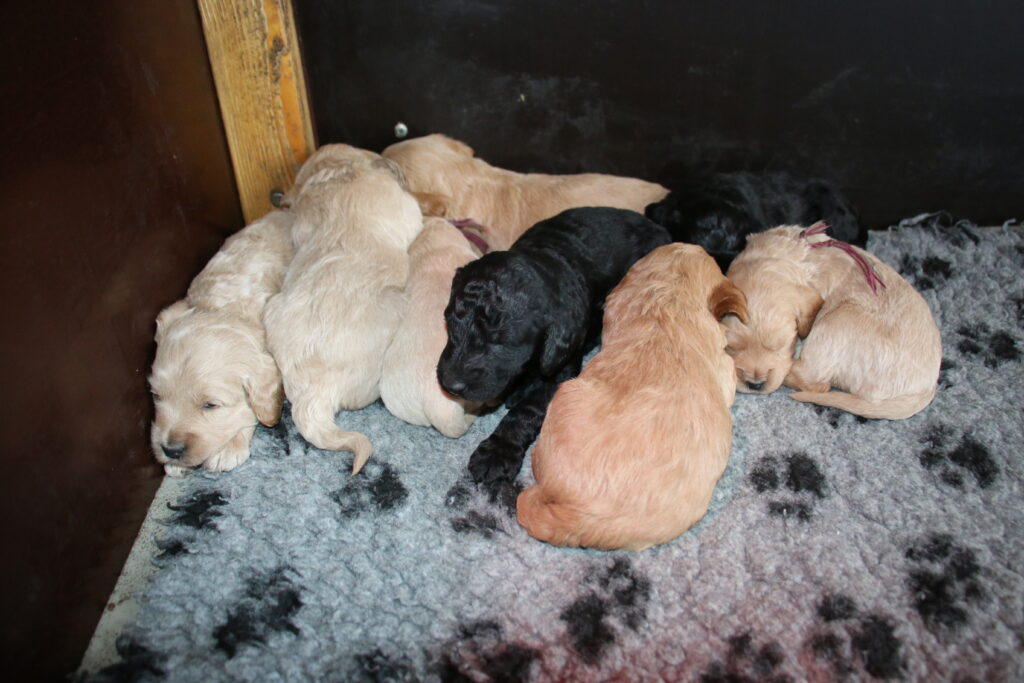 Så er hvalpene kommet ud af fødekassen, men der sker INTET i hvalperummet, for om ca en god uges tid…de kan ikke orientere sig, så de sover og spiser bare.