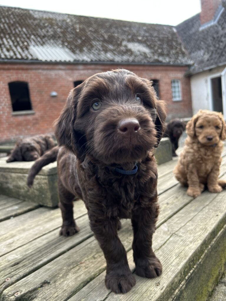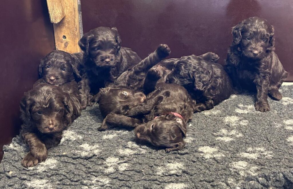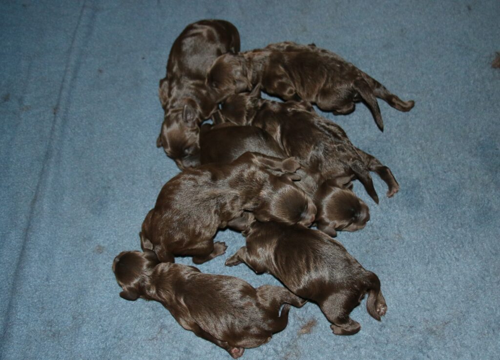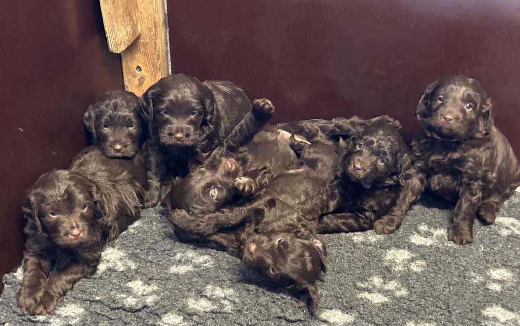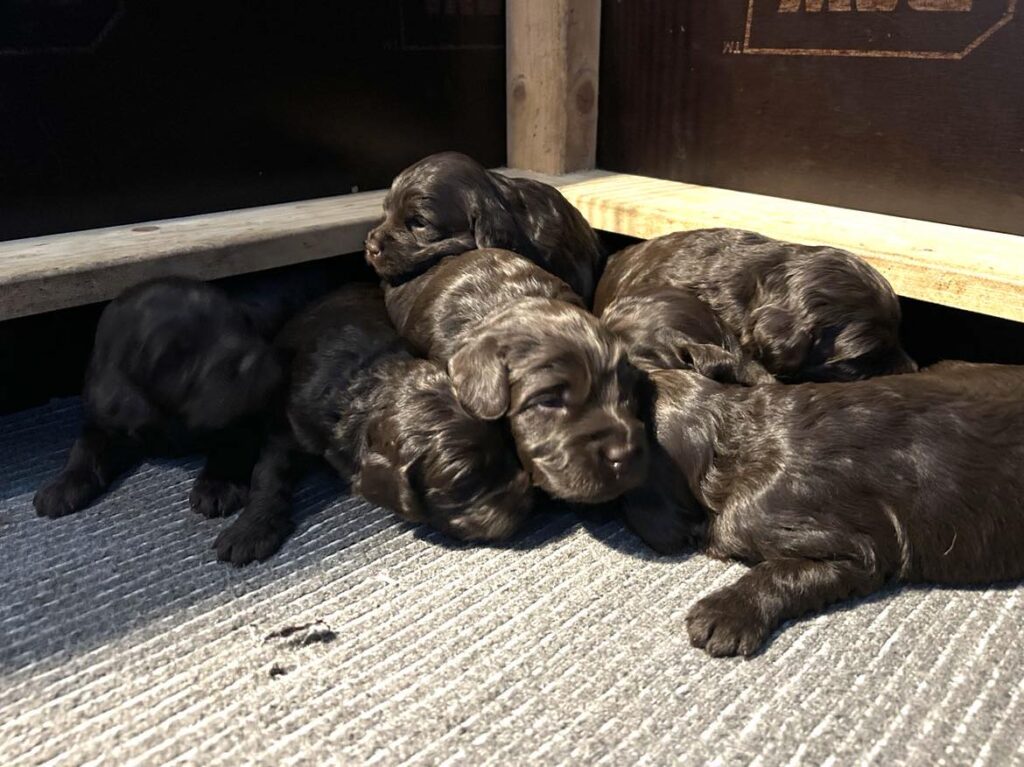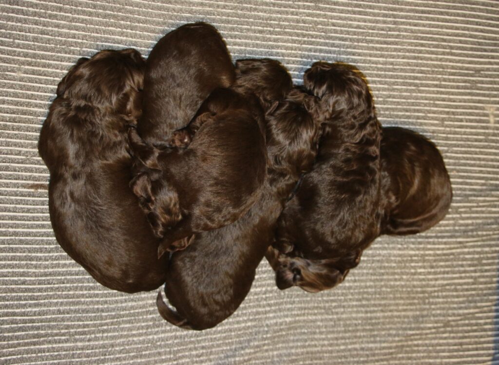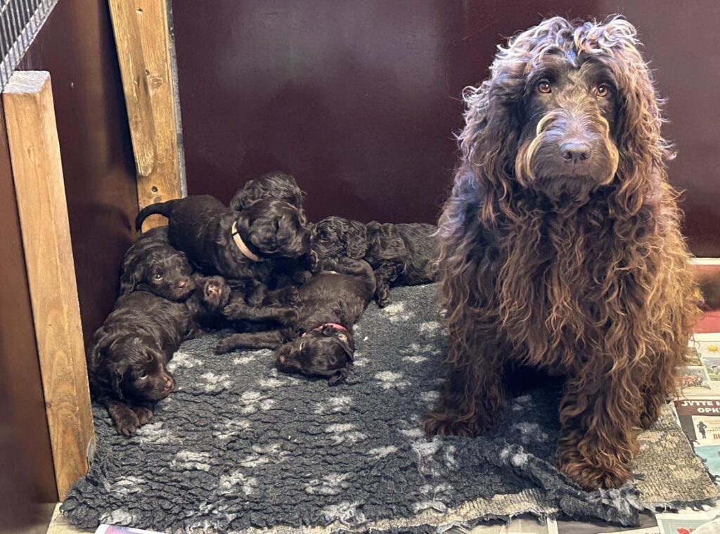 Vores store brune Flatdoodle F1 Jessei og vores lille Labradoodle F1B Gordon, har fået hvalpe sammen for første gang. De har fået 7 skønne hvalpe