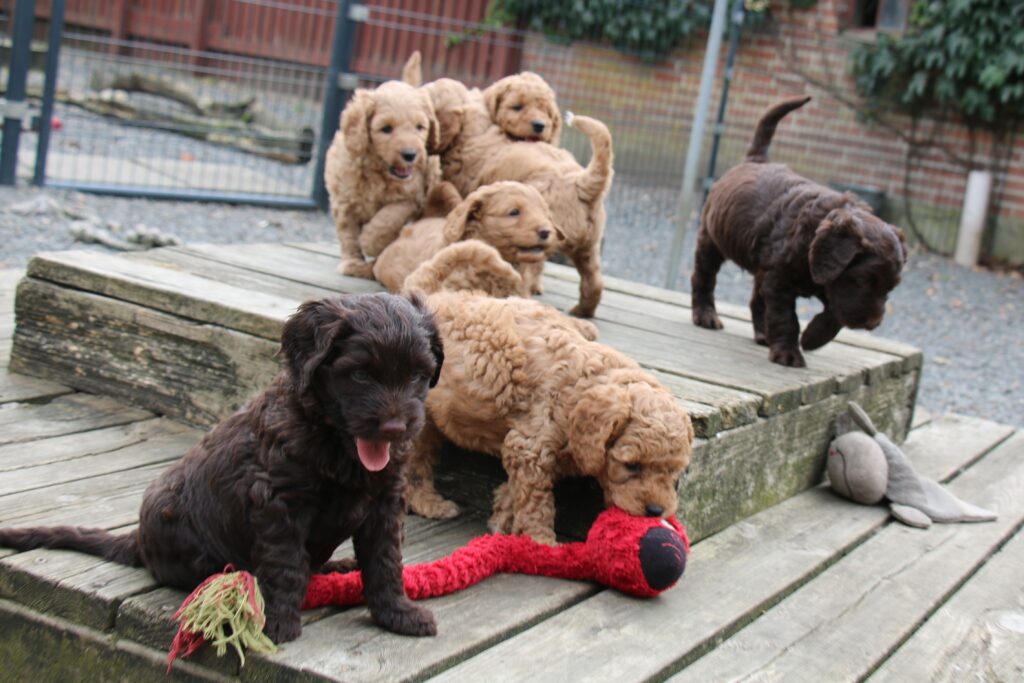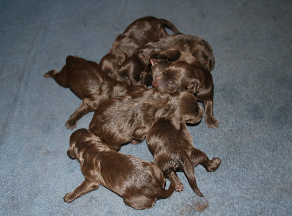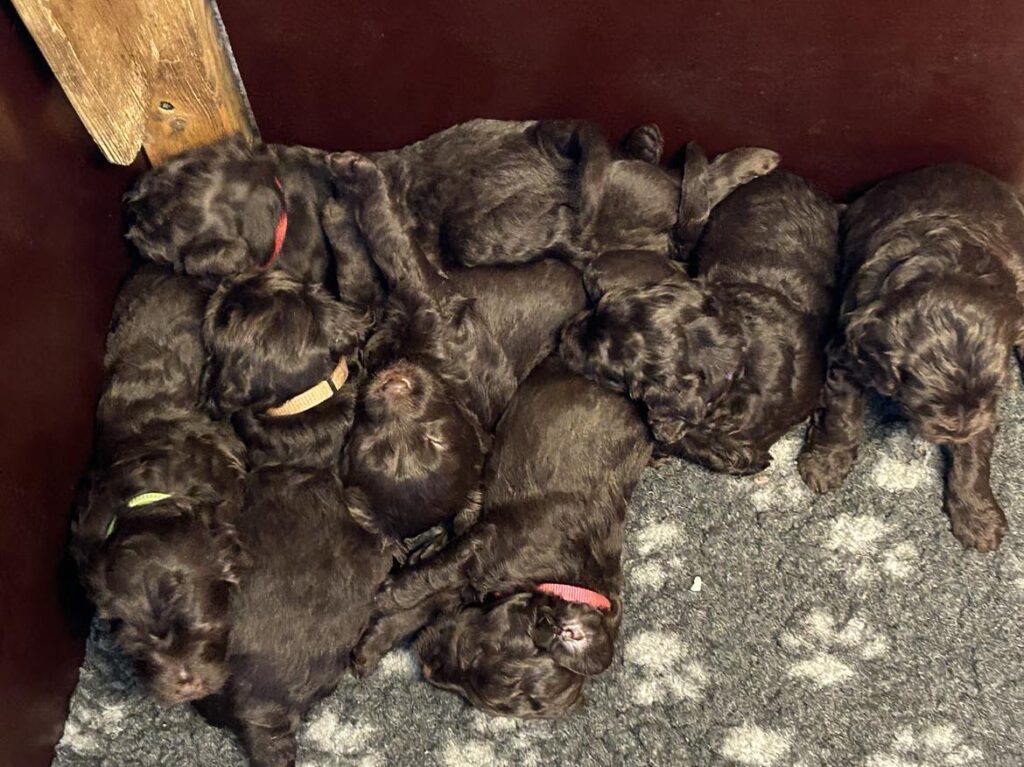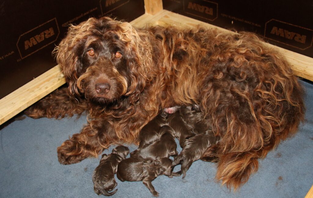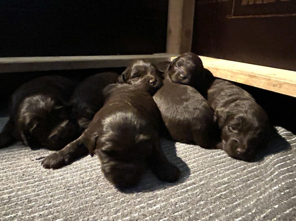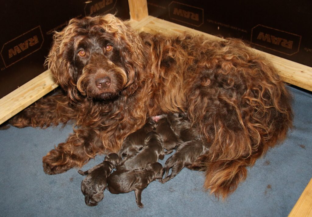Vores store brune Flatdoodle F1 Jessei og vores lille Labradoodle F1B Gordon, har fået hvalpe sammen for første gang. De har fået 7 skønne hvalpe