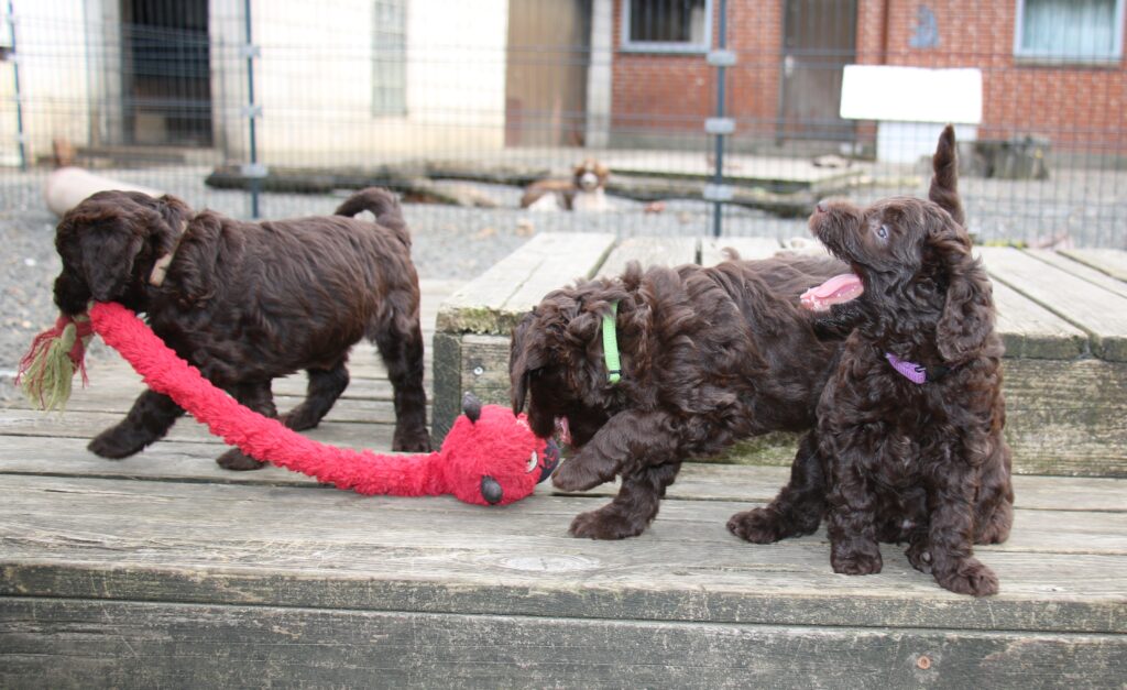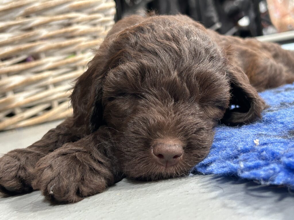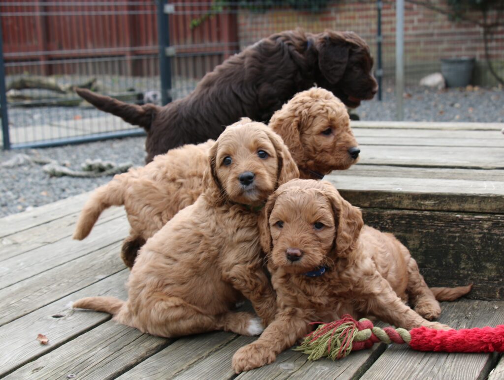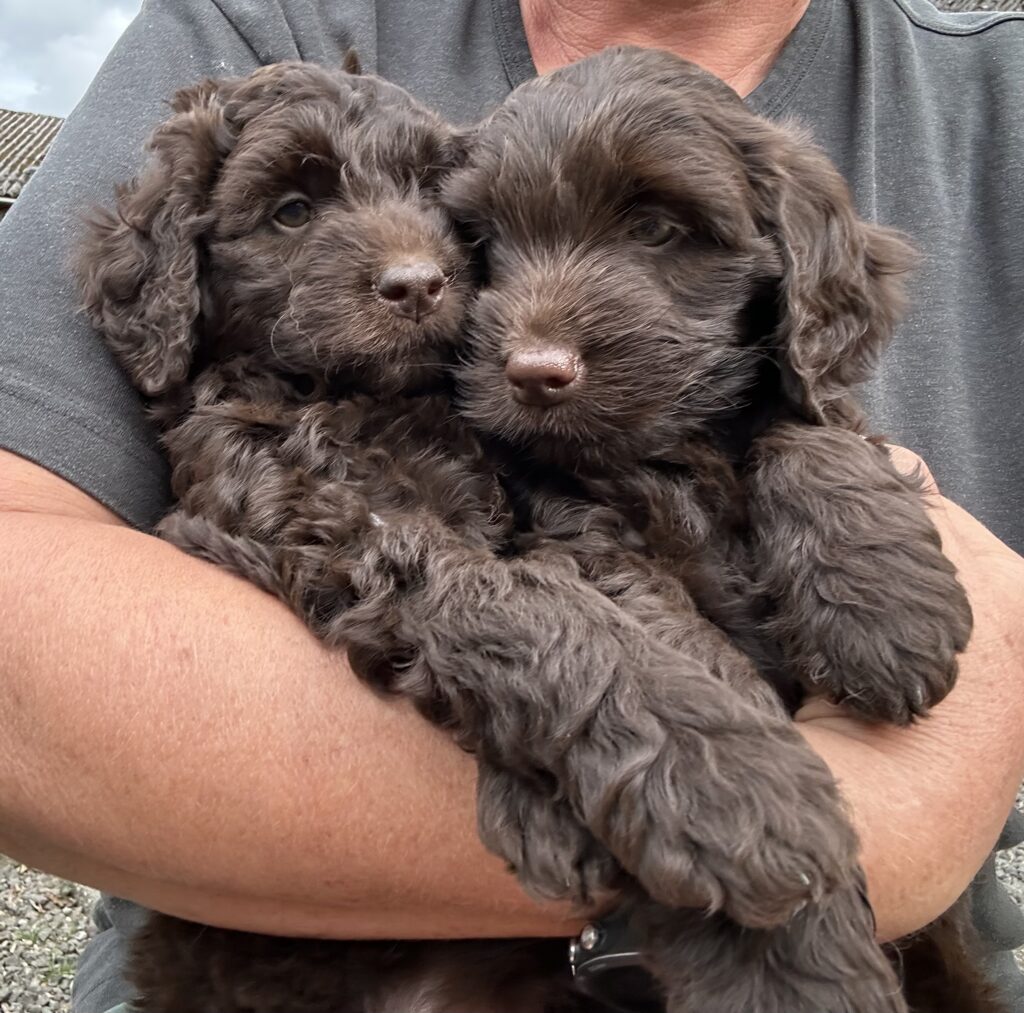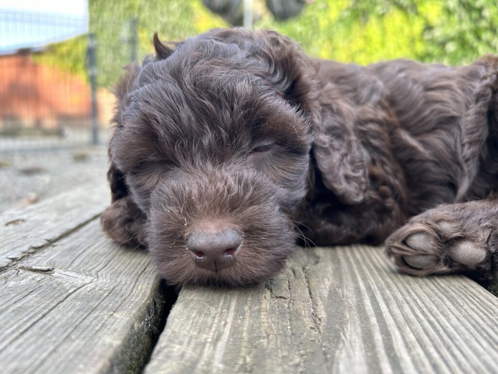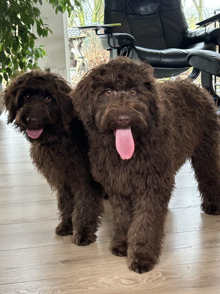 Vores store brune Flatdoodle F1 Jessei og vores lille Labradoodle F1B Gordon, har fået hvalpe sammen for første gang. De har fået 7 skønne hvalpe
