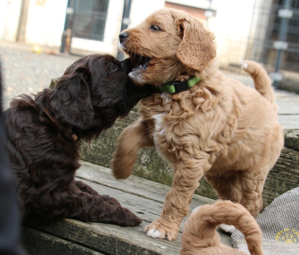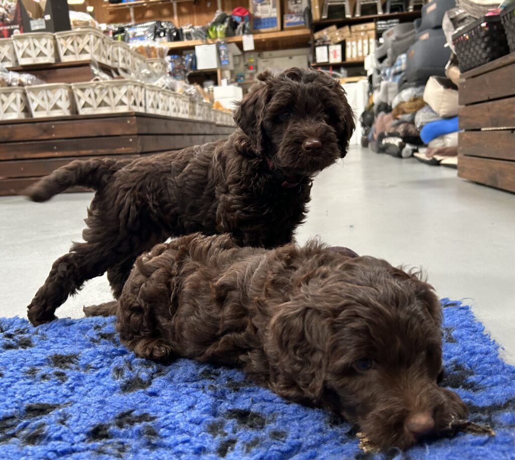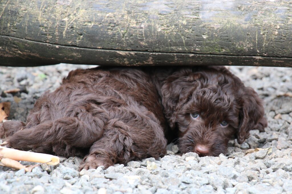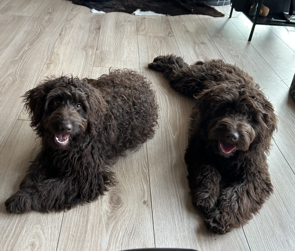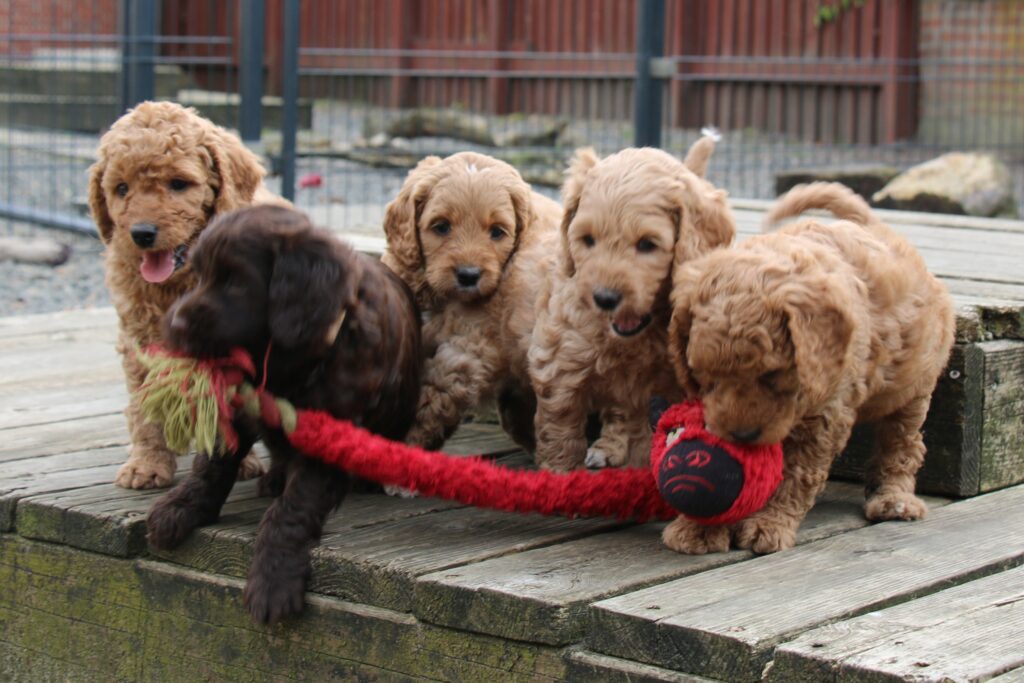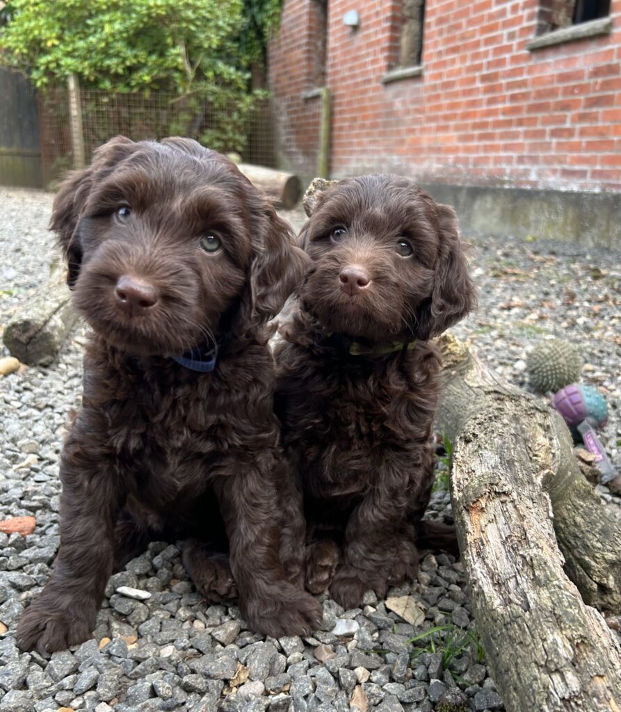 Vores store brune Flatdoodle F1 Jessei og vores lille Labradoodle F1B Gordon, har fået hvalpe sammen for første gang. De har fået 7 skønne hvalpe