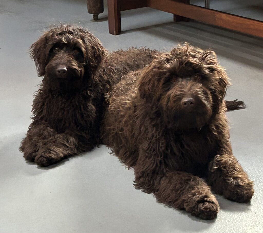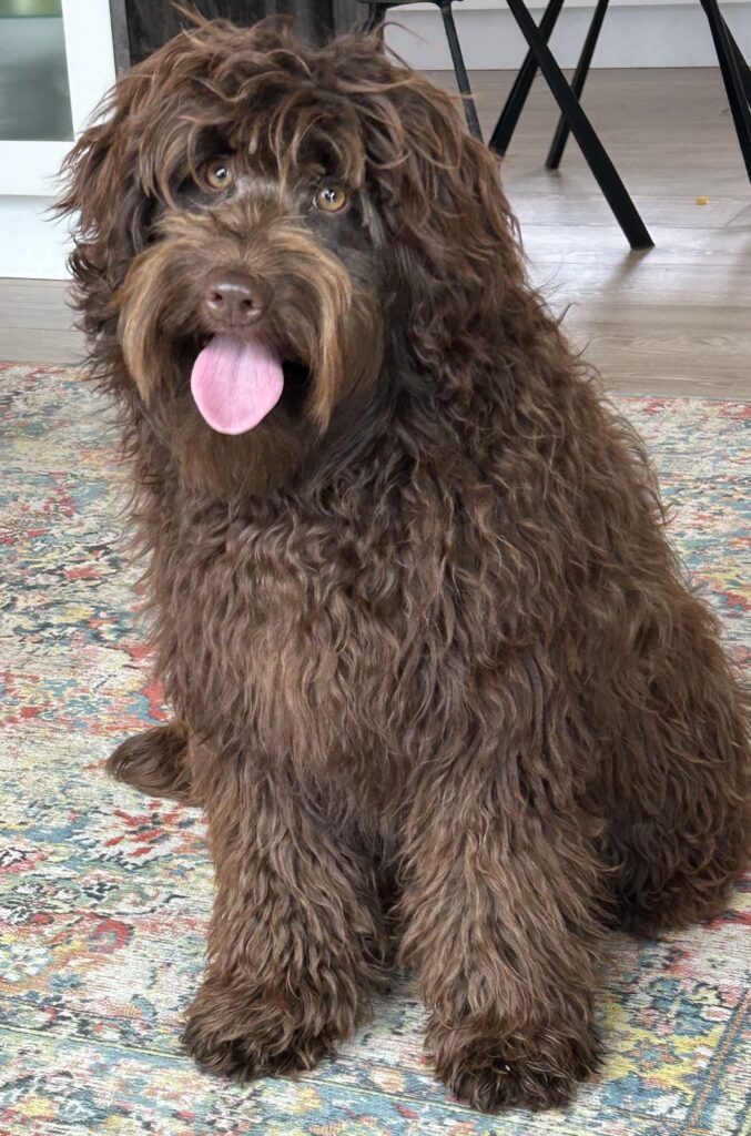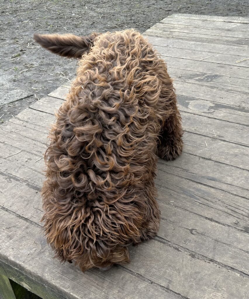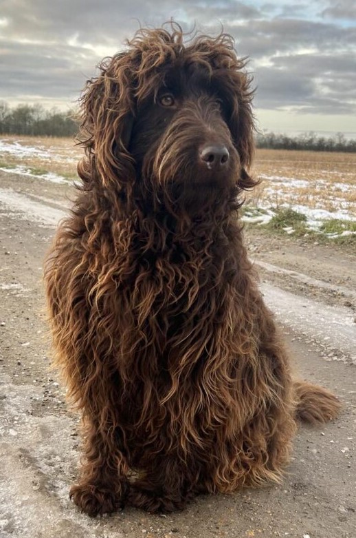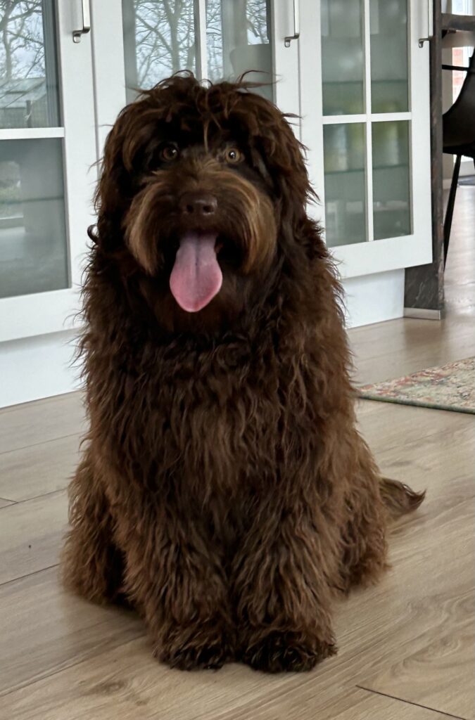 Far Gordon er en blanding af en brun labrador + brun toy puddel + brun toy puddel = Labradoodle F1B. Gordon er ca 40 cm og 10 kg