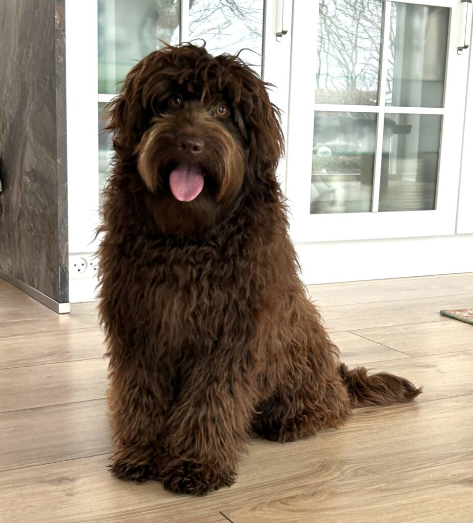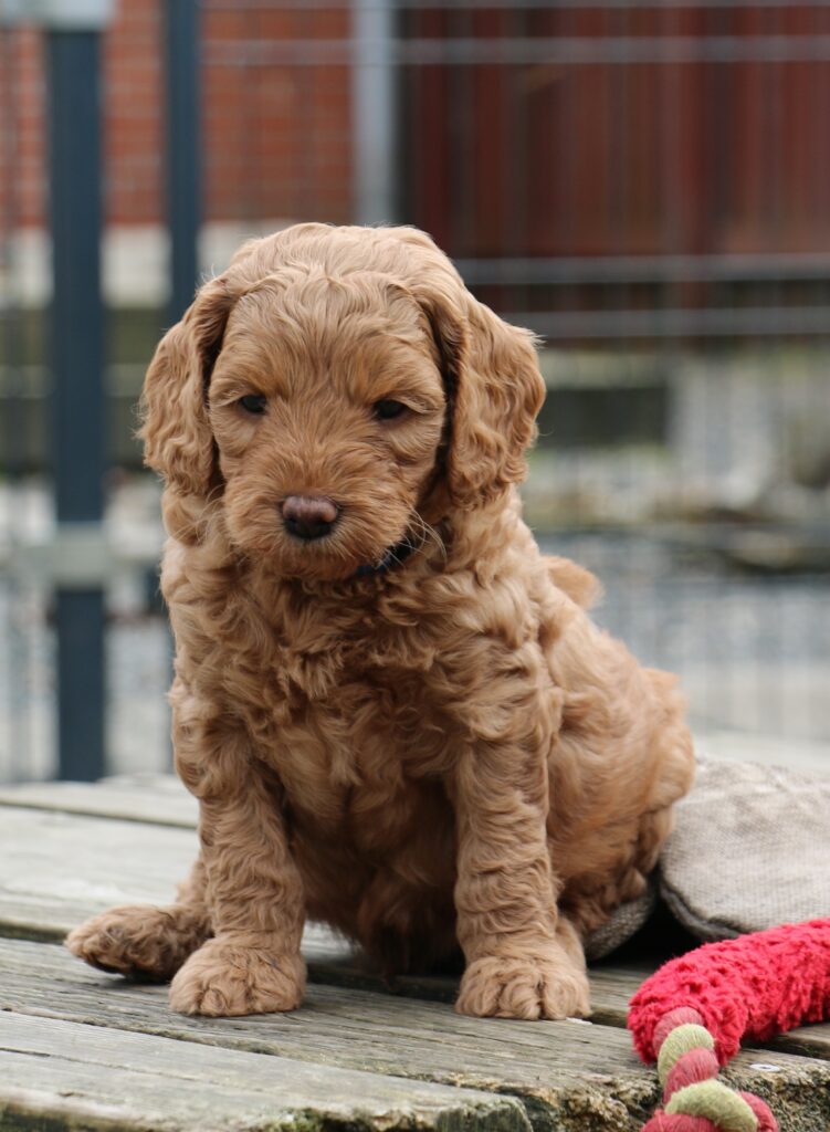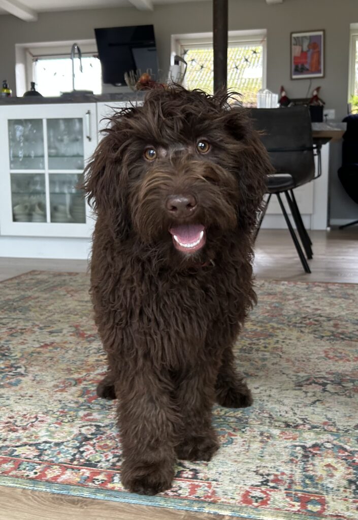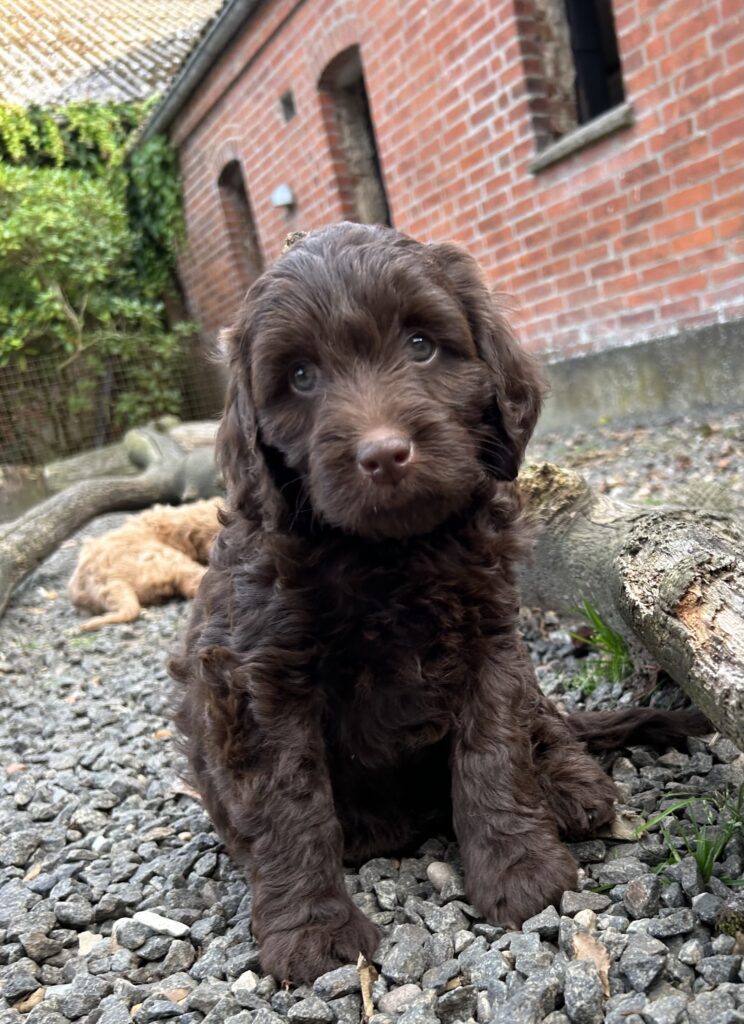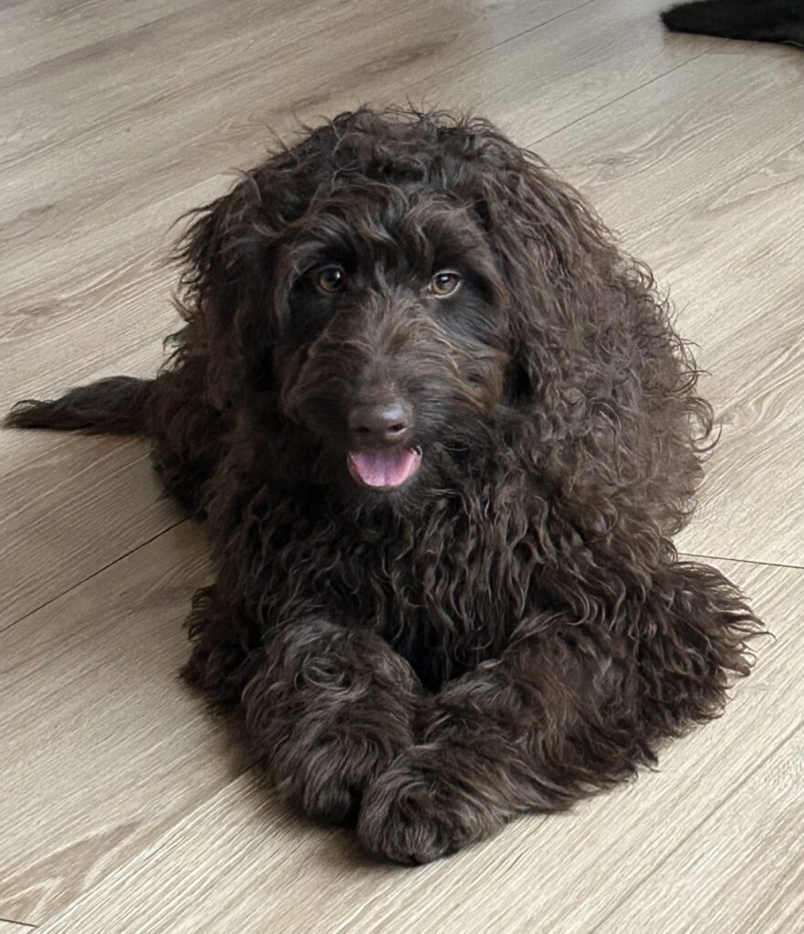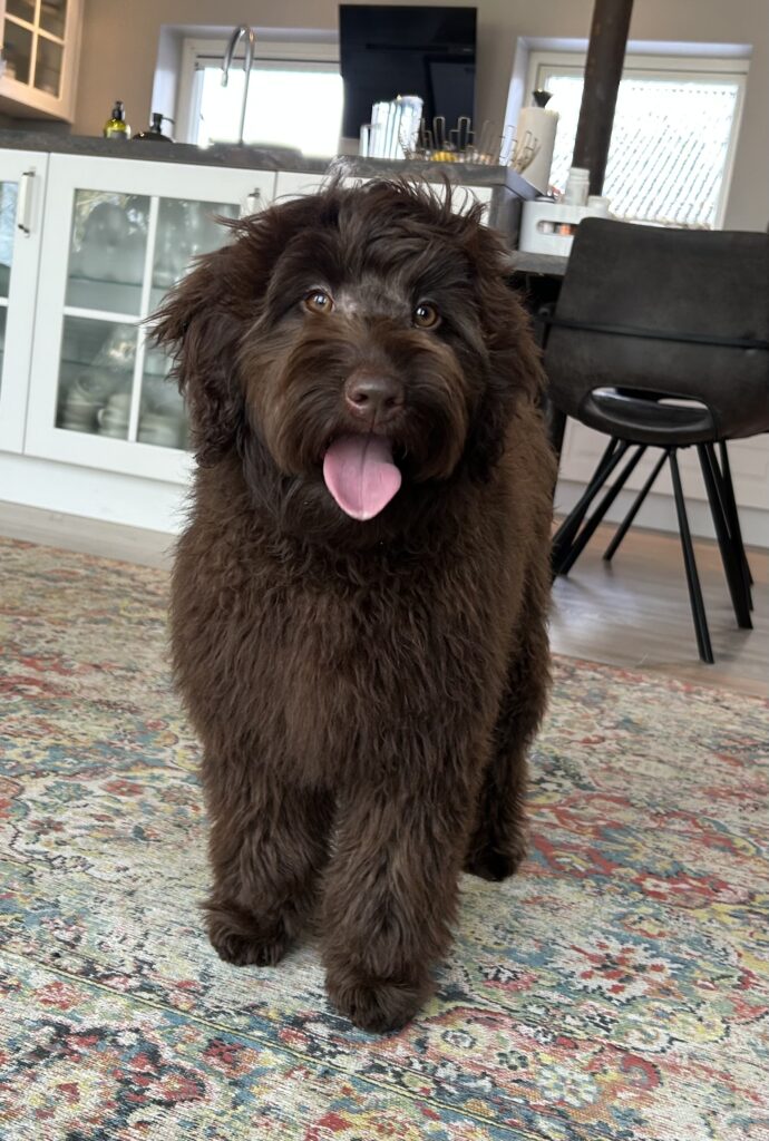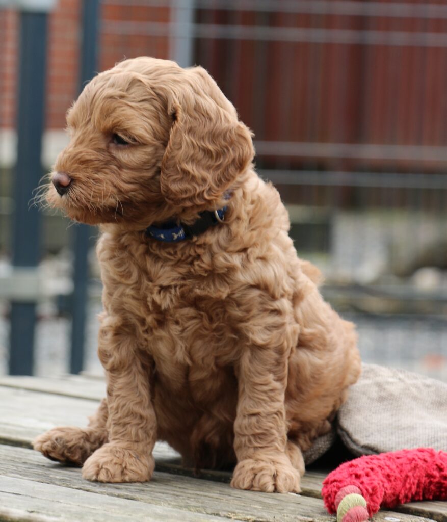 En rigtig mellem dreng, ….kontakt søgende og kærlig uden at være for intens, god leg som vi forventer af en doodle, men også god til at slappe af blandt legetøjet. Tør godt gå ud i verden, men har ikke et stort behov for det.