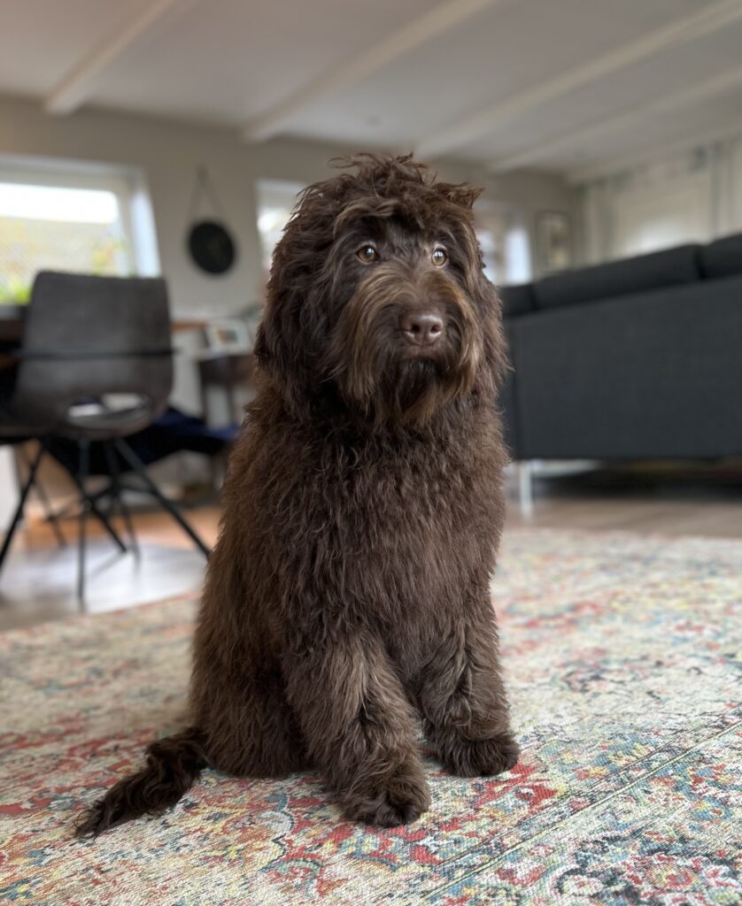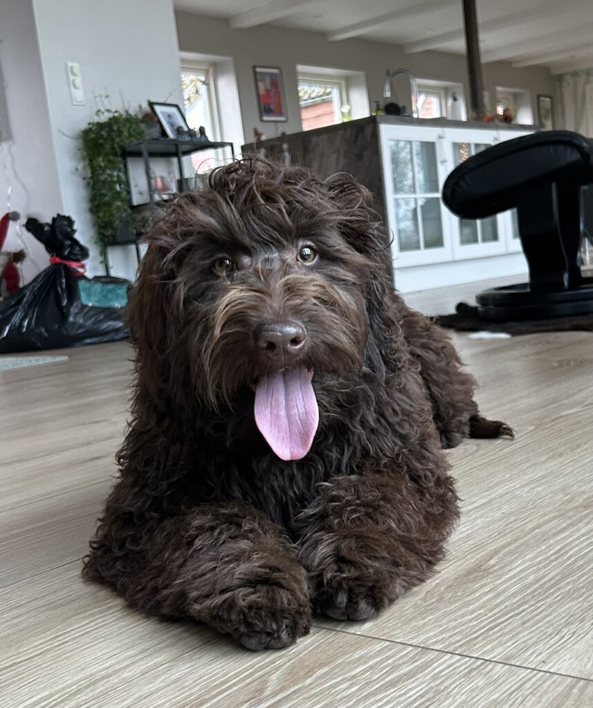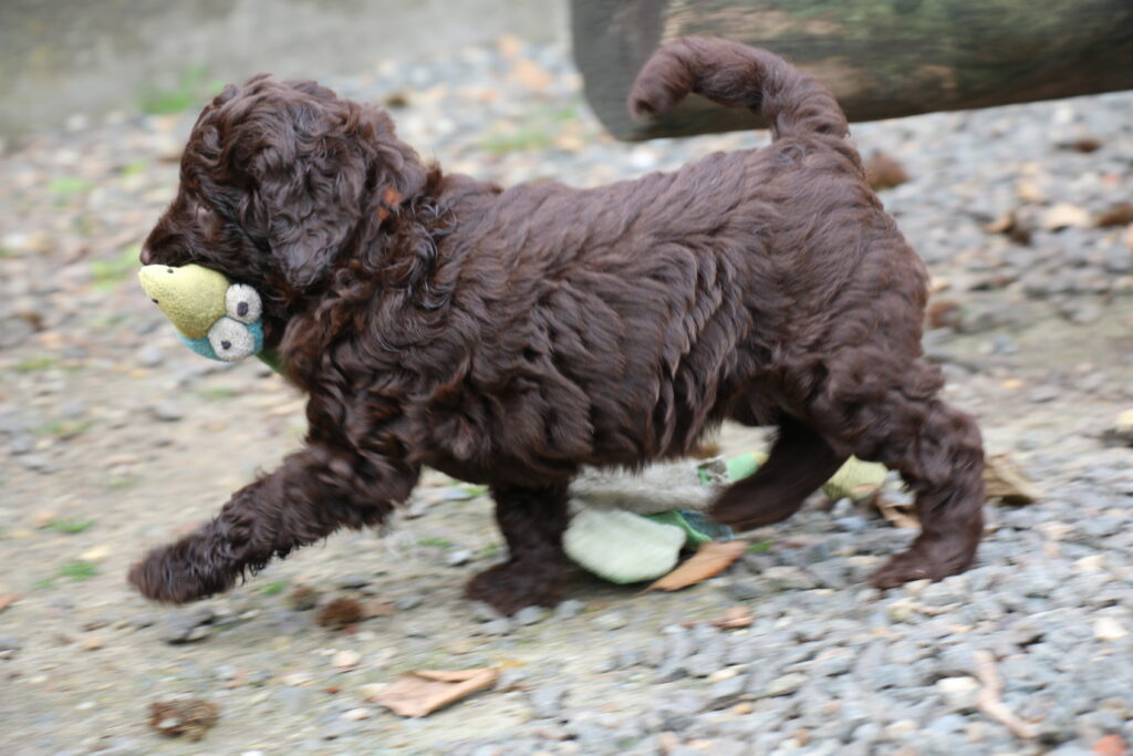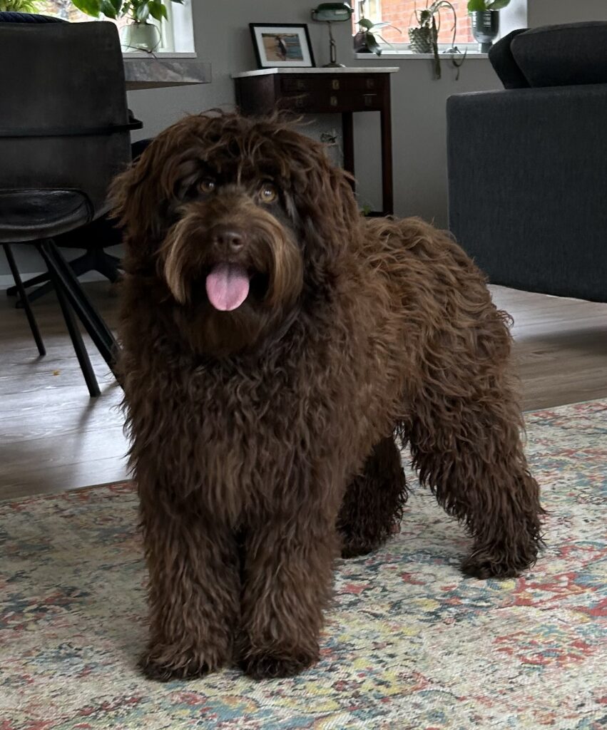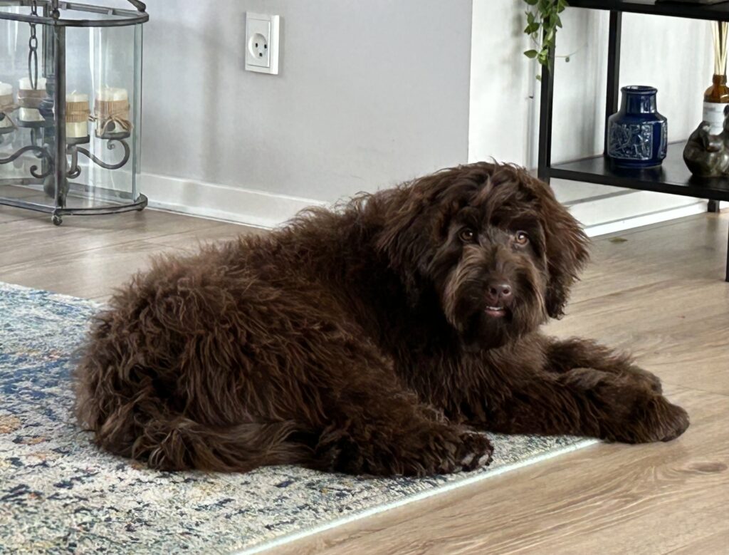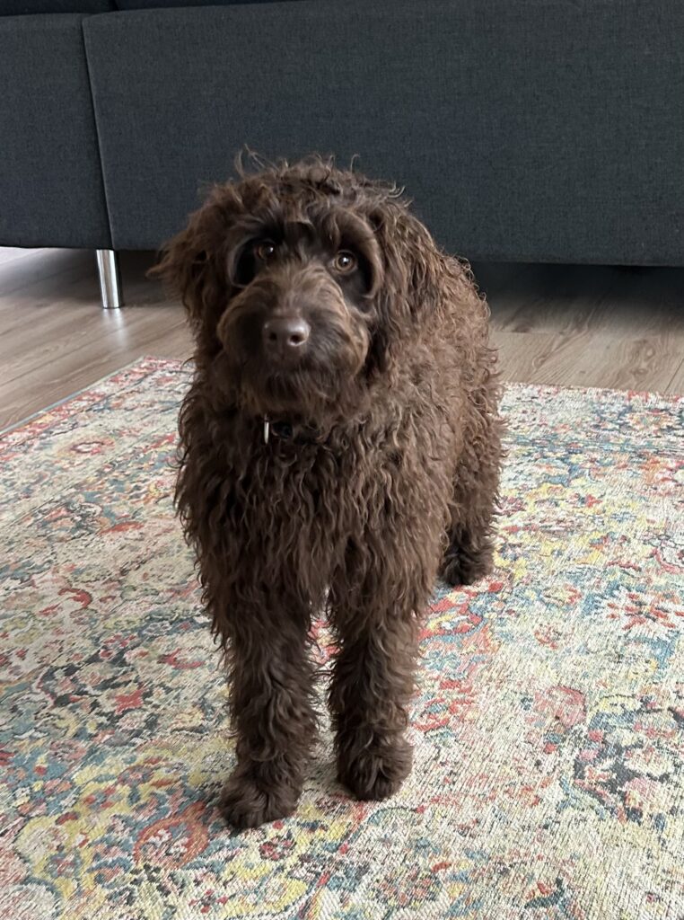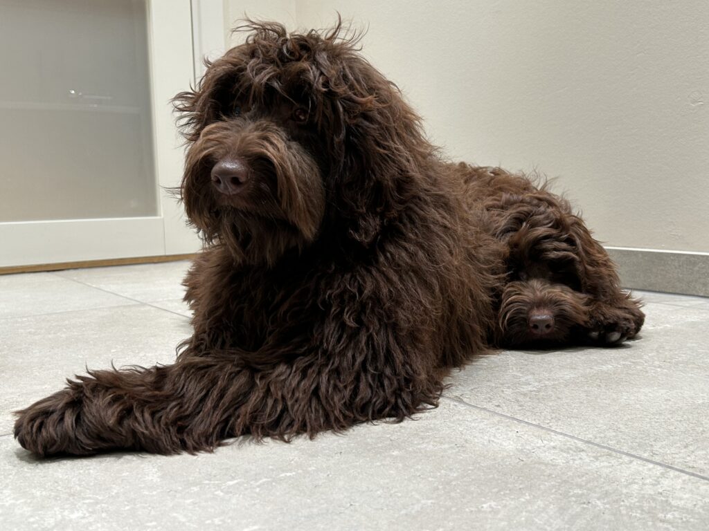 En rigtig mellem dreng, ….kontakt søgende og kærlig uden at være for intens, god leg som vi forventer af en doodle, men også god til at slappe af blandt legetøjet. Tør godt gå ud i verden, men har ikke et stort behov for det.