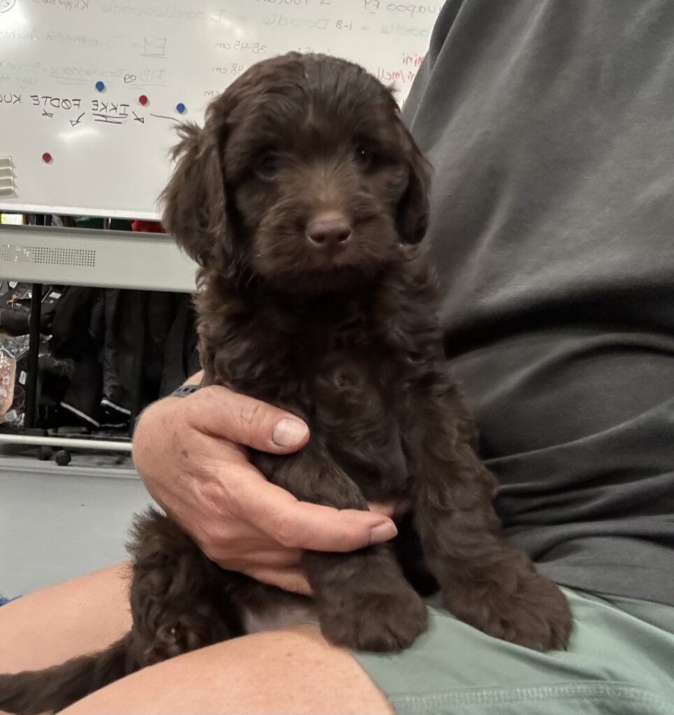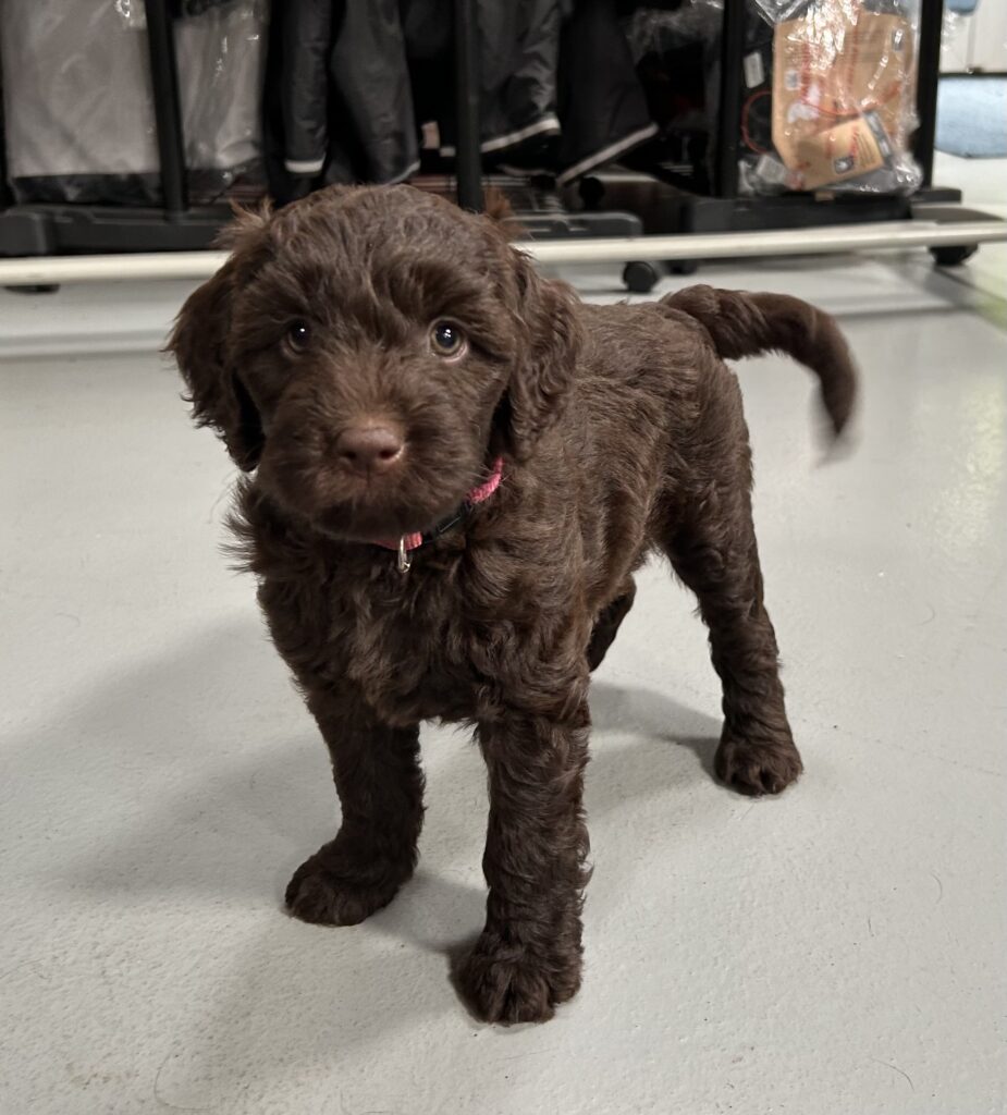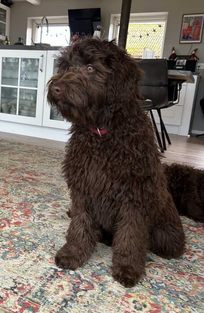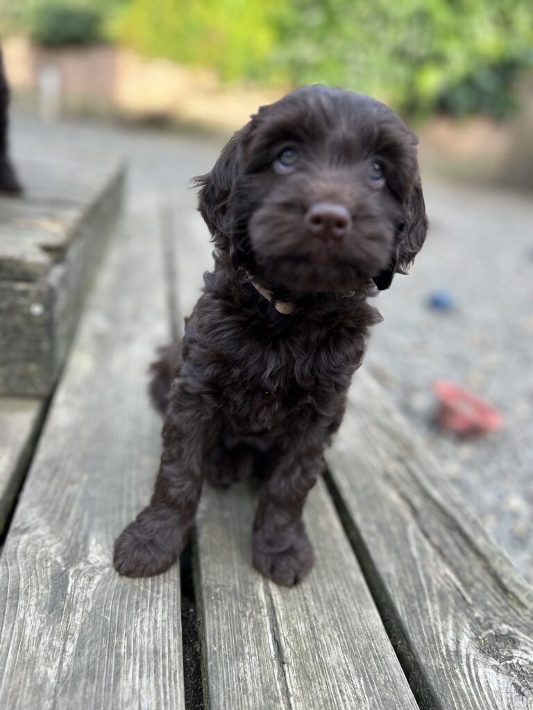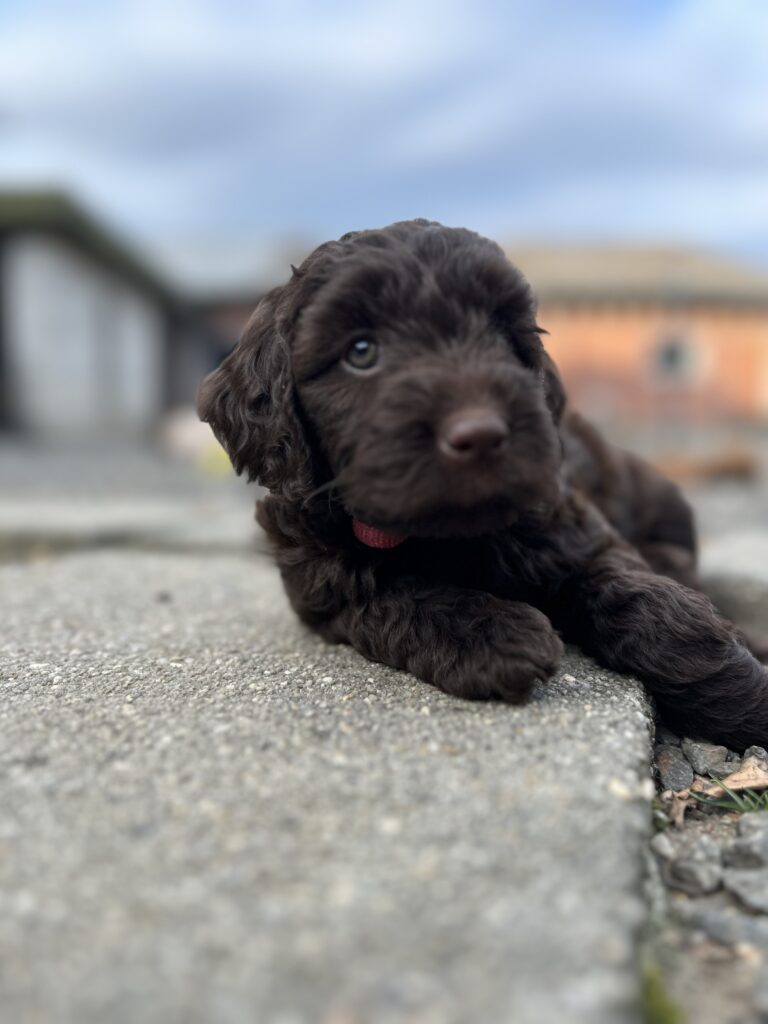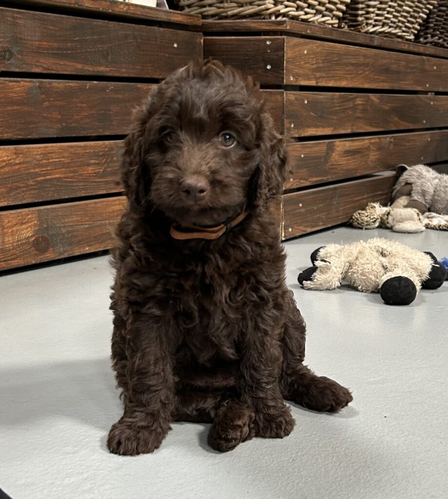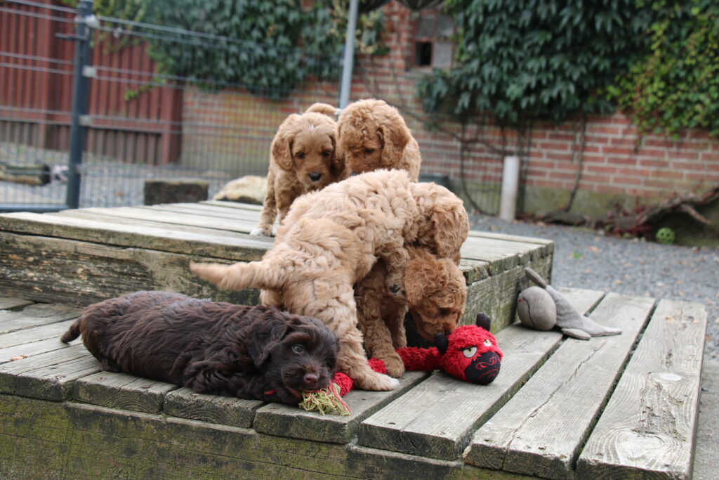 En rigtig mellem dreng, ….kontakt søgende og kærlig uden at være for intens, god leg som vi forventer af en doodle, men også god til at slappe af blandt legetøjet. Tør godt gå ud i verden, men har ikke et stort behov for det.