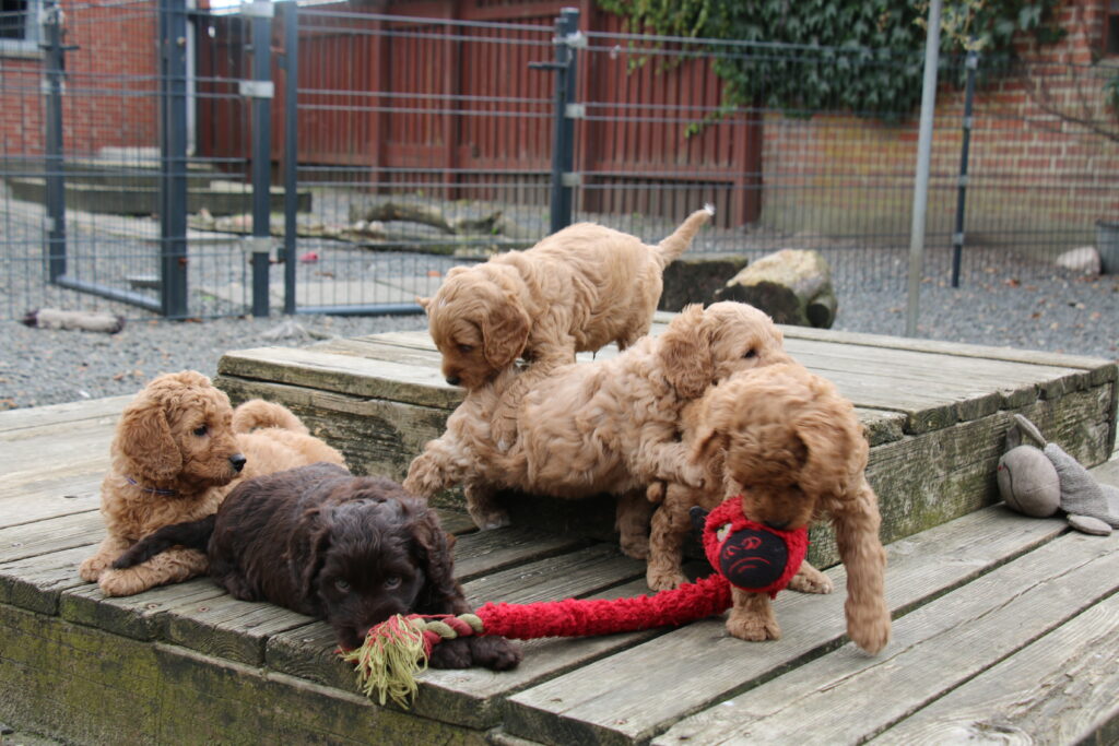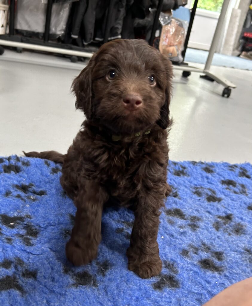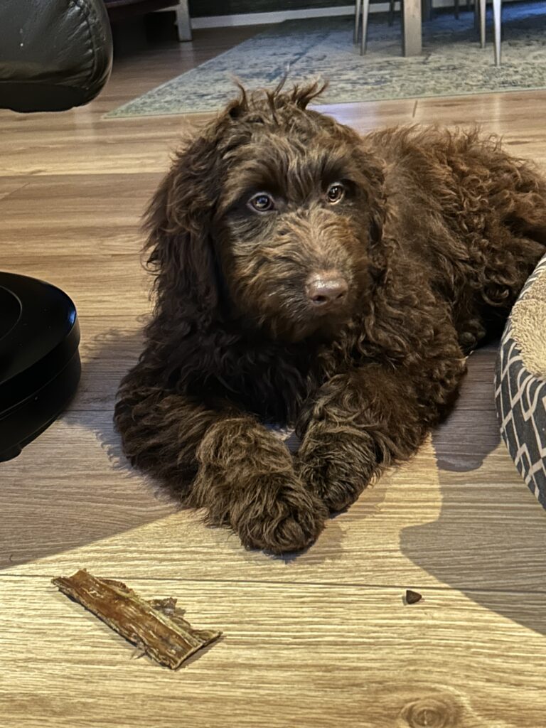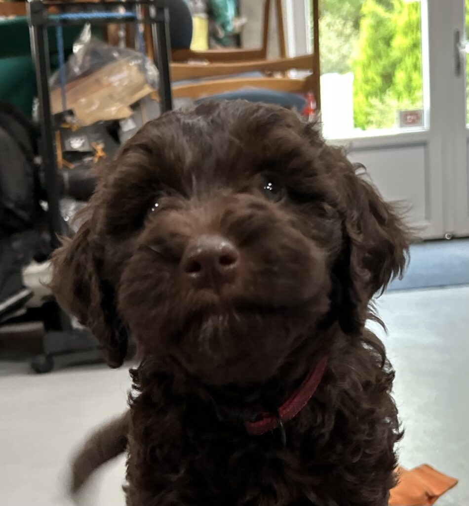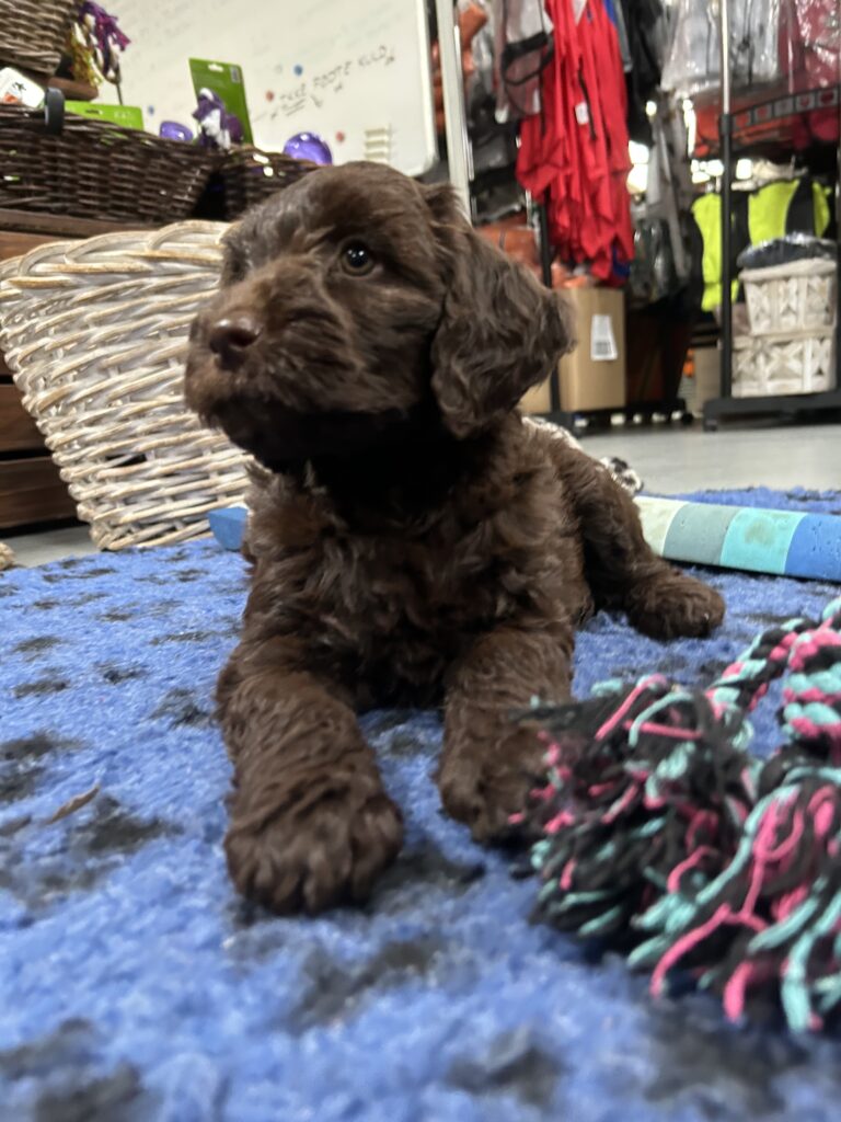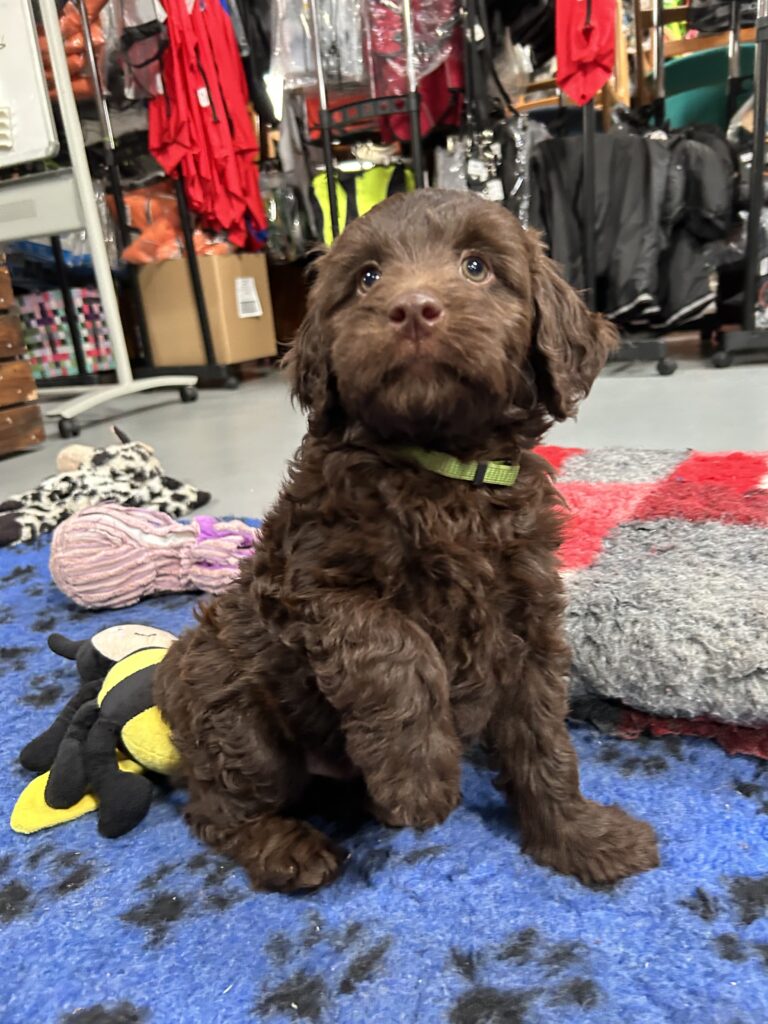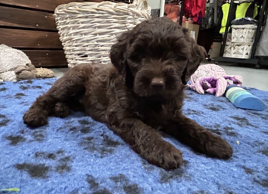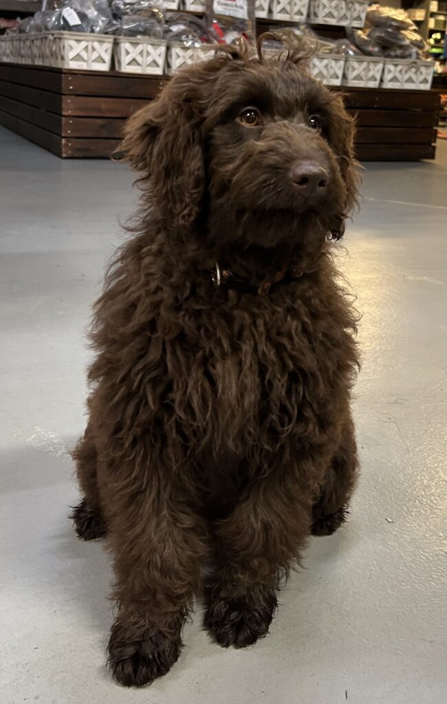 En rigtig mellem dreng, ….kontakt søgende og kærlig uden at være for intens, god leg som vi forventer af en doodle, men også god til at slappe af blandt legetøjet. Tør godt gå ud i verden, men har ikke et stort behov for det.