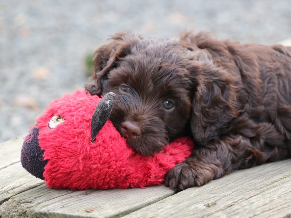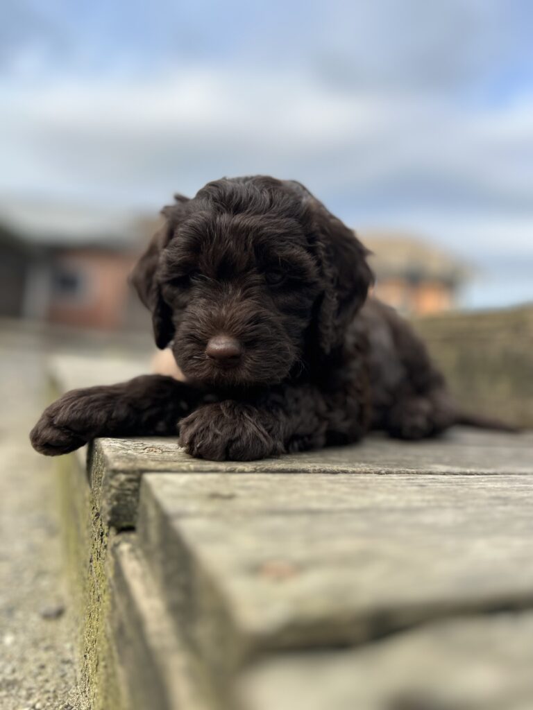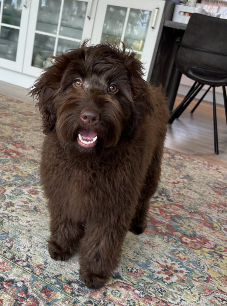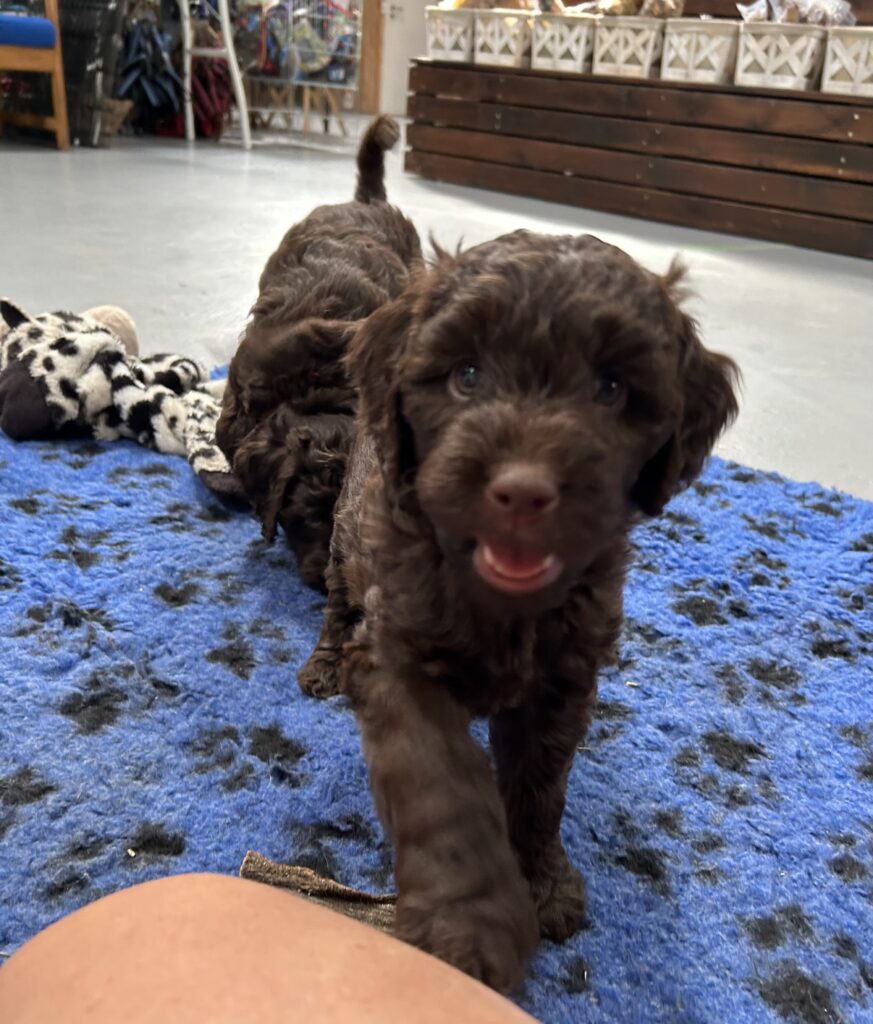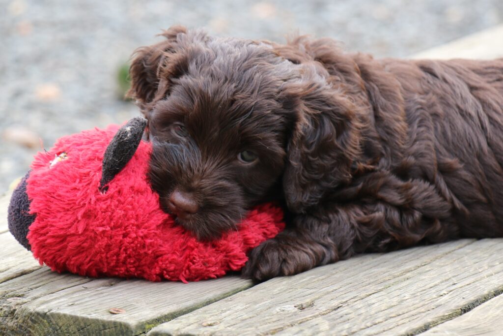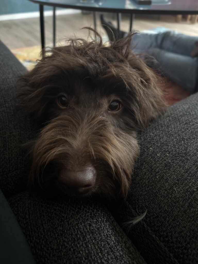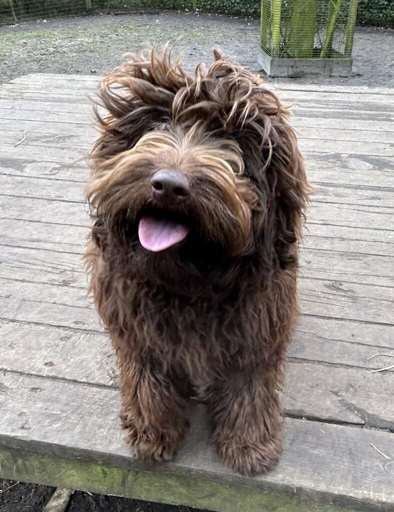 En rigtig mellem dreng, ….kontakt søgende og kærlig uden at være for intens, god leg som vi forventer af en doodle, men også god til at slappe af blandt legetøjet. Tør godt gå ud i verden, men har ikke et stort behov for det.