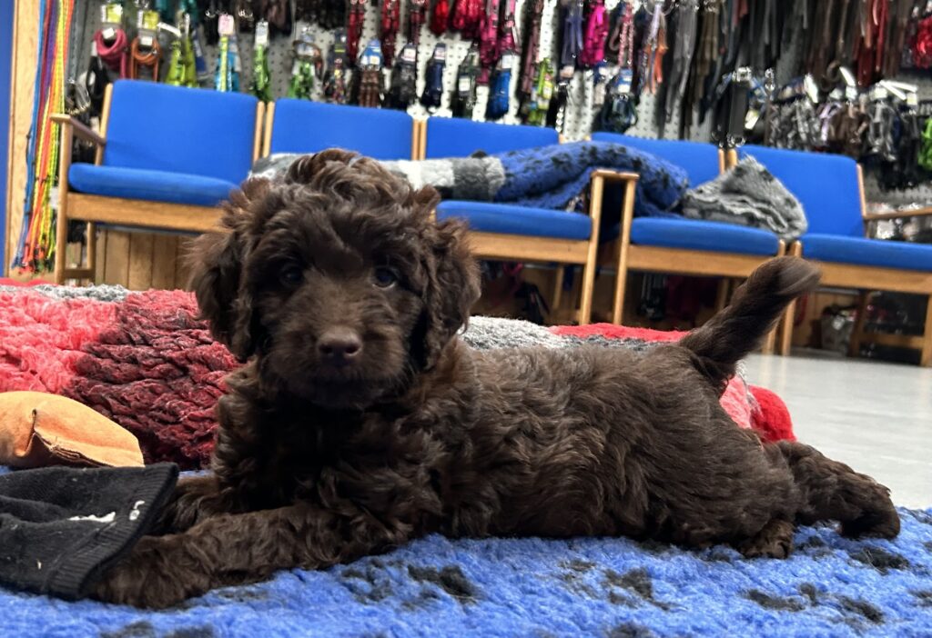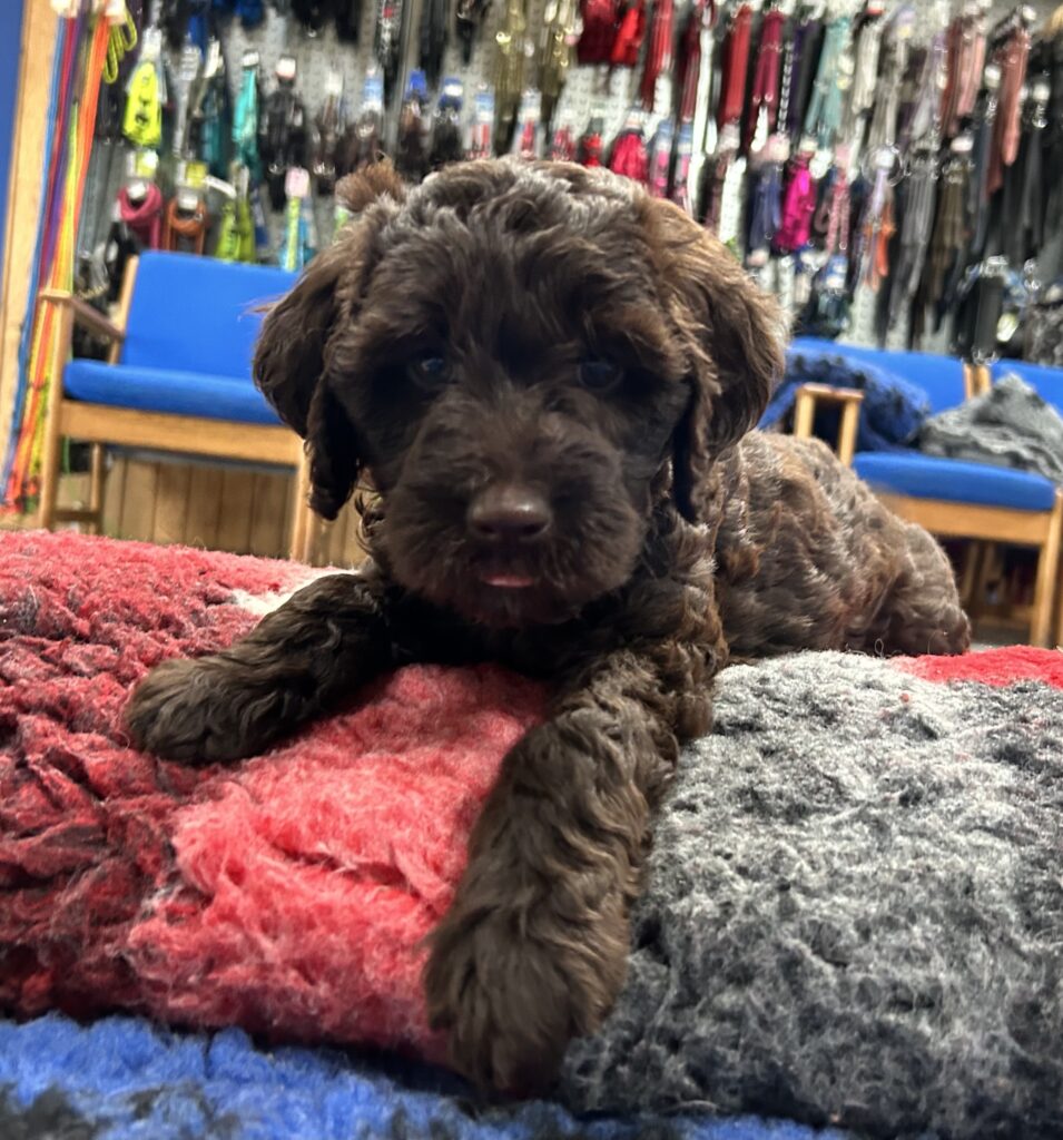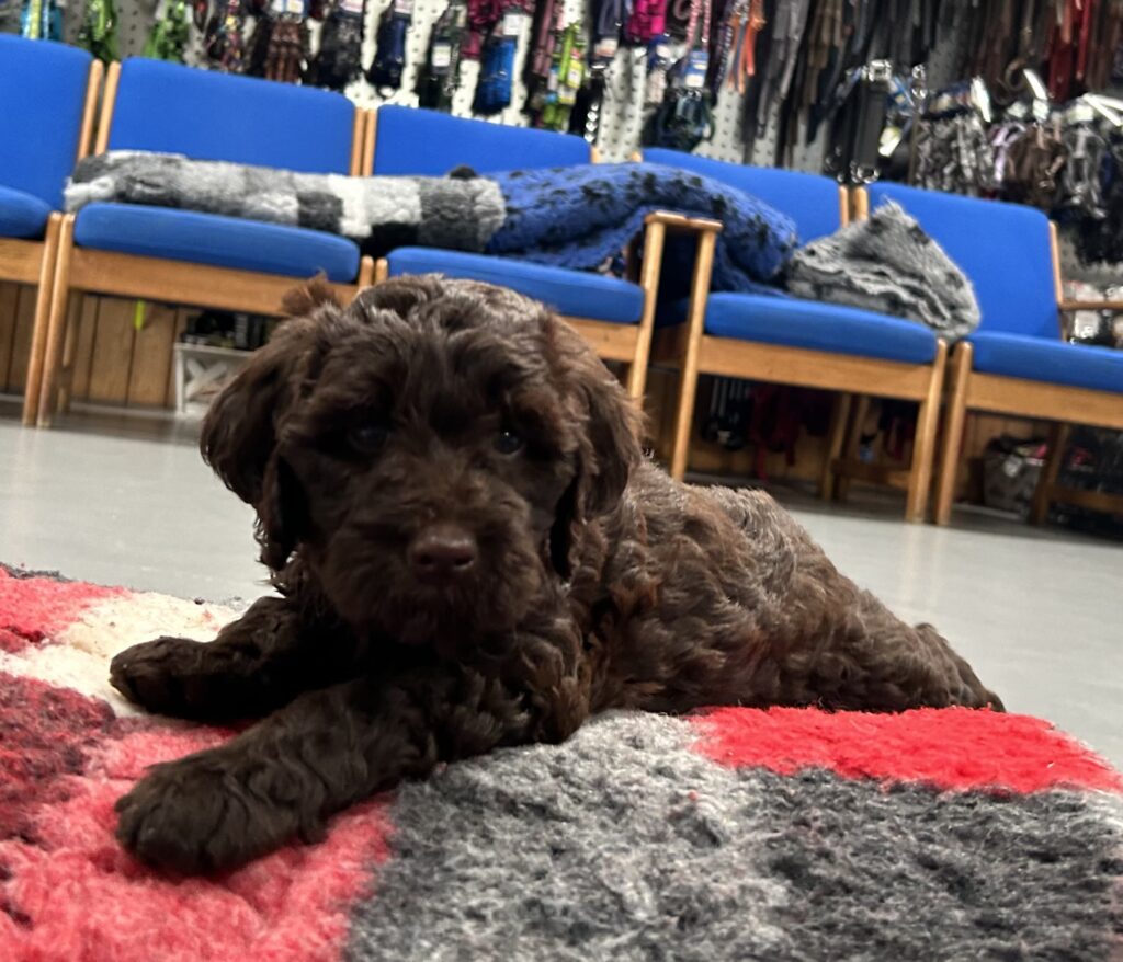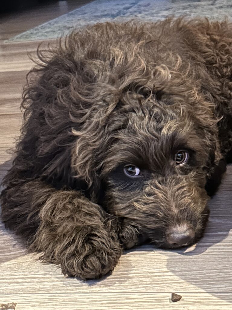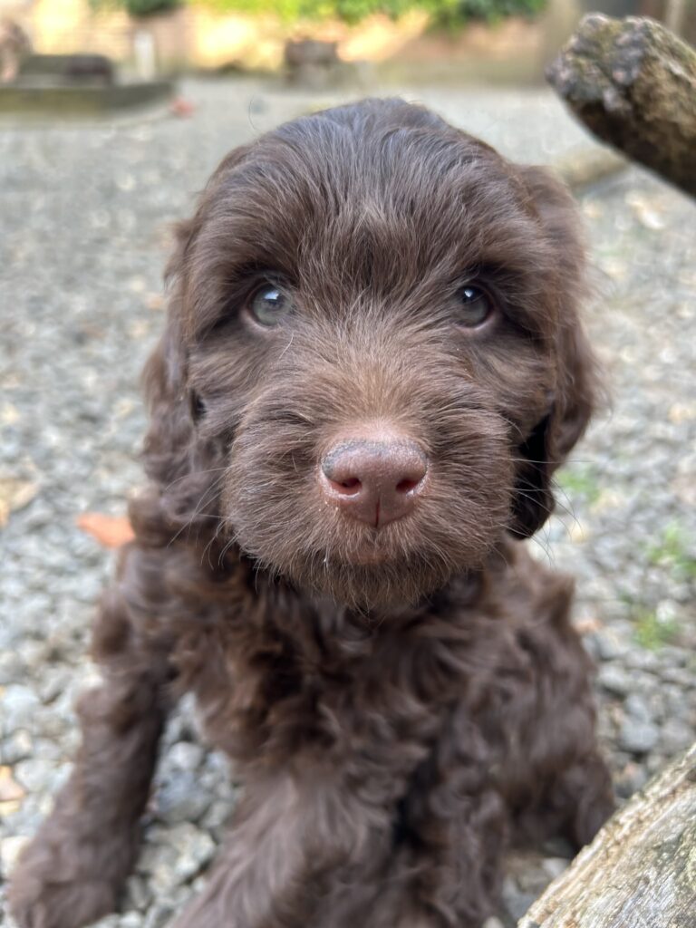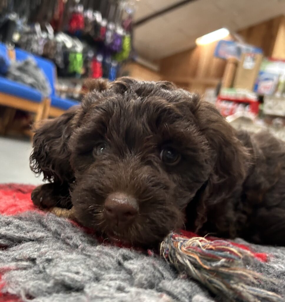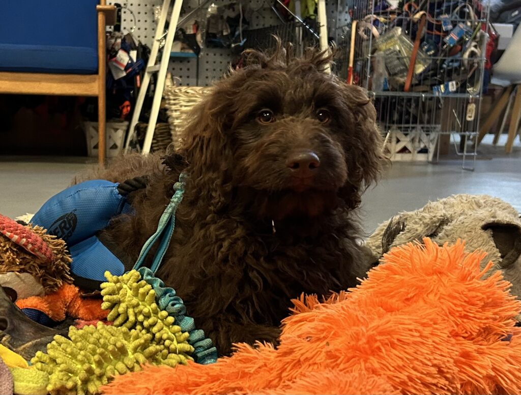 En rigtig mellem dreng, ….kontakt søgende og kærlig uden at være for intens, god leg som vi forventer af en doodle, men også god til at slappe af blandt legetøjet. Tør godt gå ud i verden, men har ikke et stort behov for det.