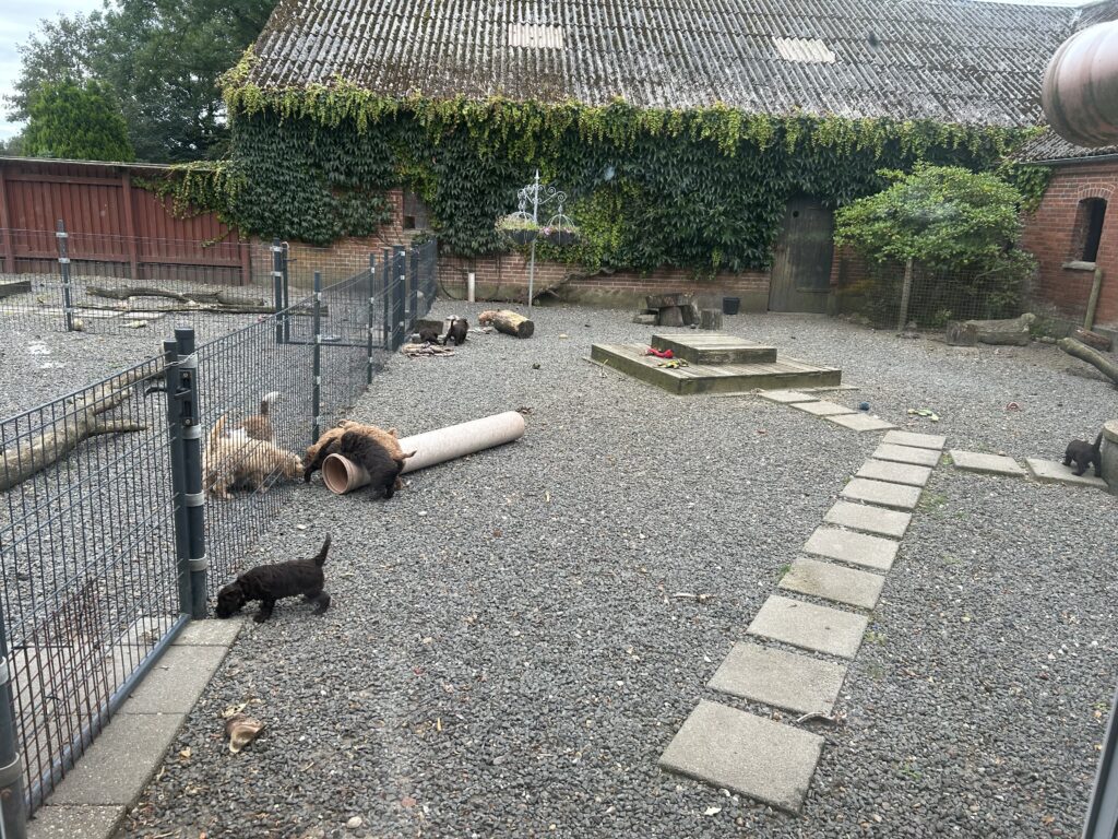 Hvalpene er så fremmelige at de allerede nu er klar til at få nye udfordringer i livet. Så i dag er Jessie og Junes hvalpe flyttet i et nyt rum med adgang til en stor del af gårdspladsen 24/7. Nu er der mulighed for at få nye oplevelser og for at løbe rund og bruge både krop og hoved. Når hvalpe får mulighed for at gå udendørs for at besørge i så tideligt en alder, så vil de være 99% renlige når de er 8 uger.