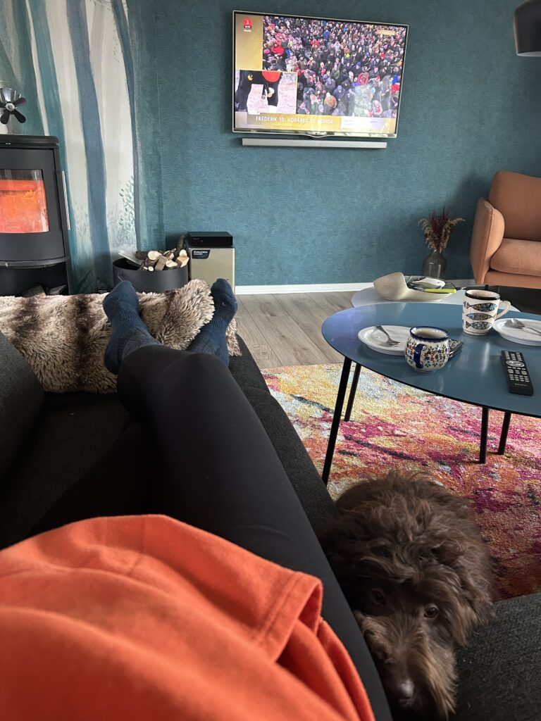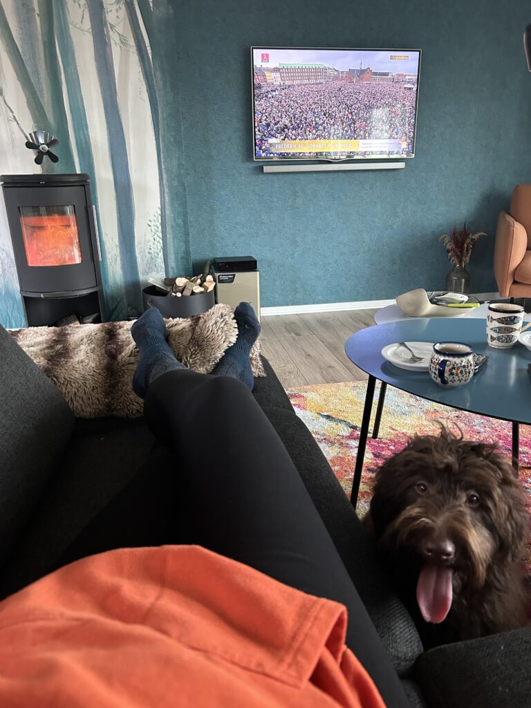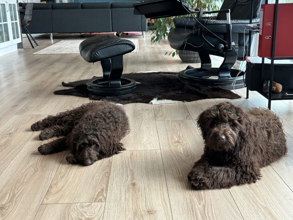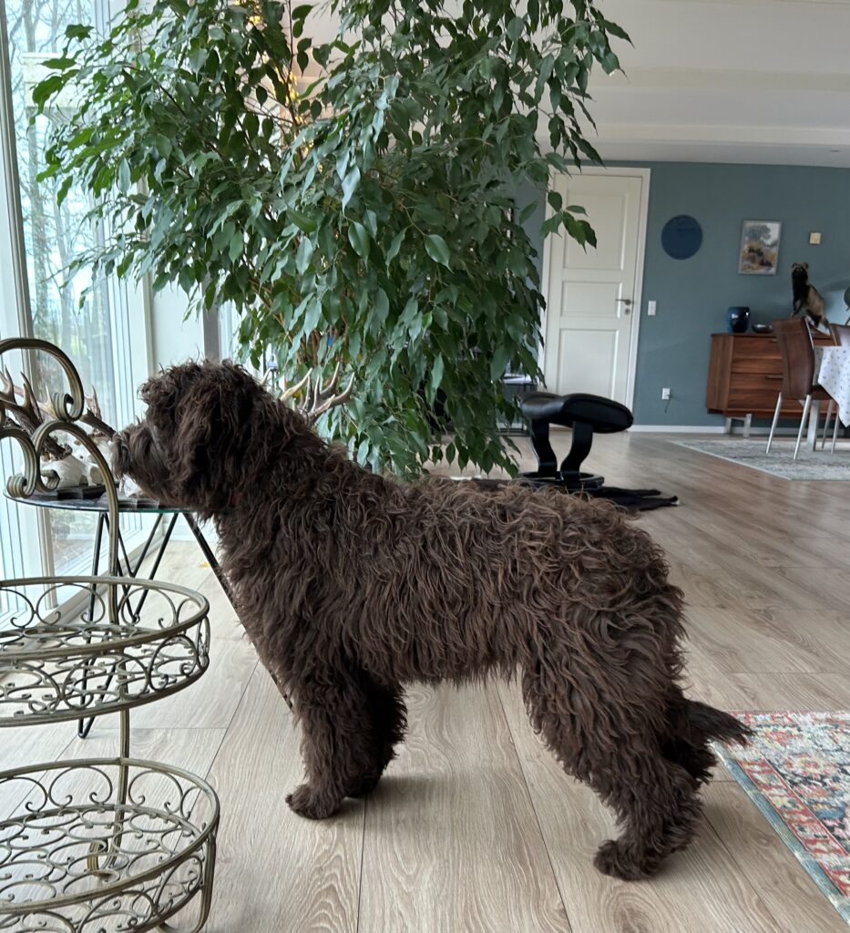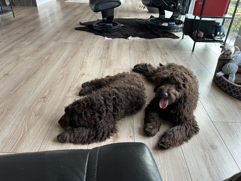 Her er en video hvor “Gul” og en større doodle på 58 cm i ryghøjde, hjælper mig med at støvsuge.