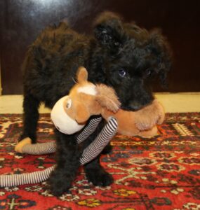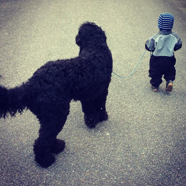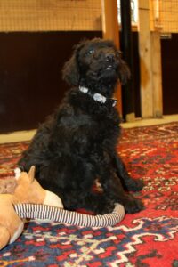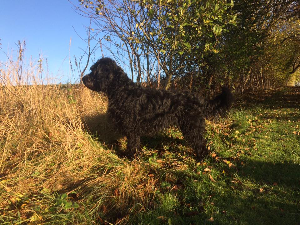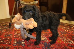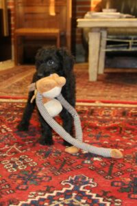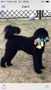 Jeg har lavet nogle billeder af den lille frække fyr. Han er super legesyg og frisk og ønsker en kvik familier der gider udfordre han hver eneste dag, med masser af leg og sjove mentale øvelser og udfordringer ude i den store verden. Han er imødekommende, kærlig og elsker da også at blive nusset på maven. Han har mod på livet og altså ret modig af sådan en lille fyr at være. Mon ikke han bliver mindre end hans søskende, så måske 50-55 cm og 18-20 kg…jeg gætter bare 😉 Han pels virker let, så vi forventer at hans pels kræve mindre pelspleje end en gennemsnitlig doodle. Han har sorte øjne, selvom de ser blålige ud på billeder.