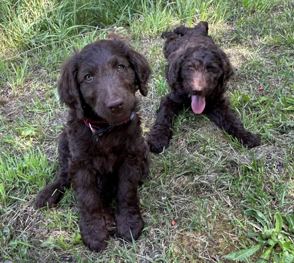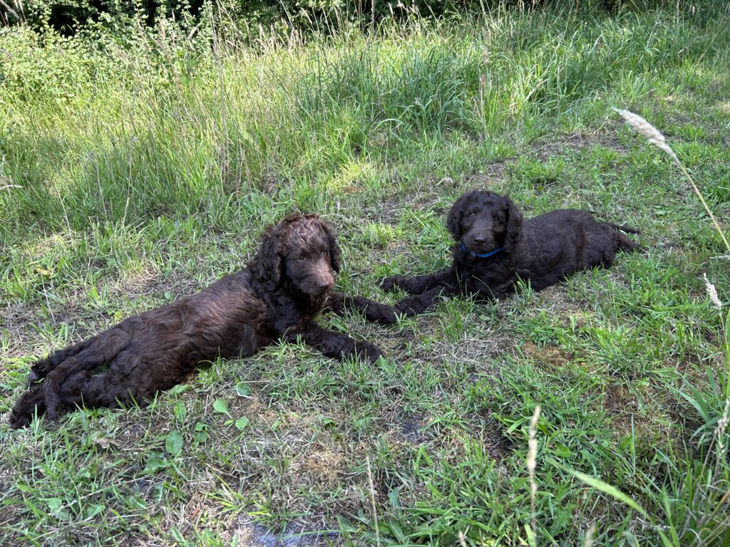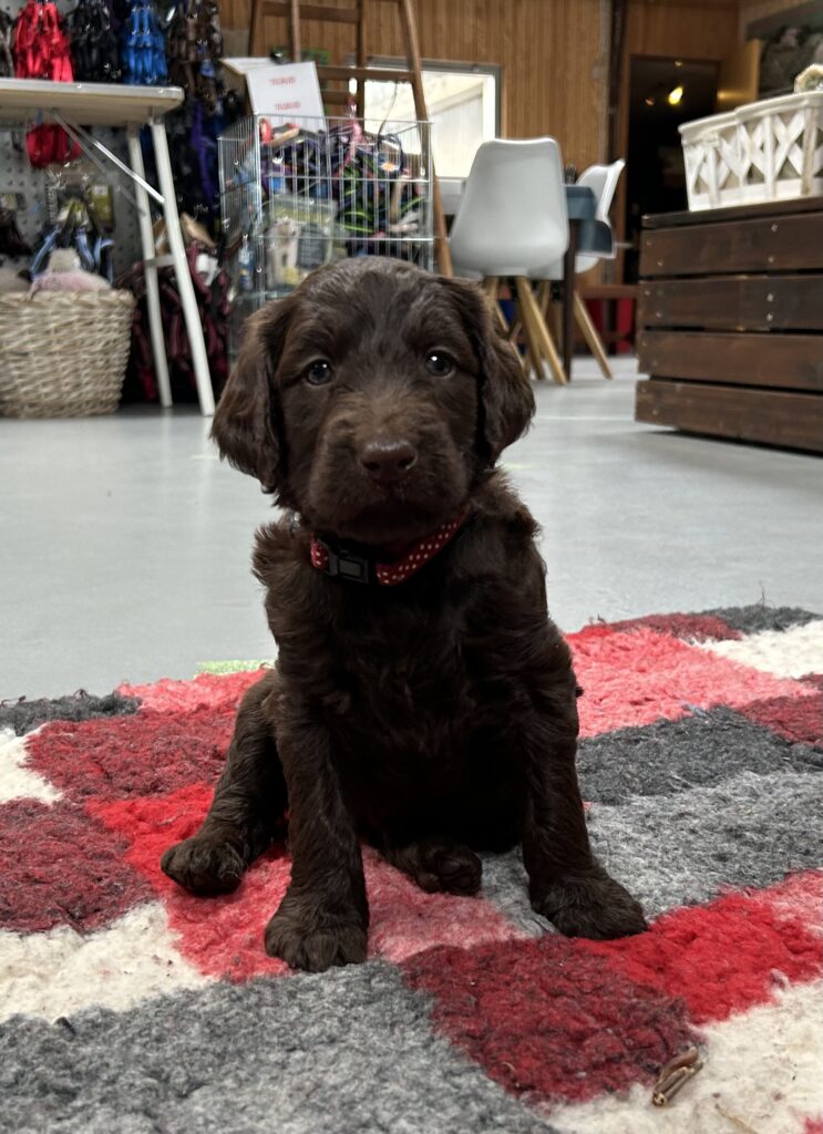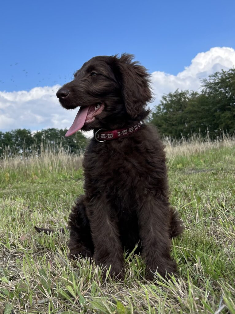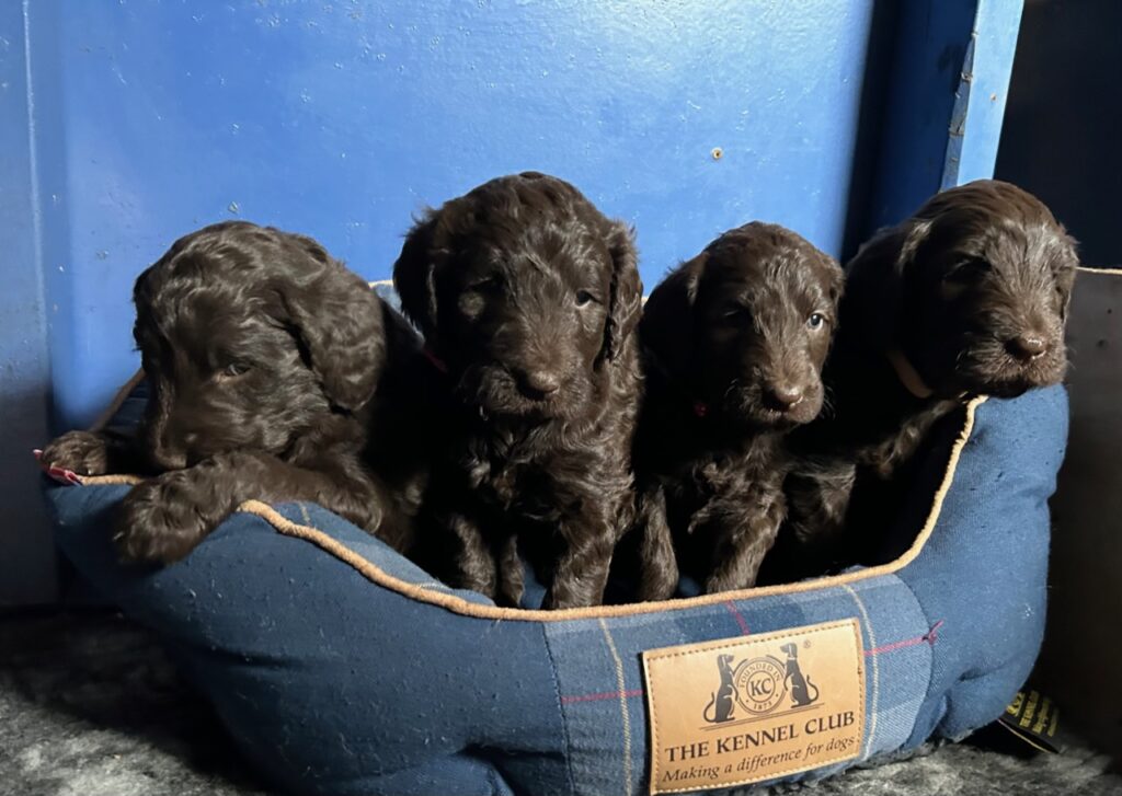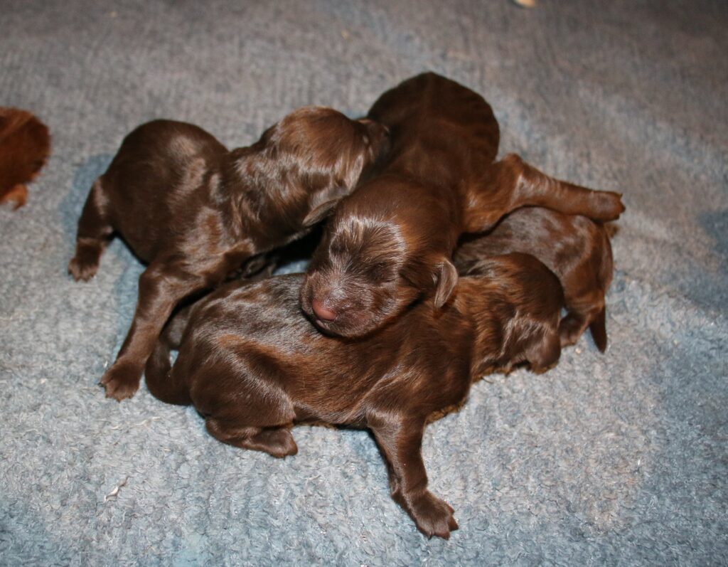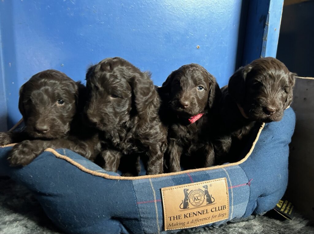 Vores store brune Flatcoated Retriever Queen og vores store brune Puddel Hefaruck har fået 4 hvalpe.