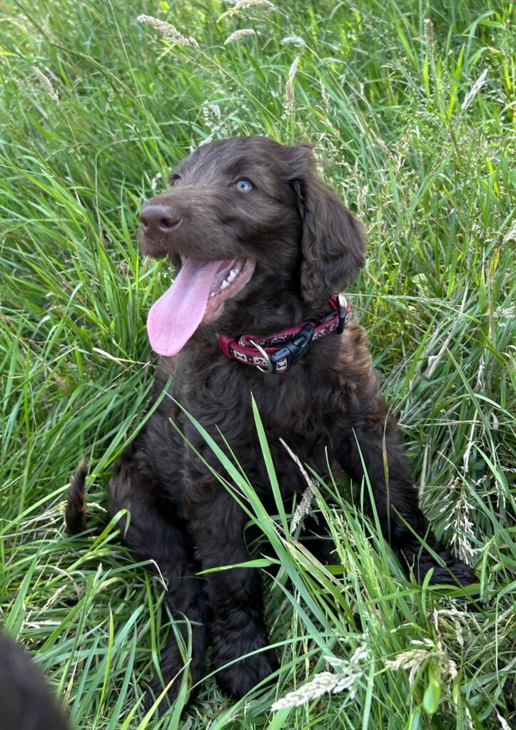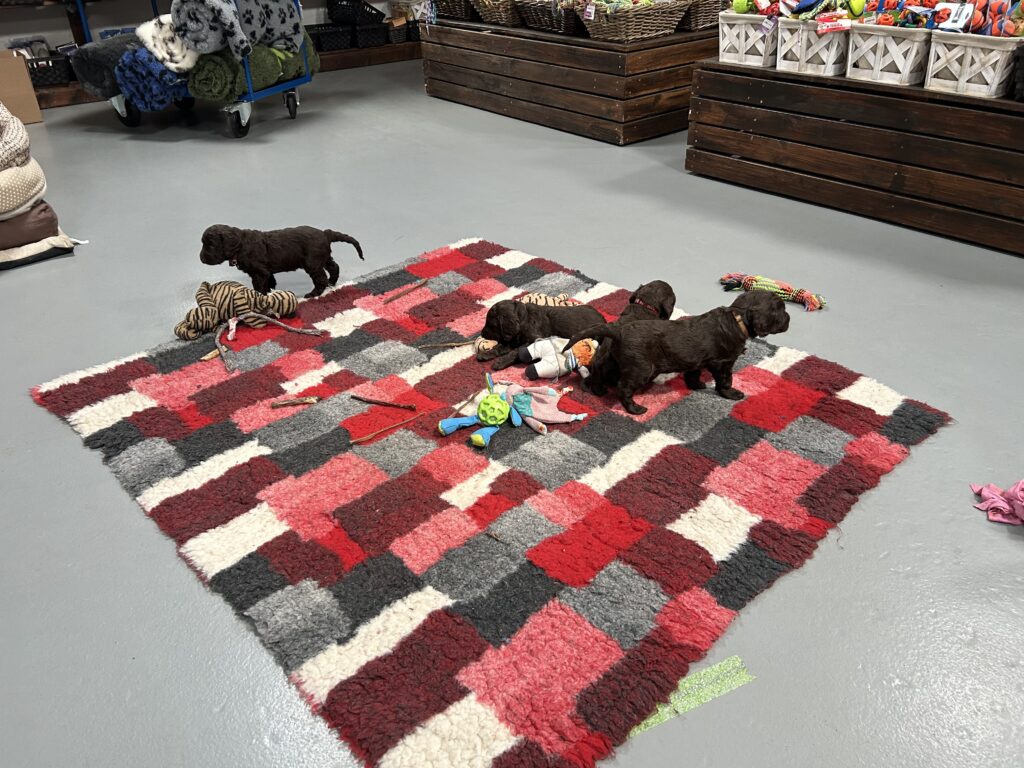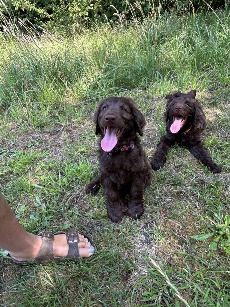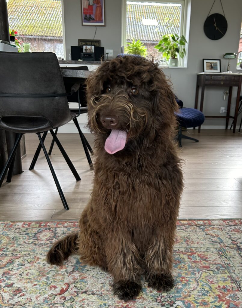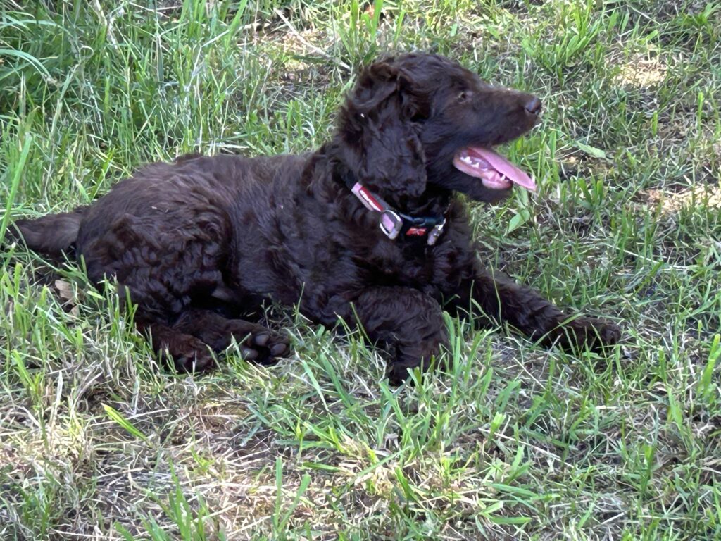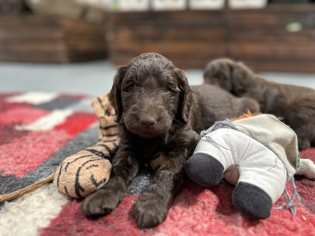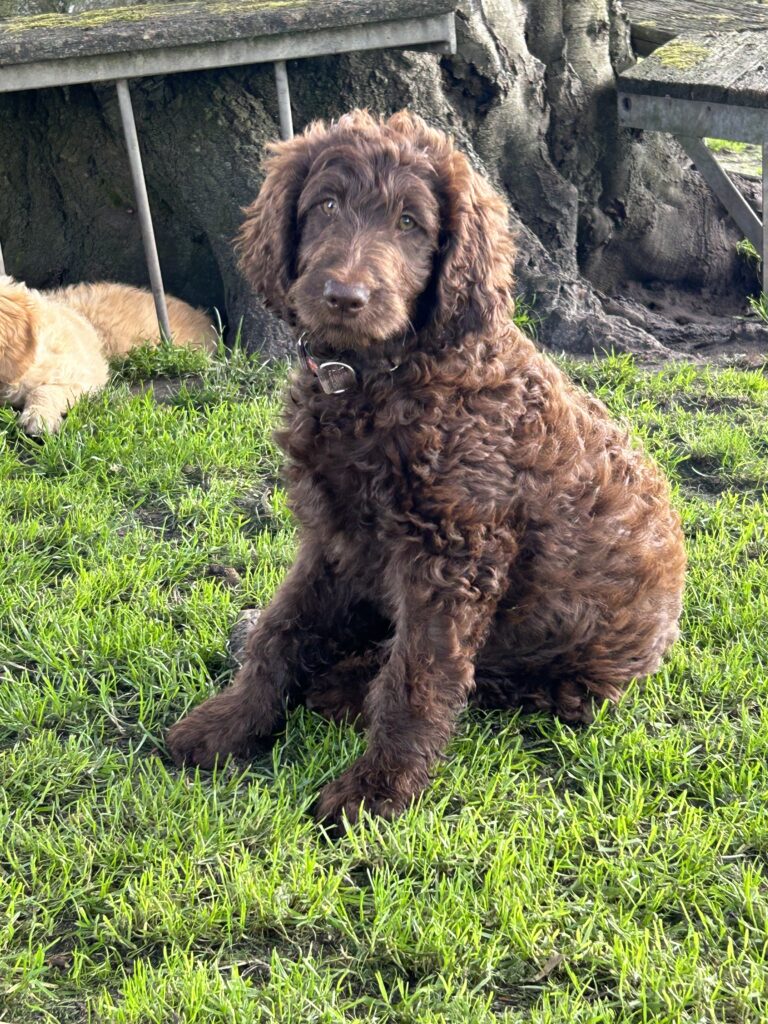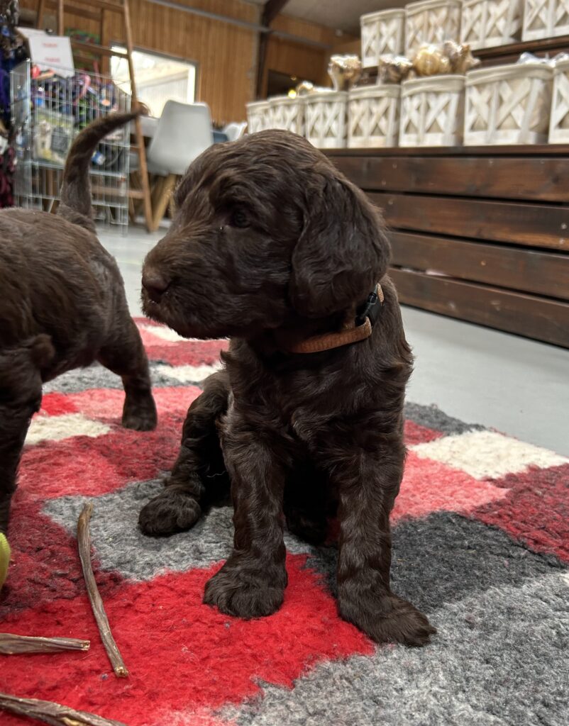 Vores store brune Flatcoated Retriever Queen og vores store brune Puddel Hefaruck har fået 4 hvalpe.