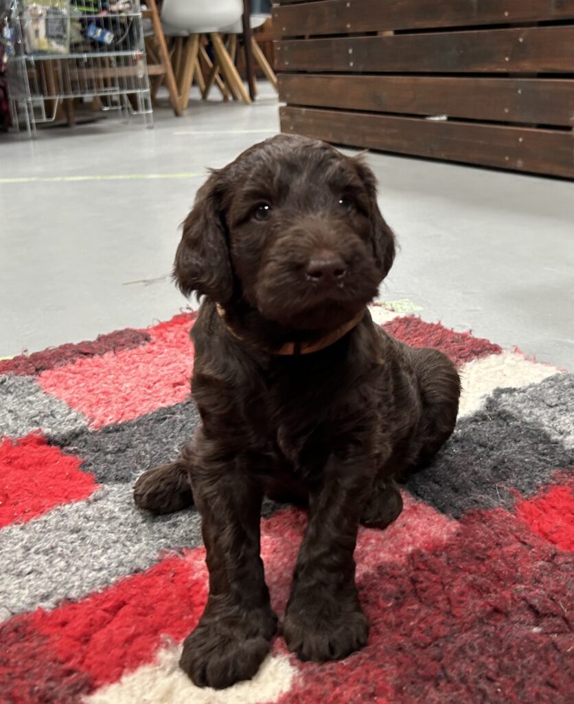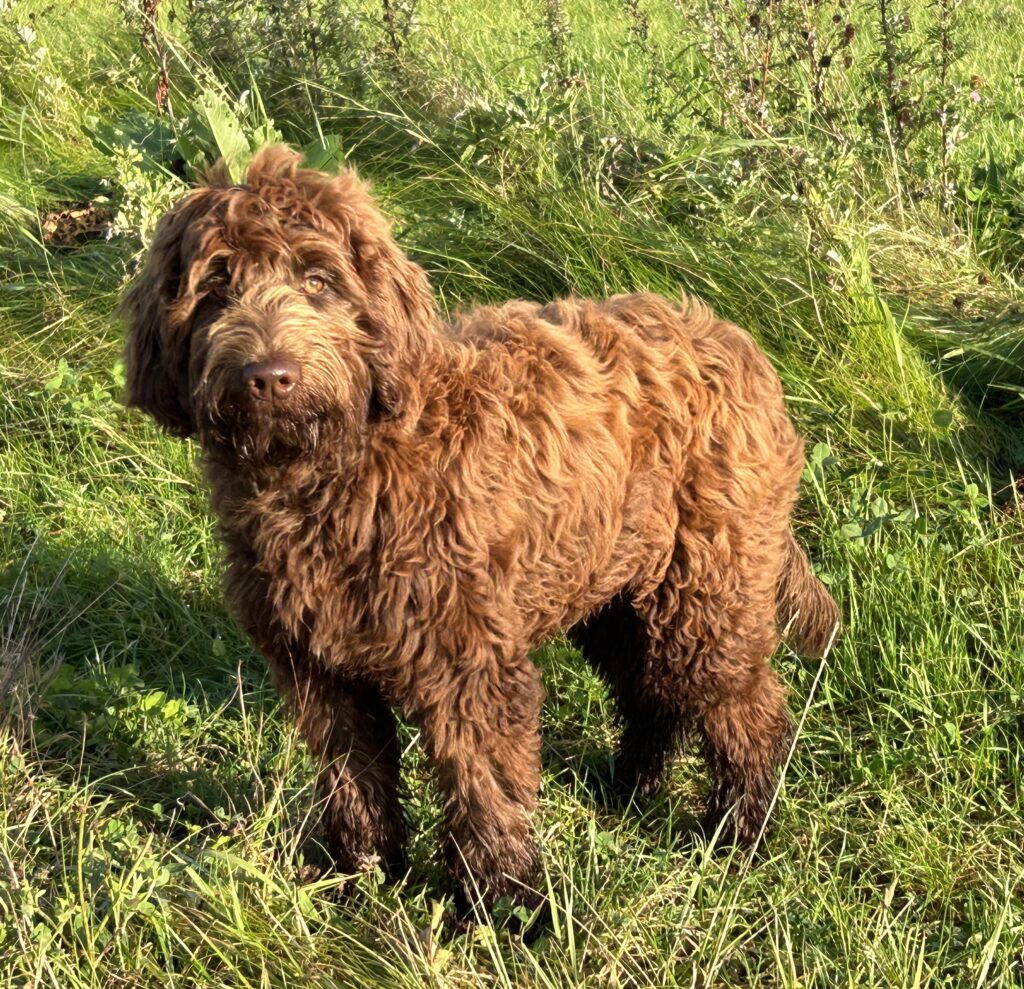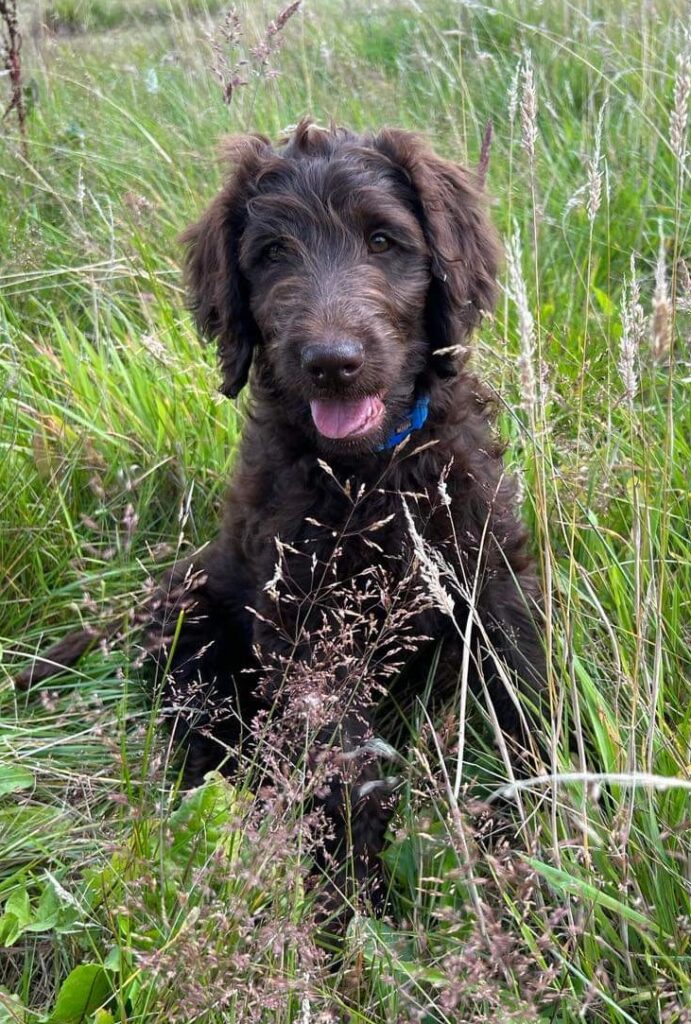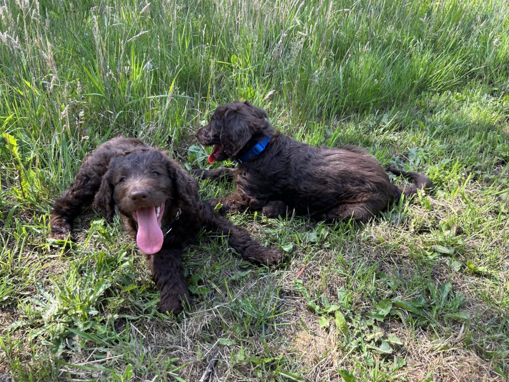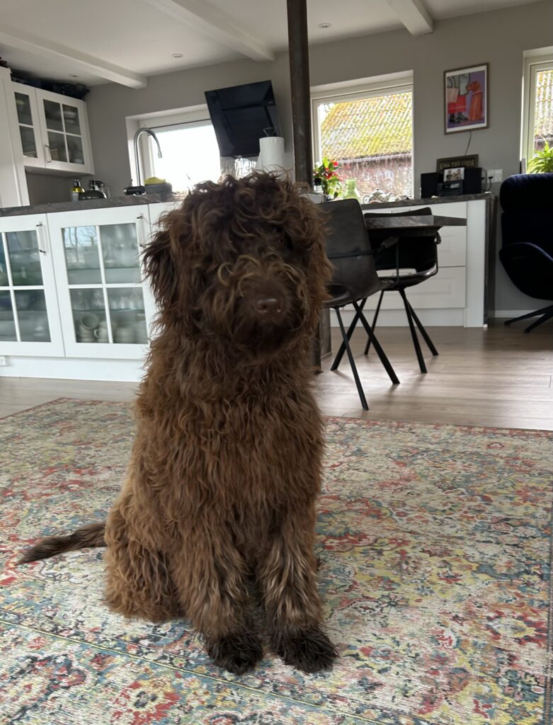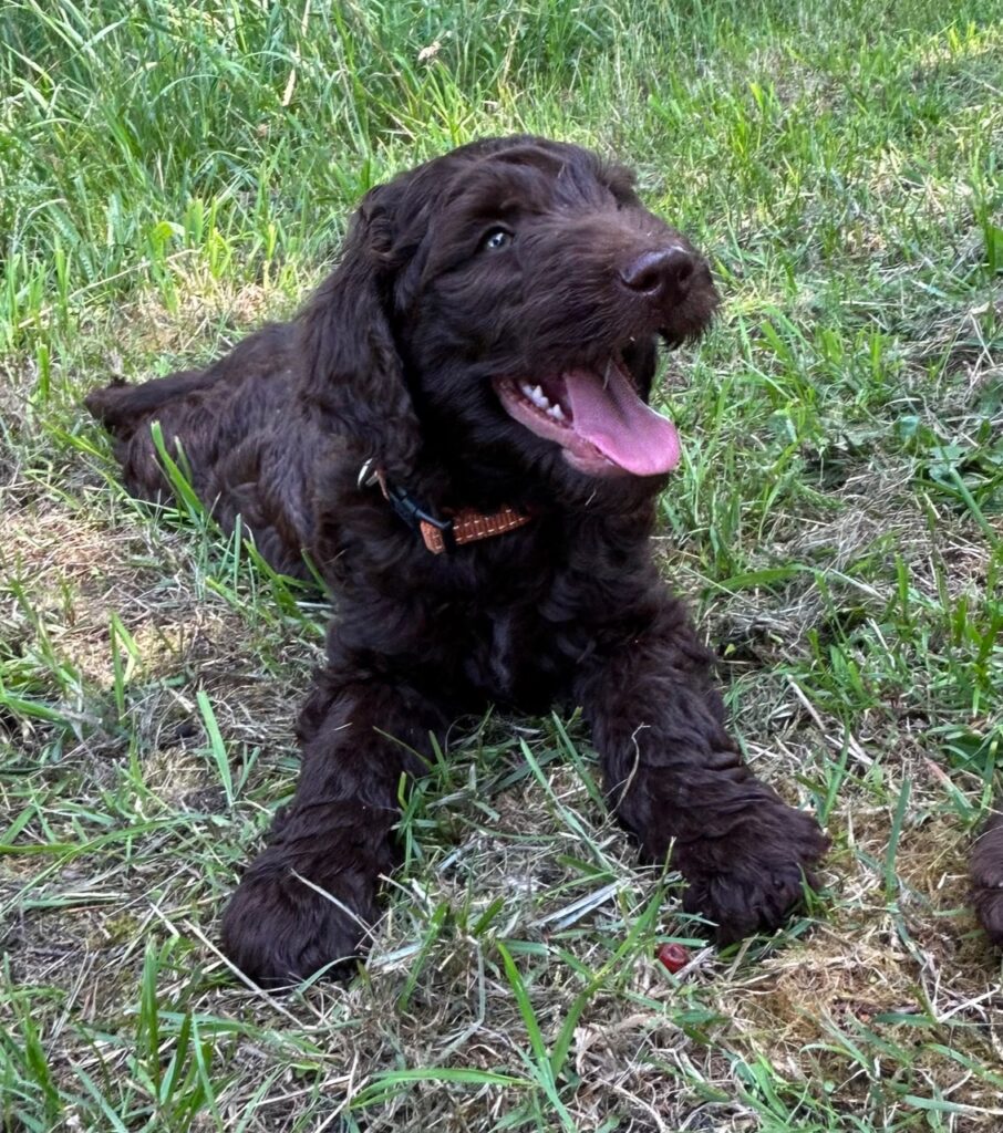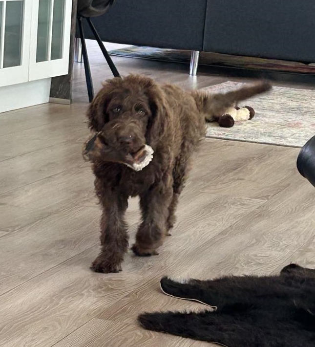 Vores store brune Flatcoated Retriever Queen og vores store brune Puddel Hefaruck har fået 4 hvalpe.