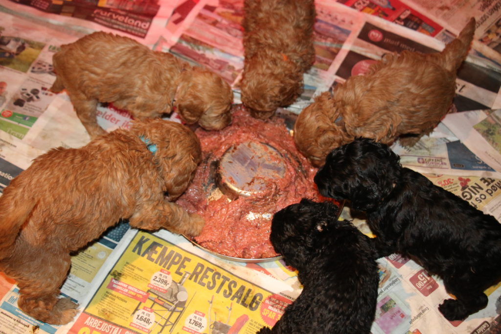 Hvalpene tager for sig af retterne…BARF, det er hvad de spiser hos os. Barf er råt kød, tilsat extra vitaminer/mineraler og fiskeolie, her er det vist kylling fars. Det er hunde/ulves naturlige kost og de elsker det. Så derfor har vi sunde og stærke hvalpe.