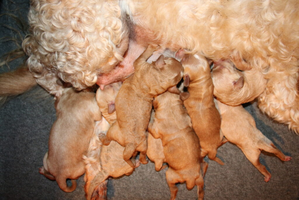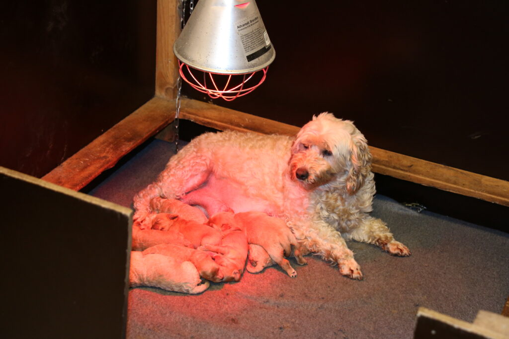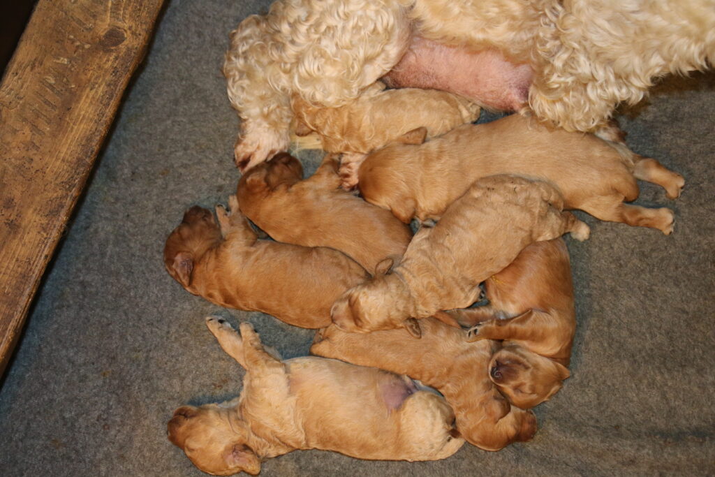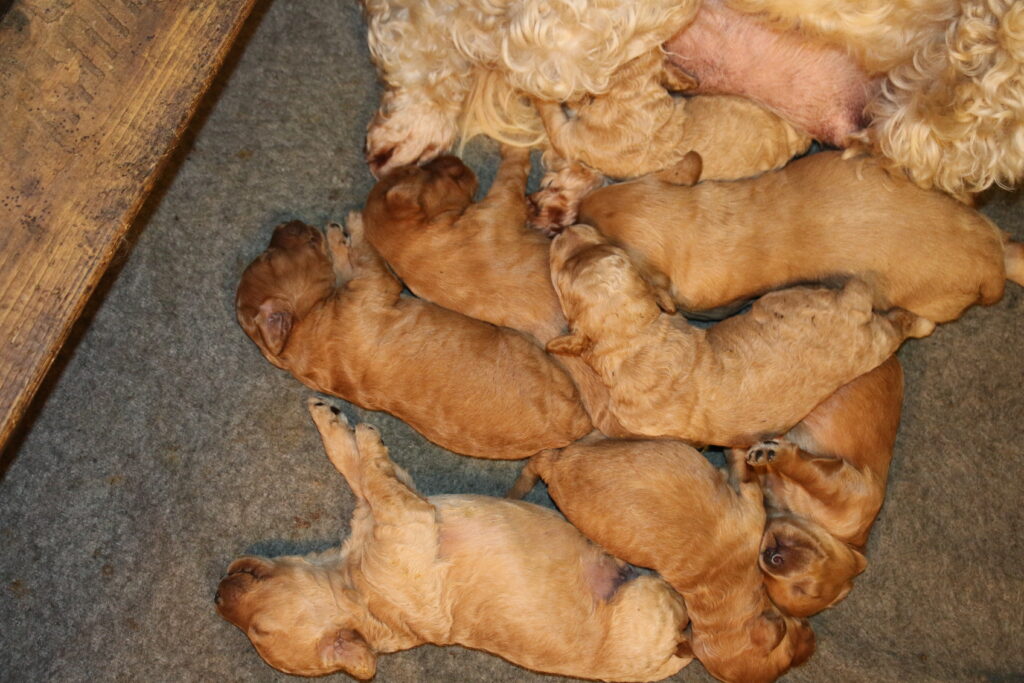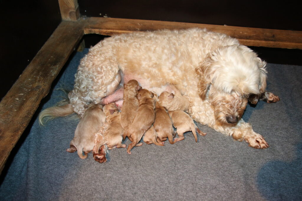 Vores mini/mellem Goldendoodle F1 London har fået hvalpe med vores lille Cavapoo F1 Soul.