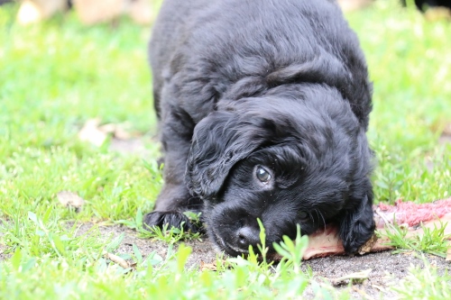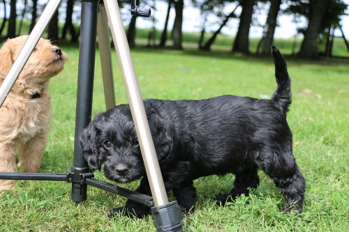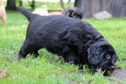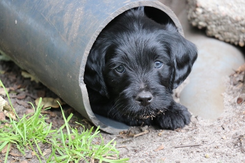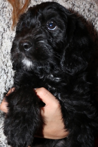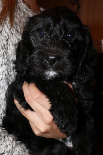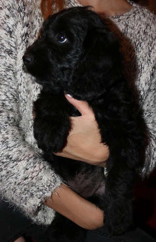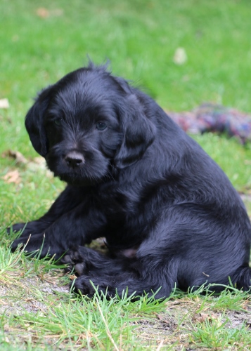Kastreret han med blå halsbånd SOLGT. Sort pels, bliver nok ret langhåret med rimelig glat pels i let/mellem tykkelse. Forventer han bliver en klippehund.