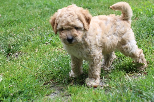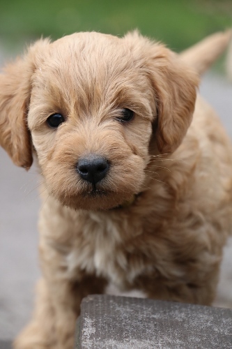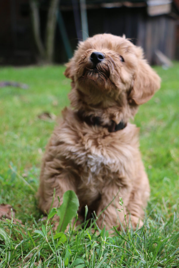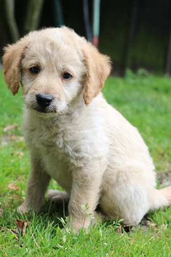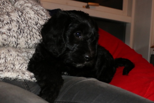 Her er far Cardiff, han ligner en Goldendoodle i pelsen. Her er han ca 7 mdr og i sin hvalpe/unghunde pels. Jeg forventer han får ca 30 cm lang pels som fuldvoksen, men den skal løbende redes fri for død hår og bliver nok klippet noget kortere indimellem.