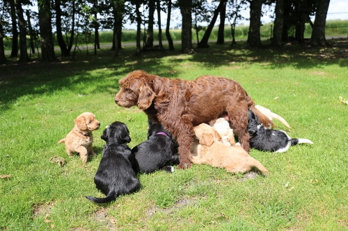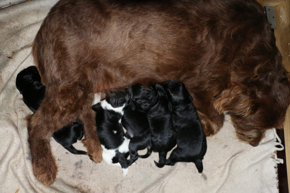 Så har vores brune mini/mellem Labradoodle F1 “Riga” fået hendes første kuld hvalpe med vores unge gyldne mellem Welshdoodle F1 “Cardiff”.