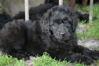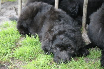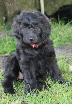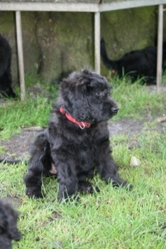 Han bliver en STOR dreng på ca 35 kg eller mere og en højde på ca 60-65 cm i skulder højde. Han er sort med laaaangt blødt hår.