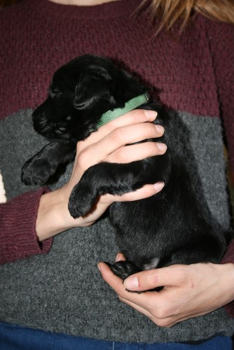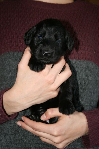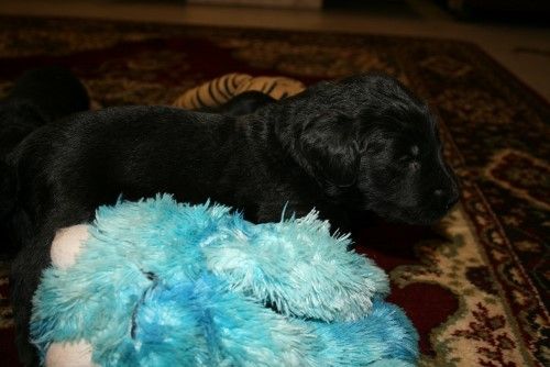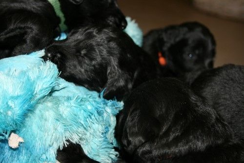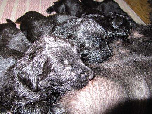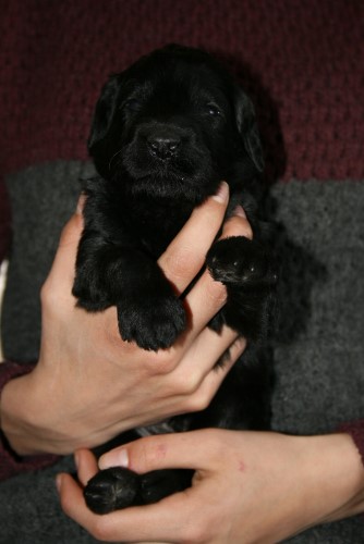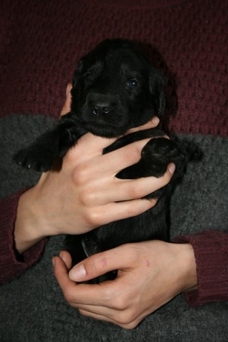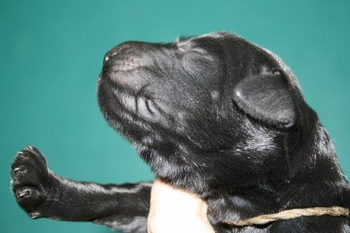 Hvalpene har nu fået øjne og ørene er ved at åbne sig. De kan endnu ikke rigtig se og høre noget, det tager faktisk ca 4-5 uger inden de ser bare sådan nogen lunde godt. De kan godt komme op på benene gå tage nogle hurtige skridt, men de gør det kun for at komme en til mor Fabia. De laver stadig ikke andet end at spise og sove 95% af tiden. Det er først omkring 4 ugers alderen de begynder at udforske deres omgivelser og os.