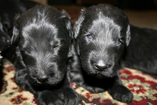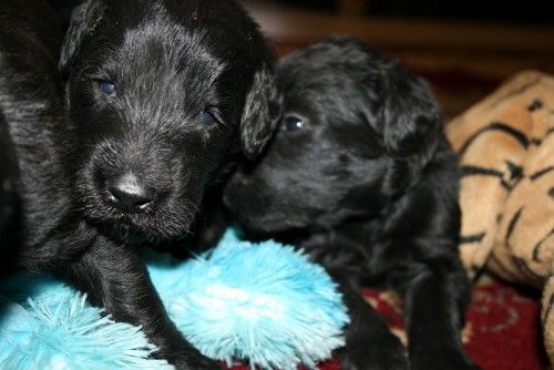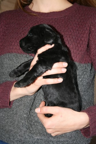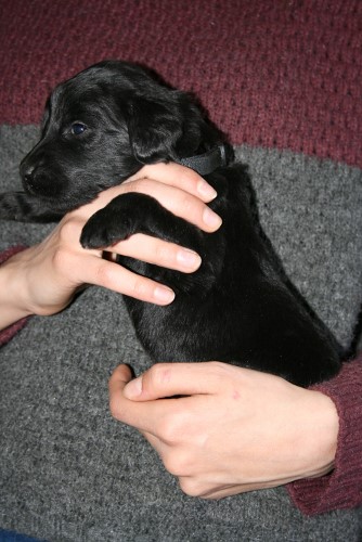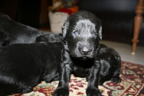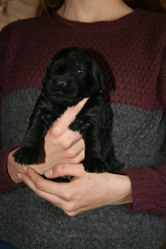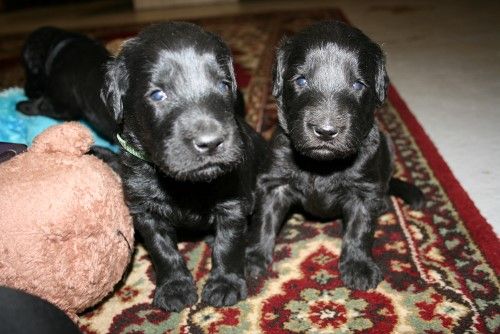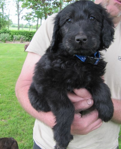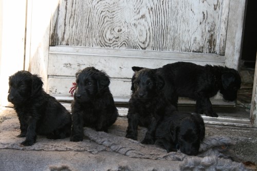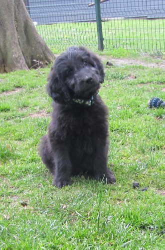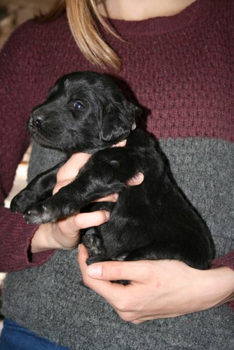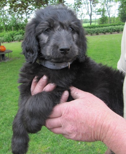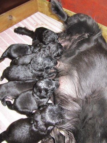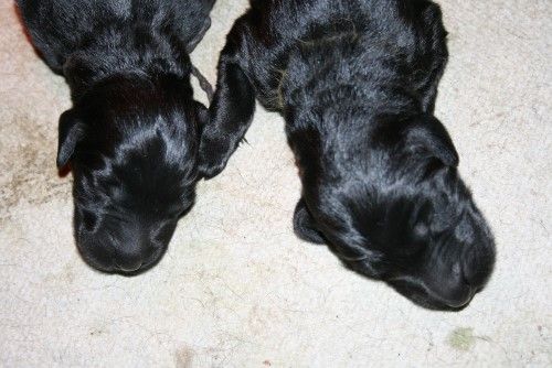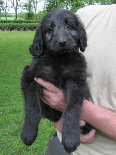 Moren er vores sorte Flatcoated Retriever Fabia og faren er vores hvide Konge Pudel Curtis.