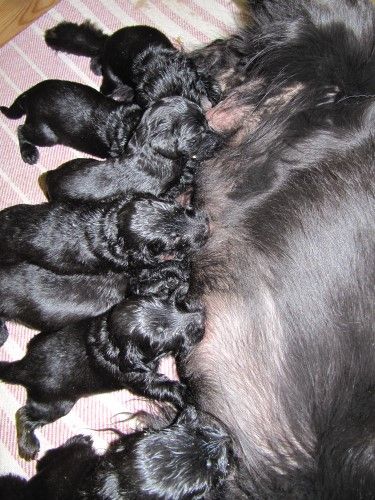 Kl 15.55 så kom den først hvalp og kl 03.30 var de alle ude, der var 10 hvalpe i Fabia, men kun de 8 levede, 4 hanner og 4 tæver.