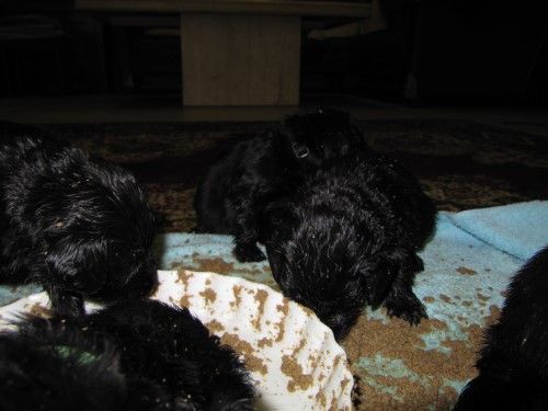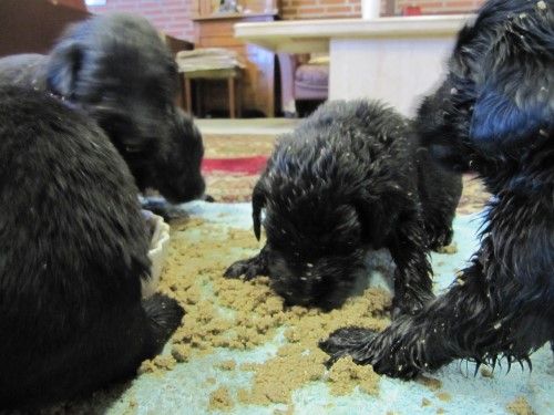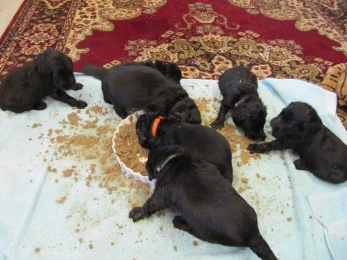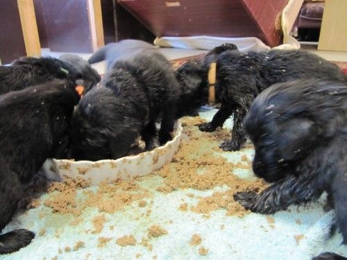 Hvalpene er flyttet, de er kommet ind i hvalpe rummet. De er begyndt at få lidt opblødt tørkost mums 🙂 Det går dog ikke så godt med at spise noget endnu, da tungen tror den skal drikke/suge, men de skal nok få det lært.