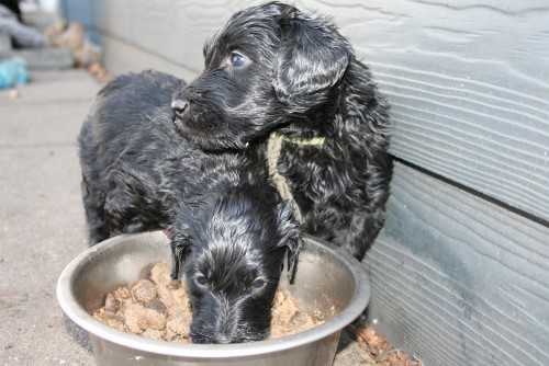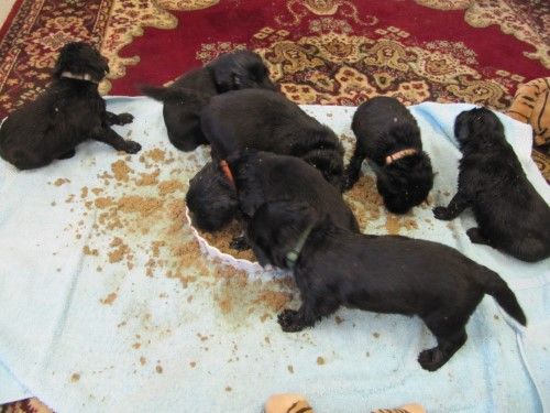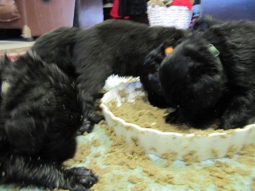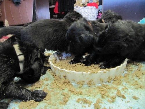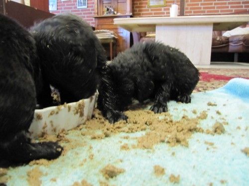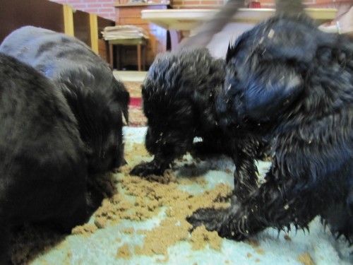 De er stadig meget blanke, noget indsmurte i fiske olie, selv om vi er begyndt at fodre dem i en såkaldt hvalpebar, hvor hver hvalpe har deres egen skål, så er der ikke så meget skubberi og joggen i maden. På billedet her under snupper de lige lidt ag Fabias mad.