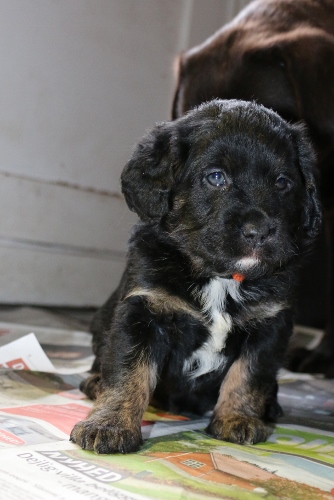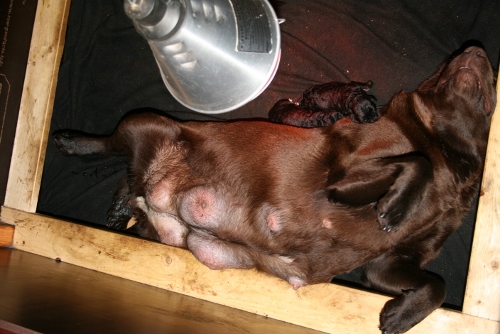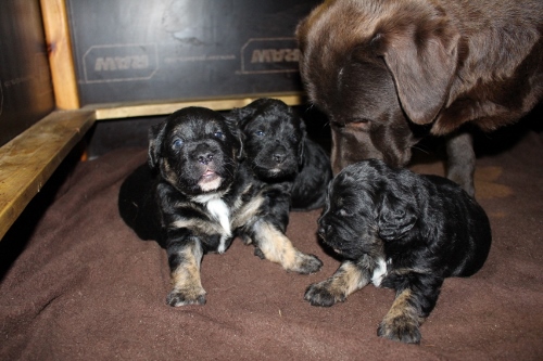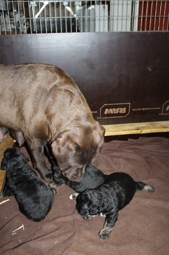 Vores brune Labrador og vores harlekin farvet (sort/hvid) har fået hvalpe sammen for første gang.