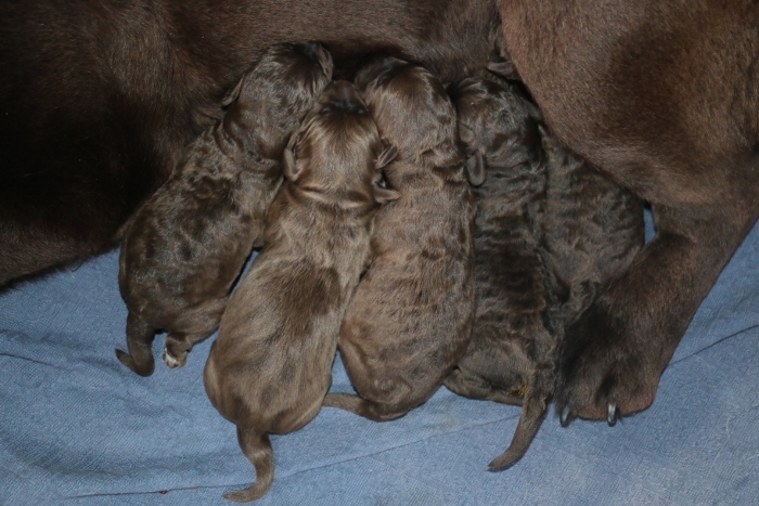 Så nu har hun 5 levende hvalpe, 4 tæver og en han…alle brune.