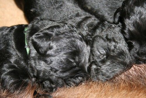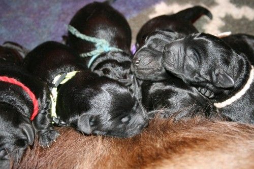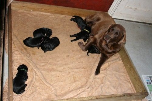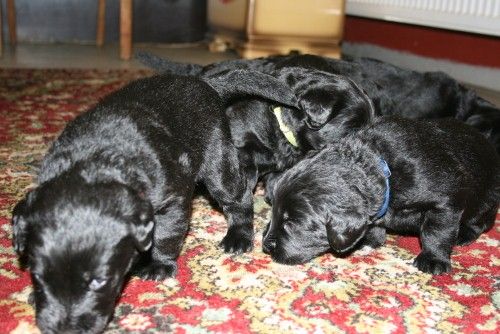 Nu er hvalpene ca 3,5 uge gamle og de er da begyndt at blive til rigtige små hunde 😉 De er begyndt at komme lidt rundt, de bruger dog stadig mest til på at sove endnu. Men fra nu af går det hurtigt fremad, verden skal udforskes og alt skal smages på. De er begyndt at få lidt opblødt tørkost og appetitten har de vist arvet fra Labradoren 😉