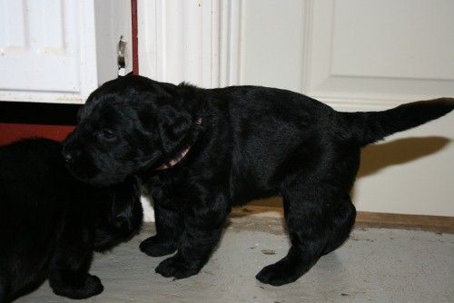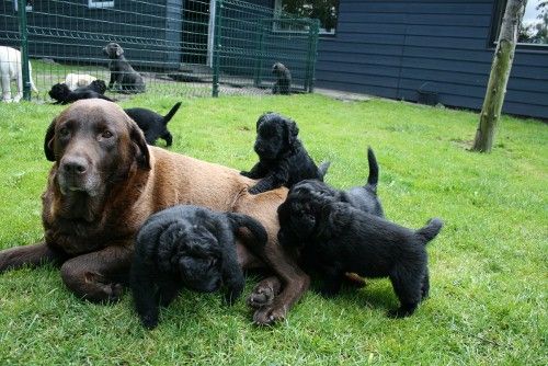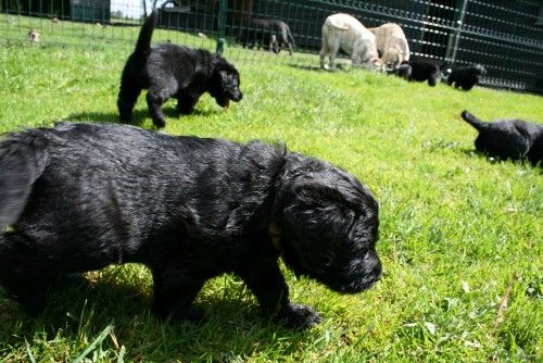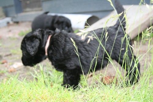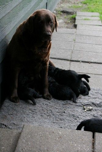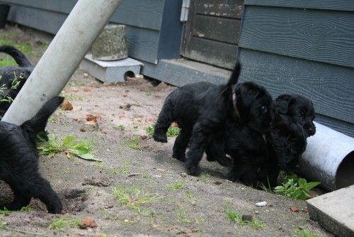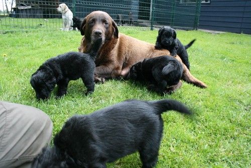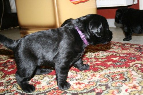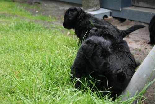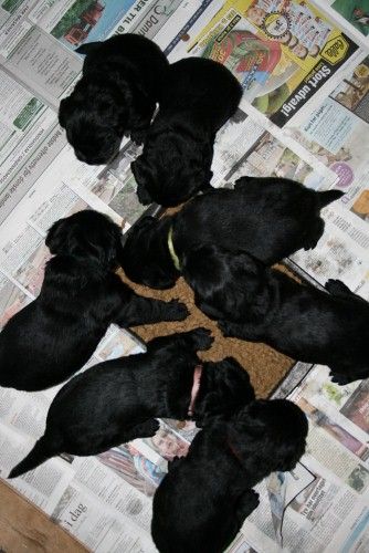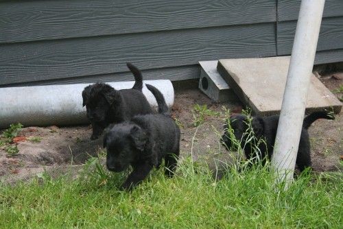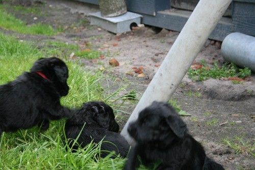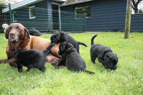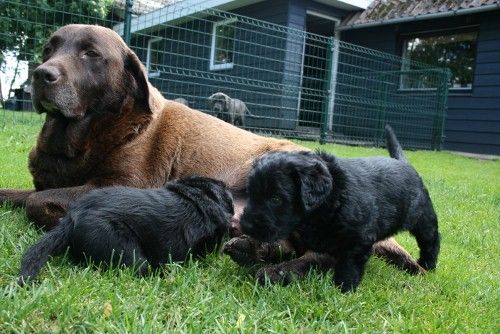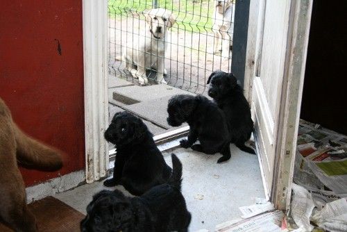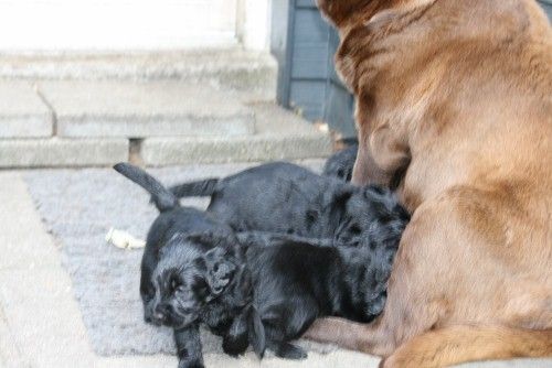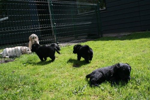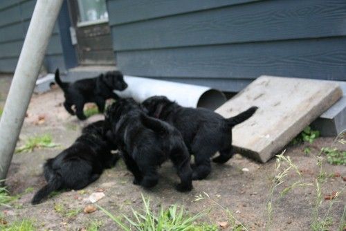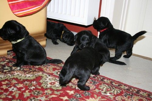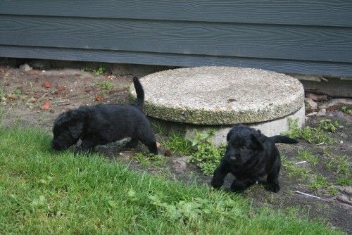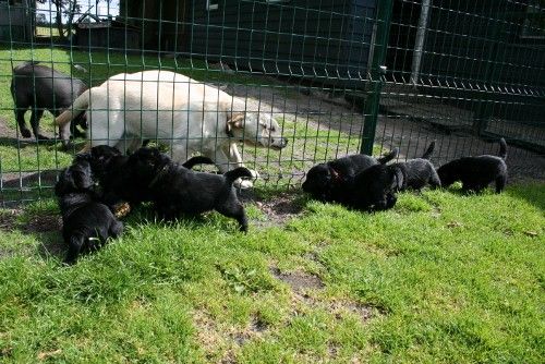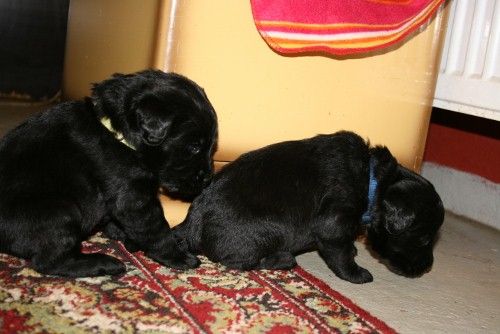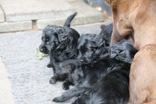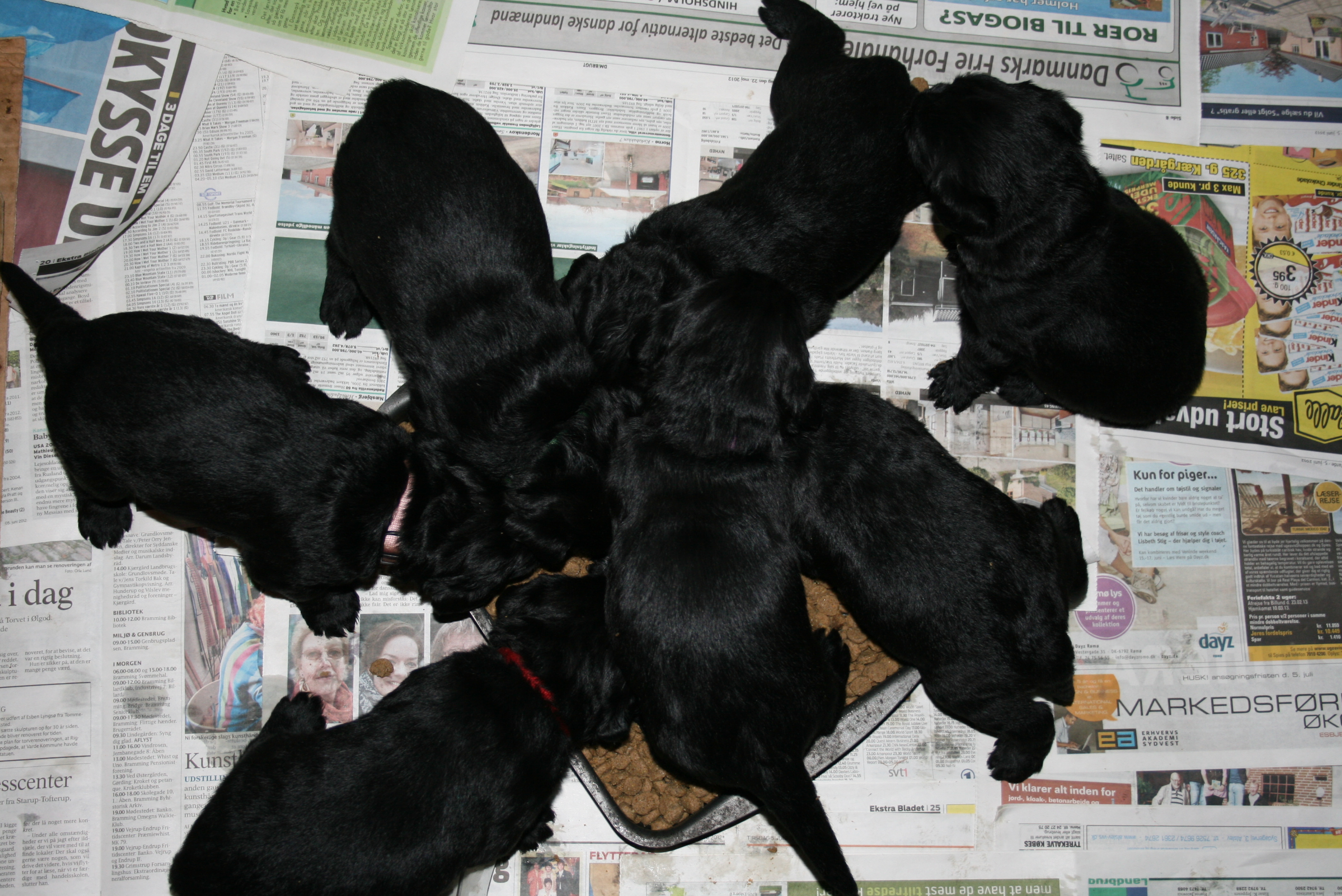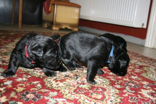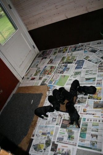 Hvalpene har det alle godt, de prøver at spise os ud af huset. De har også prøvet at få kødben, rå okseben, de suttede nu mest på det da de ikke rigtig har fået effektive tæver endnu. I dag var de så udenfor for første gang, de går endnu ikke mere end et par meter frem og tilbage, men de ser også rigtig dårligt endnu. De kunne kysse og se lidt på de store labrador hvalpe der gik bag hegnet, spænnende 😉 Se flere billeder nederst på siden…