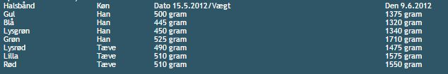 Hvalpene er 8 uger den 10.7.2012 og vi udlevere hvalpene fredag den 13.7.2012. Mødetid kl 11.00 + 4 timers undervisning, afrejse ca kl.15-16.00. Hvalpen klart til at være alene fra om mandagen, vi informere jer om hvordan “alene-træningen” forgår når vi underviser jer i forbindelse med afhentningen af hvalpene. Vi underviser i div. vedr hvalpen og dens opdragelse/opvækst. Vi har ikke mindre børn med ved afhentninger pga undervisningens varighed. Husk at få læst det tilsendte matriale inden afhentning (Mail). Afhentning/undervisning på andre dage koster kr. 1.500,- extra.