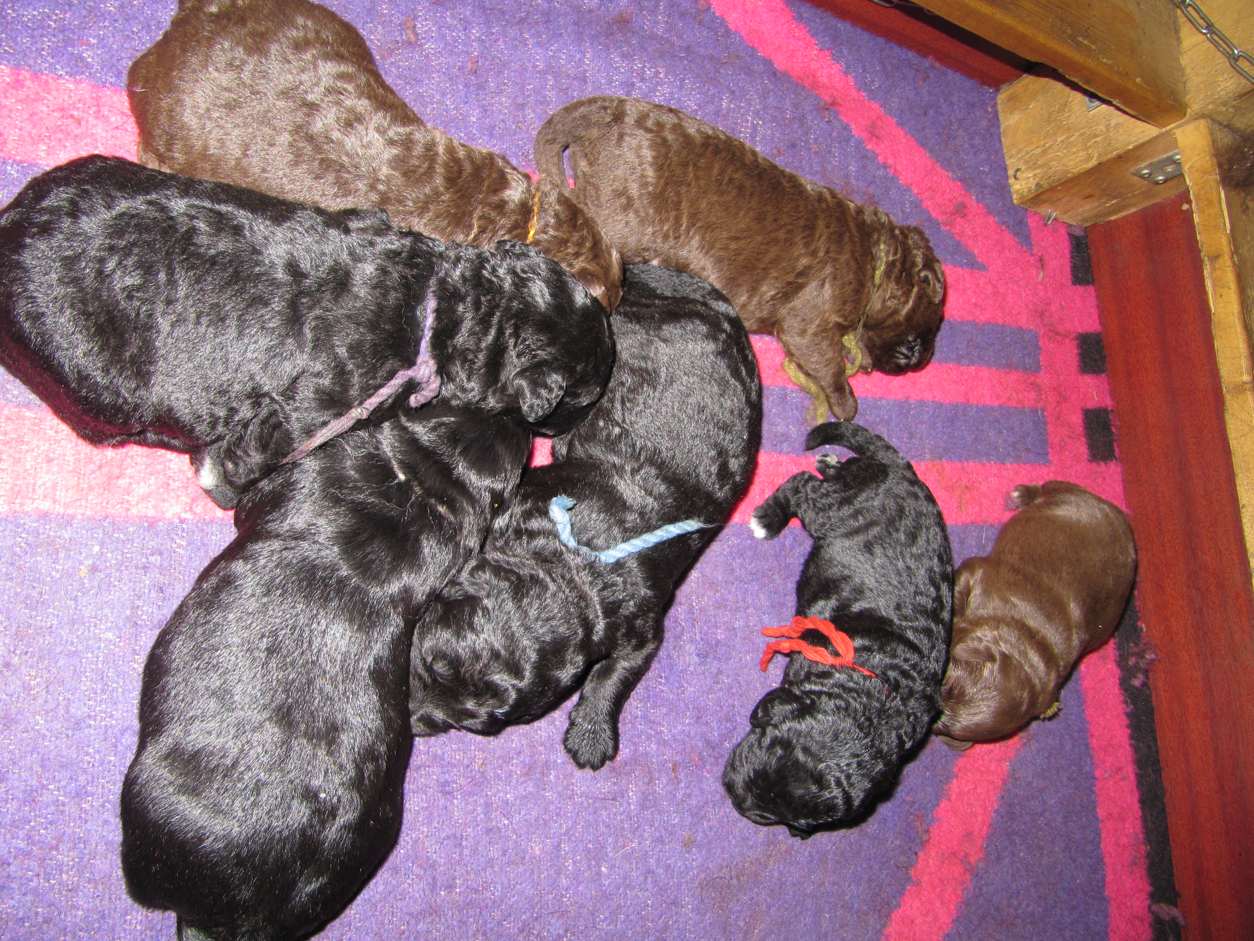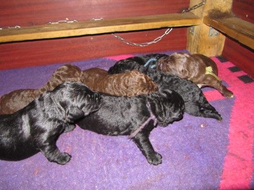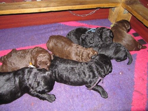 En brun tæve, 2 brune hanner. En sort tæve og 3 sorte hanner.