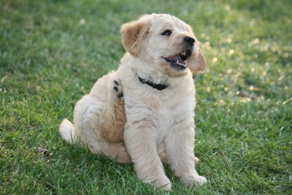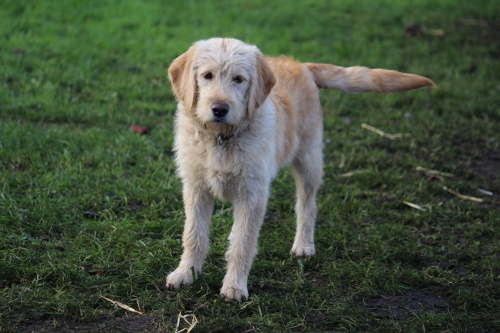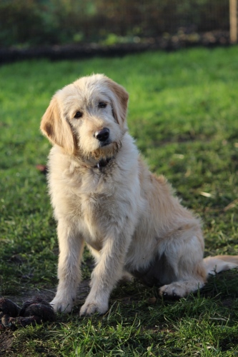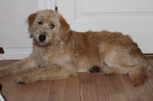 “Sort med røde hjerter” Hun er nu 5,5 mdr og er ca 40 cm i ryghøjde og vejer 13,5 kg. Mon ikke hun bliver ca 45-47 cm og kommer til at veje ca 16-18 kg.Hun har endnu ikke skiftet pels. Vi har altså endnu ikke kunnet trimme hende/trække pelsen af. Det er ellers her omkring 5-6 mdr alderen at de normalt senest smider den første pels. Men måske skal hun bare slet ikke trimmes, men børstet og redes med kammen og så klippes med en maskine når pelsen bliver for lang, altså som man normalt gør på en Goldendoodle F1. Fremtiden må vise hvilken pelstype hun får 😉 |