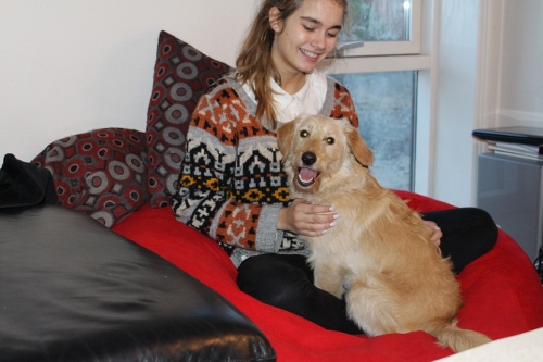 Køreturen hjem til Århus klarede Villa helt uden problemer -hun lagde sig hurtigt til at sove ved mine fødder. Hun indtog sit nye hjem (have og køkken) med nysgerrighed og gå-på-mod. Hun møder nye mennesker og børn stille og roligt, og mange kan slet ikke forstå, at hun er en lille hvalp.