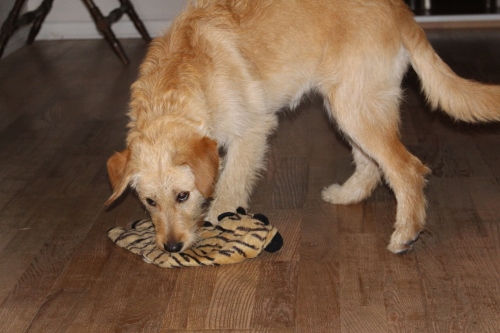 Vi arbejder fortsat videre med at give Villa nye billeder hver dag, mental-træne og kommando-træne. Hun er super til at gå i snor i haven -også med forstyrrelser af hund i baghaven, kaniner, legetøj, løbende børn mm. Uden for matriklen -er der stadig mange nye billed-indtryk, men det går også rigtigt fint med snor på. Hun kender sit navn, er fantastisk til små indkald og sit, begge dele klarer hun også med løbende børn, fodboldspillere og “flyvende” legetøj -i haven. Der udover leger vi ex. gemme-lege, spor-lege og “gå på line”. Vi gemmer mad, pakker legetøj ind i håndklæder, laver toiletpapirsruller med godbidder i mm.