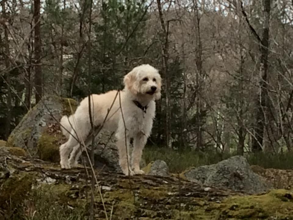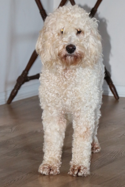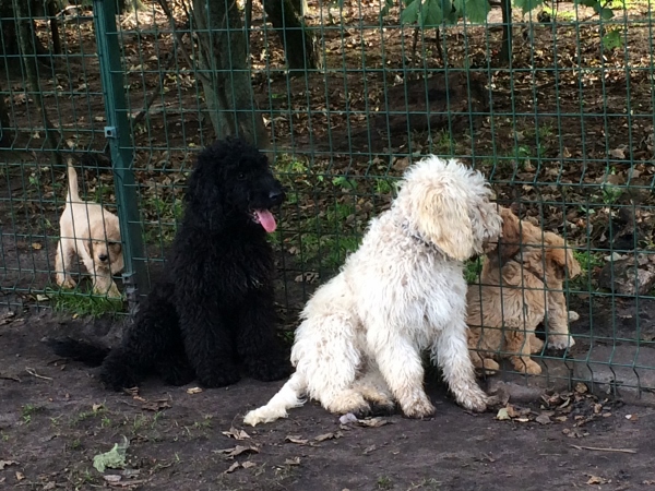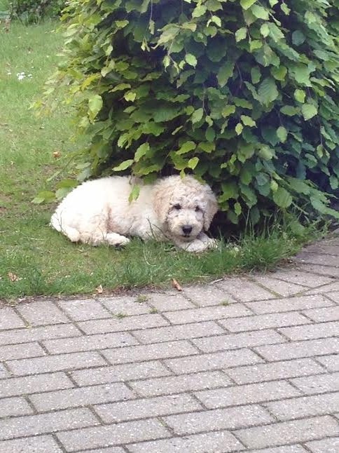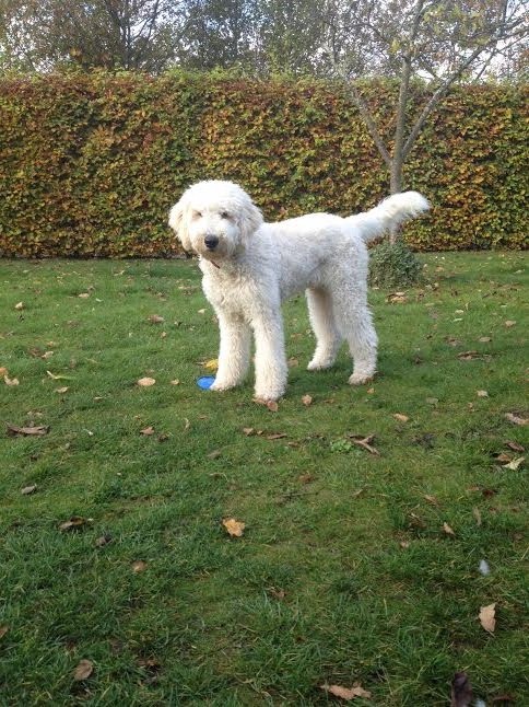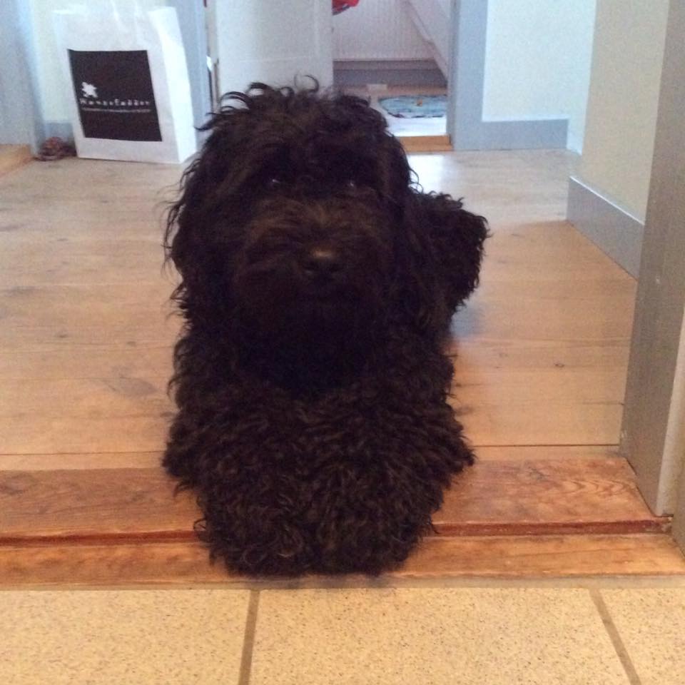 Jeg kontaktede Jeanette i sommeren 2014, vi havde fået at vide, at vores golden retriever Freja på 8 år, havde fået meget agressiv kræft i mælkekirtlerne og at hun nok ikke ville leve længe. Vi sørgede ca. 10 dage og jeg forslog så min mand, at vi skulle købe en ny hund, så hurtig som mulig, så Freja ville kunne nå at lære den nye hund alle hendes fantastiske, sjove, finurlige og dejlige tricks og væremåder, han var heldigvis med på ideen. Efter MANGE mails og samtaler med Jeanette faldt valget på Marley en F1B laberdoodle. Han var 4 måneder, da vi fik ham, han havde en skæv tand og var derfor ikke sat til salg, men den var nu ved at rette sig ud, så nu kunne han blive vores. Glæden var stor for vores familie (to store teenage drenge & en pige på 4), da vi kom hjem med vores lille “laberdoodle”. Første nat sov jeg i stuen med ham, natten gik fint og vi snork-boblede begge 2 – og hørte ikke en gang de store drenge komme hjem.